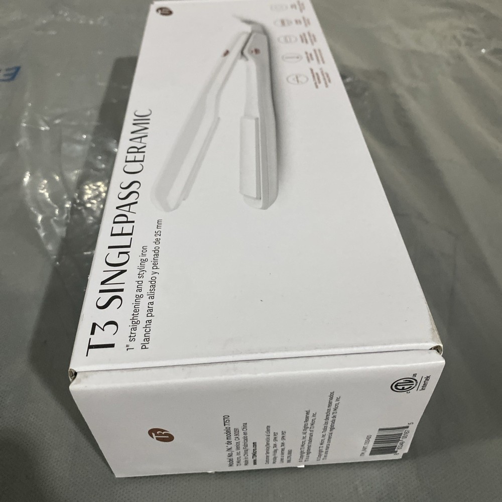 The T3 SinglePass 1" Flat Iron Straightener in White is a high-quality hair styling tool suitable for all hair types, including fine, normal, and damaged hair. This travel-size straightener uses ceramic material and ionic technology to provide smooth and sleek results. With a maximum temperature of 410 °F and adjustable heat settings, it offers personalized styling options. The sleek design, automatic shut-off, and indicator light make it a convenient and safe choice for unisex users. Additionally, the dual voltage and swivel cord ensure versatility and ease of use for a variety of hair styling needs.