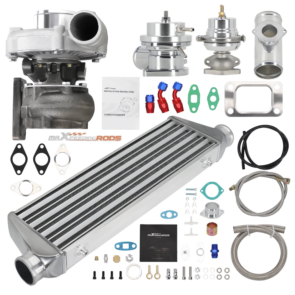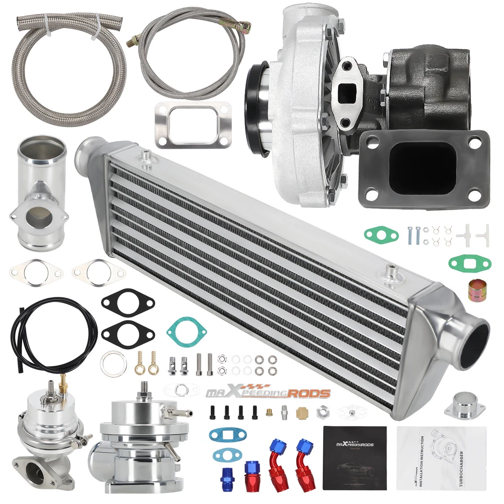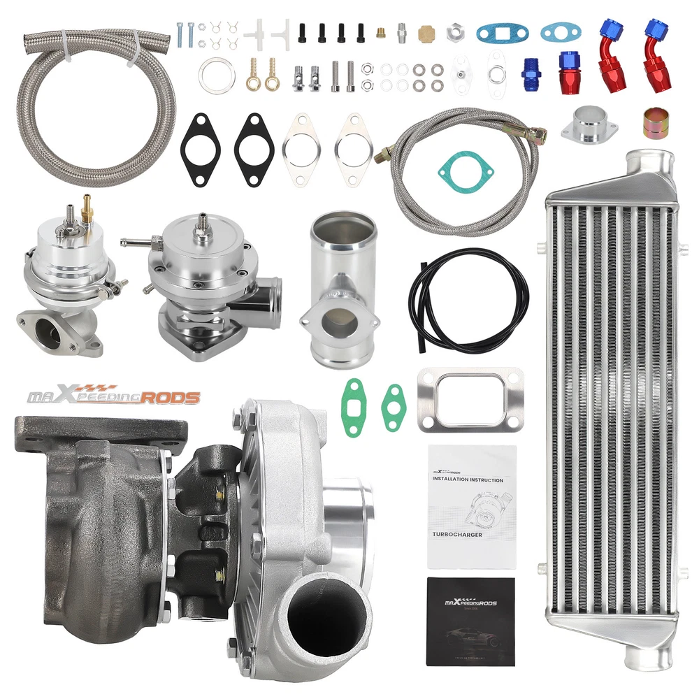 Application Universal Turbo Kit Perfect for 1.5L-3.0L engine, 4/6 cylinder This Kit Will be able to add 350+HP at 7.5-14.5 PSI. (You will need Turbo Manifold, Modification and other accessories to complete the Turbo Kit Project) *Notice: Please confirm that your vehicle displacement is 1.5L-3L before purchasing. Otherwise, if you buy the wrong one, you will not be able to use it normally. Specification Turbine Side: Exhaust Inlet Flange: T3 T4 4 bolt Flange Patterns Exhaust Outlet pipe Flange: 5 bolt Flange Turbine Trim: 74.2 Turbine Inducer Diameter: 64.8 mm Turbine Exducer Diameter: 55.8mm Turbine A/R: 0.63 Compressor Side: Compressor Trim: 48.1 Compressor Inducer Diameter: 52.7mm Compressor Exducer Diameter: 76 mm Compressor A/R: 0.5 Compressor Inlet Diameter: 72mm(2.8") Compressor Outlet Diameter: 53mm(2") Bearing Type: Wet Float Bearing Cooling Type: Oil Cooling Thrust Bearing: 270 degree Horsepower: Up to 400HP Oil Inlet: 1/8 NPT Turbo Type: Individual Condition: 100% Brand New Accessories: You will get exactly as shown as picture above Other specification in the kit : *1 x Intercooler: Size 27'' x 7'' x 2.5'' inch. Inlet size is 2.5 inch. Support up to 350 hp for this small intercooler size - tube and fin style . Intercooler core size: 21*7*2.5 *1 x Type-S Blow Off Valve: 2.5" Inch Type S/Rs Flange Pipe. 25PSi Boost! (the color will be shipped randomly) *1 x BOV pipe: can install anywhere suitable *1 x 35/38MM Wastegate: 35/38mm External Waste Gate Kit (the color will be shipped randomly) *1 x Turbo Oil Return / Feeding Line Kit: Turbo Oil Feed + Return Drain Line Kit Combo. Package Size: 94x 46 x 45 cm Package Weight: 24600g Features 1. Turbocharger: *Turbine housing: Ductile iron QT450-10 - temperature resistant up to 700℃ *Steel turbine wheel: K418 alloy - high oxidation stability and resistance up to 900℃ *Compressor housing: ZL104 aluminum with lightweight *Compressor wheel/blades: Cast aluminium blades – superior air tightness & corrosion resistance *Product Features Cost-effective turbo increase 20-40% power for your car Rich experience in turbo production and own factory High-Speed oil seal ring and Precision clearance Built for durability and strength * Technology Advantage: 100% balancing Test by TURBOTECHNICS VSR3 G3-min-Flow VNT Turbo testing Advanced Actuator Tester/Programmer 2. Intercooler * core size:21*7*2.5 cools down the turbocharged air efficiently * Lightweight aluminum racing intercooler, * Strong TIG welds will support high PSI levels 3. Turbo Oil returen /Feeding line kit * Stainless Steel Braided * Includes complete install kit * It helps circulate oil from the Turbocharger to the oil pan. * The kit provides a anodized look * gives a best cooling on your turbo and long lasting life. 4. Blow Off Valve Kit (the color will be shipped randomly) * CNC Billet Aluminum Type RS Style Blow off Valve * Easy Mount Piping Set Included For Bolt-On. * Including all necessary hardwares. * easily adjustable to prevent both permature boost leakage and compressor surge. * Fast response One For Low And High Boost Pressure. * Quality design will not leak under high boost conditions * Flanges can be installed at user discretion 5. 38MM Wastegate (the color will be shipped randomly) * Most reliable wastegates For competition vehicles. * accurate boost control * high quality appearance features Dual port design * comes with waste gate spring (fully adjustable, up to 15 psi), allow you to add the spring to get desired high psi. 6. BOV pipe/Adapter * can install anywhere suitable Package Include 1x Turbocharger 1x Oil Feed / Return Line 1x 35/38mm Wastegate (the color will be shipped randomly(Random Color) 1x Turbo Intercooler 1x Type-S Blow Off Valve(Random Color) 1x BOV Adapter/pipe (You will get exactly as shown in the picture) Note * Replace, repair or reconnect air cleaner element per manufacturer's manual to avoid compressor wheel damage. * Make sure the oil drain line is lower than the turbo itself. * Ensure exhaust outlet are well sealed by welding * The degree of modification of the universal turbo depends on your individual vehicle.Professional installation is highly recommended. * This Turbo is not vehicle specific. Please check the specifications and verify compatibility prior to placing your order. * Before installing the new turbocharger, the cause that led to the failure of the turbo must be analyzed and eliminated (e.g. insufficient oil supply, foreign bodies in the intake area, crankcase ventilation without function, etc.)! * Need modifications - Professionals ONLY (This is an aftermarket universal turbo kit for DIY purpose, and it's recommended to advanced players but not for beginners. ) MXR04FXJT