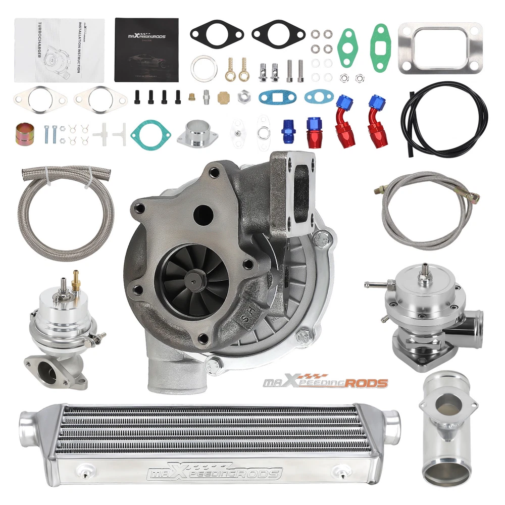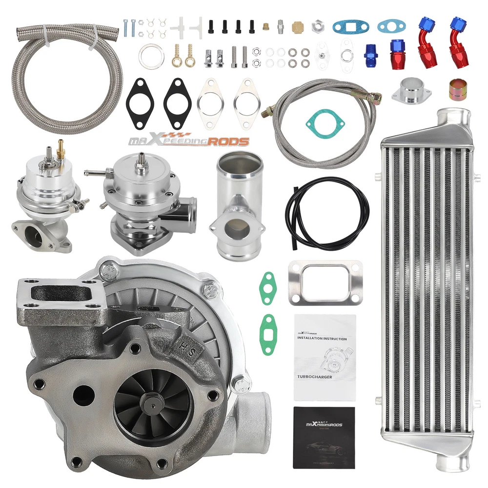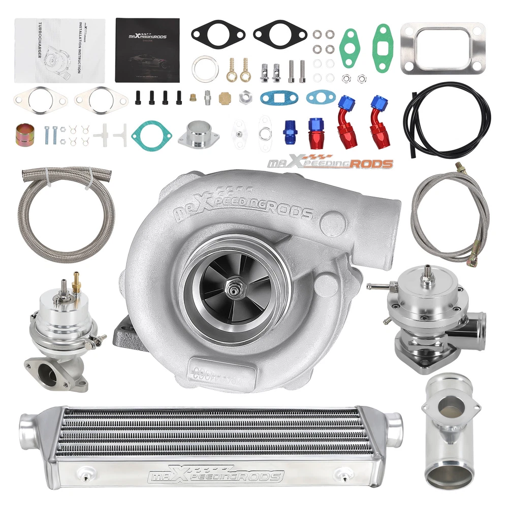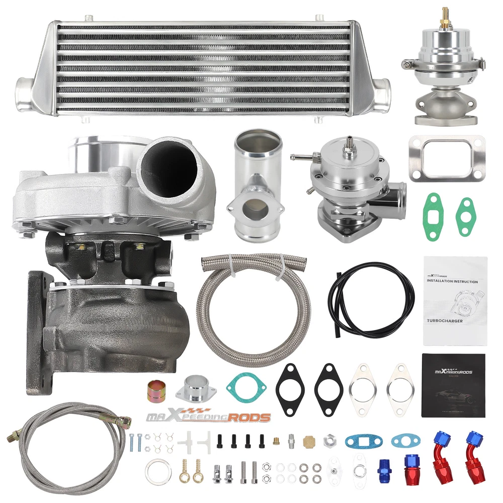 Application Universal Turbo Kit Perfect for 1.5L-3.0L engine, 4/6 cylinder This Kit Will be able to add 350+HP at 7.5-14.5 PSI. (You will need Turbo Manifold, Modification and other accessories to complete the Turbo Kit Project) *Notice: Please confirm that your vehicle displacement is 1.5L-3L before purchasing. Otherwise, if you buy the wrong one, you will not be able to use it normally. Specification Turbine Side: Exhaust Inlet Flange: T3 T4 4 bolt Flange Patterns Exhaust Outlet pipe Flange: 5 bolt Flange Turbine Trim: 74.2 Turbine Inducer Diameter: 64.8 mm Turbine Exducer Diameter: 55.8mm Turbine A/R: 0.63 Compressor Side: Compressor Trim: 48.1 Compressor Inducer Diameter: 52.7mm Compressor Exducer Diameter: 76 mm Compressor A/R: 0.5 Compressor Inlet Diameter: 72mm(2.8") Compressor Outlet Diameter: 53mm(2") Bearing Type: Wet Float Bearing Cooling Type: Oil Cooling Thrust Bearing: 270 degree Horsepower: Up to 400HP Oil Inlet: 1/8 NPT Turbo Type: Individual Condition: 100% Brand New Accessories: You will get exactly as shown as picture above Other specification in the kit : *1 x Intercooler: Size 27'' x 7'' x 2.5'' inch. Inlet size is 2.5 inch. Support up to 350 hp for this small intercooler size - tube and fin style . Intercooler core size: 21*7*2.5 *1 x Type-S Blow Off Valve: 2.5" Inch Type S/Rs Flange Pipe. 25PSi Boost! (the color will be shipped randomly) *1 x BOV pipe: can install anywhere suitable *1 x 35/38MM Wastegate: 35/38mm External Waste Gate Kit (the color will be shipped randomly) *1 x Turbo Oil Return / Feeding Line Kit: Turbo Oil Feed + Return Drain Line Kit Combo. Package Size: 94x 46 x 45 cm Package Weight: 24600g Features 1. Turbocharger: *Turbine housing: Ductile iron QT450-10 - temperature resistant up to 700℃ *Steel turbine wheel: K418 alloy - high oxidation stability and resistance up to 900℃ *Compressor housing: ZL104 aluminum with lightweight *Compressor wheel/blades: Cast aluminium blades – superior air tightness & corrosion resistance *Product Features Cost-effective turbo increase 20-40% power for your car Rich experience in turbo production and own factory High-Speed oil seal ring and Precision clearance Built for durability and strength * Technology Advantage: 100% balancing Test by TURBOTECHNICS VSR3 G3-min-Flow VNT Turbo testing Advanced Actuator Tester/Programmer 2. Intercooler * core size:21*7*2.5 cools down the turbocharged air efficiently * Lightweight aluminum racing intercooler, * Strong TIG welds will support high PSI levels 3. Turbo Oil returen /Feeding line kit * Stainless Steel Braided * Includes complete install kit * It helps circulate oil from the Turbocharger to the oil pan. * The kit provides a anodized look * gives a best cooling on your turbo and long lasting life. 4. Blow Off Valve Kit (the color will be shipped randomly) * CNC Billet Aluminum Type RS Style Blow off Valve * Easy Mount Piping Set Included For Bolt-On. * Including all necessary hardwares. * easily adjustable to prevent both permature boost leakage and compressor surge. * Fast response One For Low And High Boost Pressure. * Quality design will not leak under high boost conditions * Flanges can be installed at user discretion 5. 38MM Wastegate (the color will be shipped randomly) * Most reliable wastegates For competition vehicles. * accurate boost control * high quality appearance features Dual port design * comes with waste gate spring (fully adjustable, up to 15 psi), allow you to add the spring to get desired high psi. 6. BOV pipe/Adapter * can install anywhere suitable Package Include 1x Turbocharger 1x Oil Feed / Return Line 1x 35/38mm Wastegate (the color will be shipped randomly(Random Color) 1x Turbo Intercooler 1x Type-S Blow Off Valve(Random Color) 1x BOV Adapter/pipe (You will get exactly as shown in the picture) Note * Replace, repair or reconnect air cleaner element per manufacturer's manual to avoid compressor wheel damage. * Make sure the oil drain line is lower than the turbo itself. * Ensure exhaust outlet are well sealed by welding * The degree of modification of the universal turbo depends on your individual vehicle.Professional installation is highly recommended. * This Turbo is not vehicle specific. Please check the specifications and verify compatibility prior to placing your order. * Before installing the new turbocharger, the cause that led to the failure of the turbo must be analyzed and eliminated (e.g. insufficient oil supply, foreign bodies in the intake area, crankcase ventilation without function, etc.)! * Need modifications - Professionals ONLY (This is an aftermarket universal turbo kit for DIY purpose, and it's recommended to advanced players but not for beginners. ) MXR04FXJT