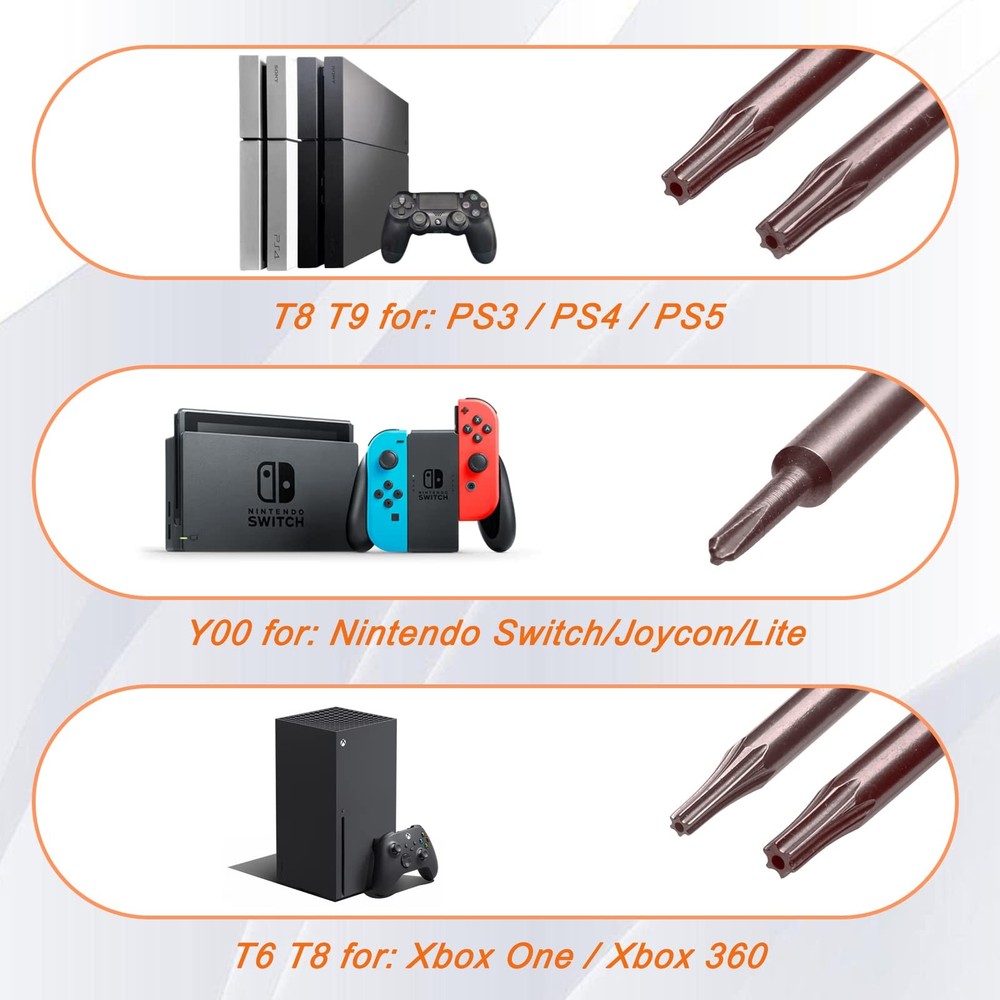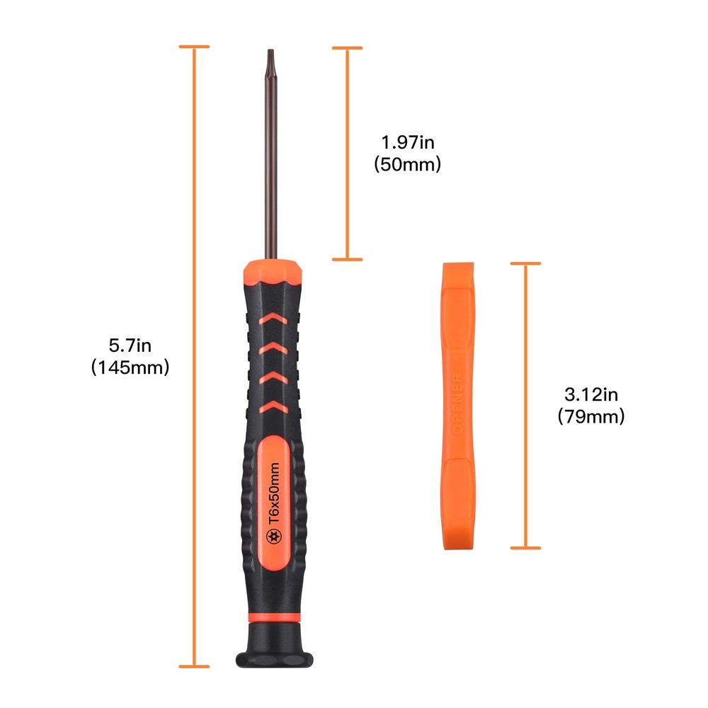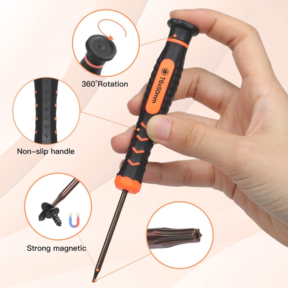 This screwdriver set is really a good helper for life and work 【Applications】 -- The kit includes a torx T6 security screwdriver and a double-end crowbar. The torx T6 screwdriver can be used for hard disk, cooling fan replacement of Macbook pro, fan, cowling, power supply and hard disk replacement of Mac Mini Mid 2010, video doorbell,video doorbell 2 / pro / elite, Xbox controller, Steel Series Arctis 9X Wireless Headset and other devices. The double-end crowbar is used for opening the screen and back cover of electronic devices. 【Magnetic S2 steel screw head】-- All our screwdrivers are magnetically designed, which can fix small screws to avoid falling. screwdrivers are made of high-quality S2 steel, after heat treatment, it is more accurate and durable than silver CRV bits. 【Slip-resistant rotatable handle】-- The screwdriver handle is made of TPR and PP materials, with a special non-slip design, offering a sense of comfortable. The top of the handle is 360°rotatable design which makes it more convenient to remove the screws. 【Portablity】-- The screwdriver and a double-end crowbar are placed in the small package bag, which is convenient for carrying and store. It is also convenient for you to take out the screwdriver for maintenance. 【Attention】--The kit is user-friendly, please make sure what kind of screwdriver you need.