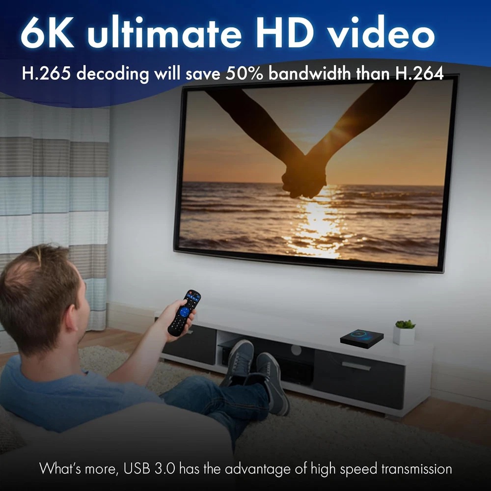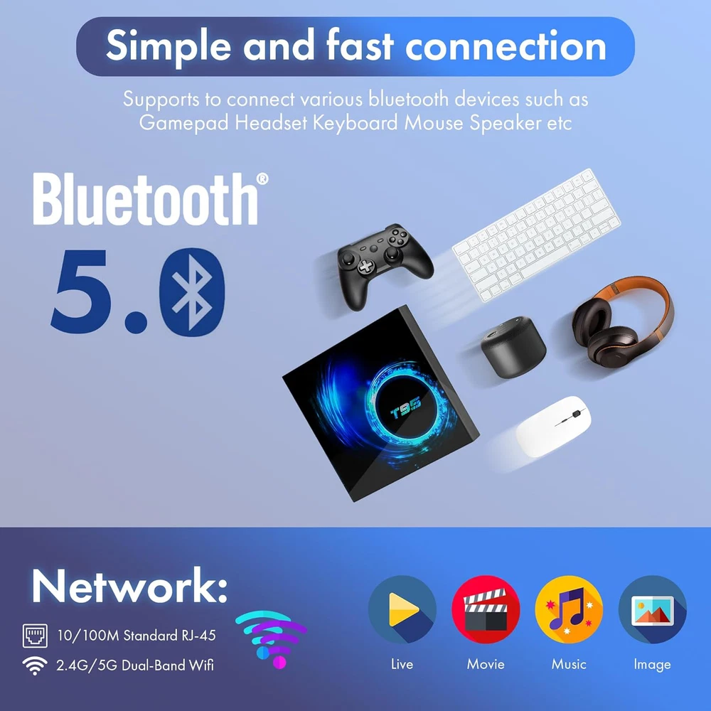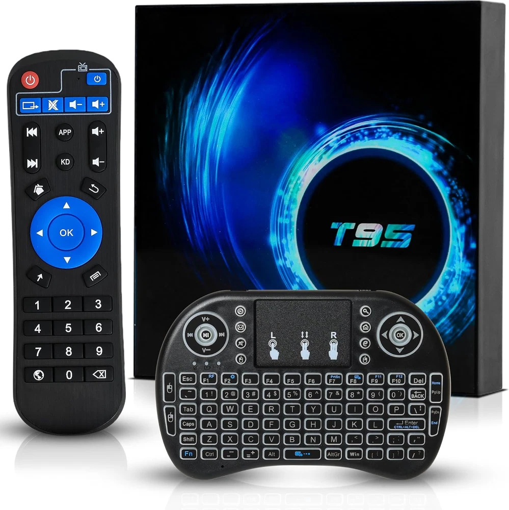 T95 Android TV Box 4GB RAM 128GB ROM- Streaming Media Players with Max Storage- ???Wallecom T-95 Android TV Box 2023 Supports HDR 30 FPS VP9-10???; It has become a True Deal Maker due to giving HDR 30 FPS VP9-10 Profile-2 upto 6K codec support; This is one of the world???s most powerful Android TV streaming media players with enhanced 3D graphics support to HD video in real-time to 6K for clearer or crisper visuals; Has 4GB RAM & 128GB ROM, advance H265 video decoder to give 6K UHD output which makes the android box with better compatibility of software, games, and applications ???Built-in 128GB ROM and 4GB RAM???It comes with 128GB built-in storage and also has 2 USB (2.0) slots to attach extra cards to enjoy the max enhanced capacity ever desired to download more applications & store your favorite Videos; Furthermore, 4GB RAM, Mali-G31 MP2 GPU, 3D graphics acceleration and a powerful H616 Quadcore Cortex-A53 chipset CPU ensures this Android box 2023 to give premium picture quality with highest ever speedy image or video processing, fully satisfied experience for you ???Dual-Band WiFi 2.4G/5.8GHz & BT 5.0???Wallecom Android premiere 4k/hdr streaming media player has built-in highly stable and faster 2.4G/5.8Ghz dual-band WiFi and supports 10/100M ethernet LAN to ensure you enjoy better quality web browsing, playing games, running multiple APPs, and watching movies; The built-in Bluetooth (5.0) enables wireless connections with the mouse, wireless backlit mini keyboard (comes with this combo package), controller for games and other BT enabled devices ???Screen Mirroring & Free Wireless Backlit Mini Keyboard???Enjoy content from Android mobile or iOS devices on the bigger screen to play games, stream UHD videos, or share photos on the bigger screen; Simply plug in the HD port and connect to the internet via Wi-Fi or Ethernet to start enjoying thousands of channels and APPs; This Wallcom tv box comes with a free Wireless mini keyboard that connects to the device via Bluetooth to enable you to type speedily than remote and browse hassle-free