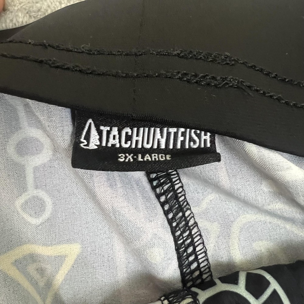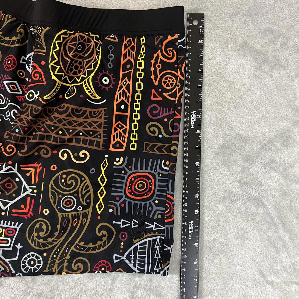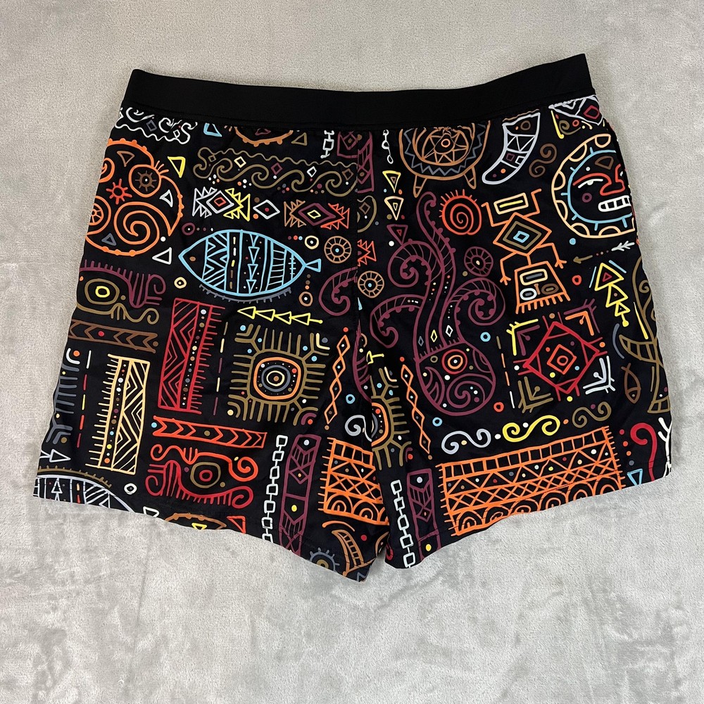 Brand: TACHUNTFISH Item: Mens shorts with elastic waistband Tag size: 3X-Large (Mens 3XL) Color/Pattern: Black base with multicolor tribal/Aztec-inspired graphic print Details: Elastic waist, side hem slits for mobility, no visible pockets Branding: Embroidered arrowhead logo at lower hem Lining: No mesh liner visible in photos Material: Not specified on tags shown in photos Notes: See photos for fabric texture, stitching, and overall design details.