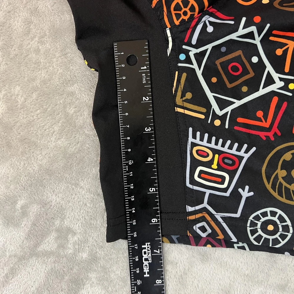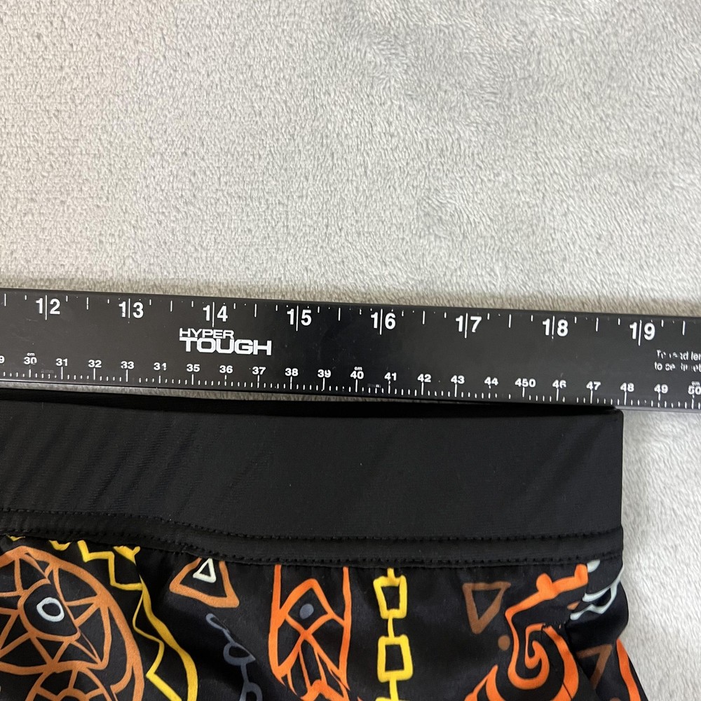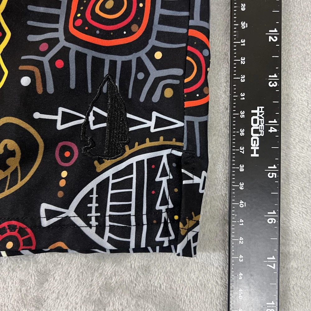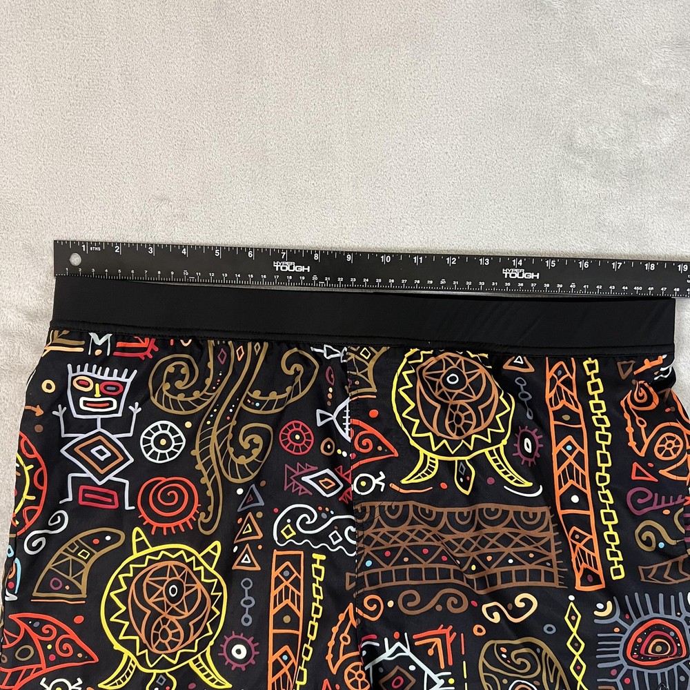 Brand: TACHUNTFISH Item: Mens shorts with elastic waistband Tag size: 3X-Large (Mens 3XL) Color/Pattern: Black base with multicolor tribal/Aztec-inspired graphic print Details: Elastic waist, side hem slits for mobility, no visible pockets Branding: Embroidered arrowhead logo at lower hem Lining: No mesh liner visible in photos Material: Not specified on tags shown in photos Notes: See photos for fabric texture, stitching, and overall design details.