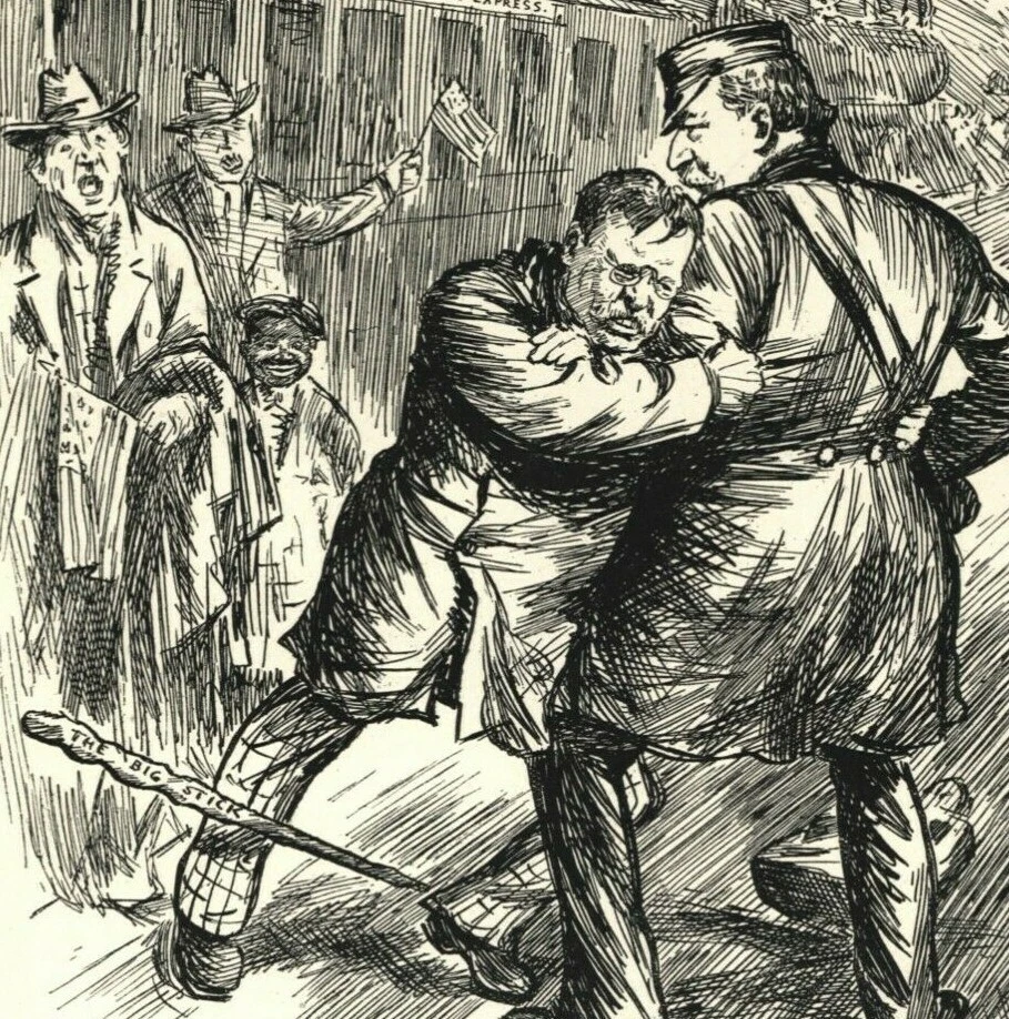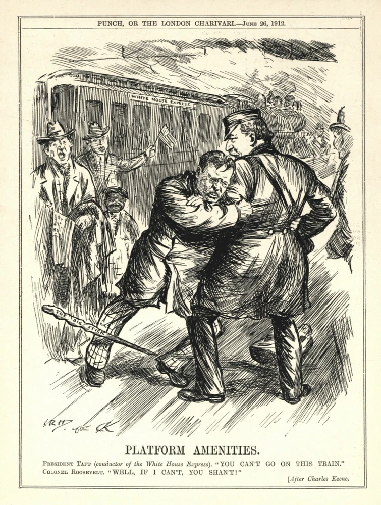 Source: British PUNCH humor/satire magazine , June 26, 1912 original, pulled from the magazine, not a modern reproduction. Illustrated by L. Raven-hill. Size 8 1/2 x 11" (approximately) Condition : excellent -- bright and clean paper, no handling wear, paper lays flat for easy framing; backside is blank. PLATFORM AMENITIES President Taft (conductor of the White House Express) "You can't go on this train." Colonel Roosevelt "Well, if I cant, you shan't." --The 1912 United States presidential election was the 32nd quadrennial presidential election, held on Tuesday, November 5, 1912. Democratic Governor Woodrow Wilson unseated incumbent Republican President William Howard Taft and defeated former President Theodore Roosevelt, who ran under the banner of the new Progressive or "Bull Moose" Party. Over 3,000 Punch cartoons listed for sale, combine orders and save shipping charges. Questions are always welcome. WHO IS THE ARTIST: Leonard Raven-Hill (10 March 1867 - 31 March 1942) was an English artist, illustrator and cartoonist. WHAT IS PUNCH? Punch , a magazine of humor and satire, ran from 1841-2002. A very British institution renowned internationally for its wit and irreverence, it helped to coin the term "cartoon" in its modern sense as a humorous illustration. Punch was the world's most celebrated magazine of wit and satire. From its early years as a campaigner for social justice to its transformation into national icon, Punch played a central role in the formation of British identity -- and how the rest of the world saw the British nation. In its formative years Punch combined humors, illustration and political debate with a fresh and radical audacity. During its heyday in the late 1800s, it reflected the conservative views of the growing middle-classes and copies of it could be found in the libraries of diplomats, cabinet ministers and even royalty. In the Western world, Punch played a significant role in the development of satire. In the world of illustration, it practically revolutionized it. Over the decades as it charted the interests, concerns and frustrations of the country and today it stands as an invaluable source of cartoon art, satire, but as primary source material for historians.