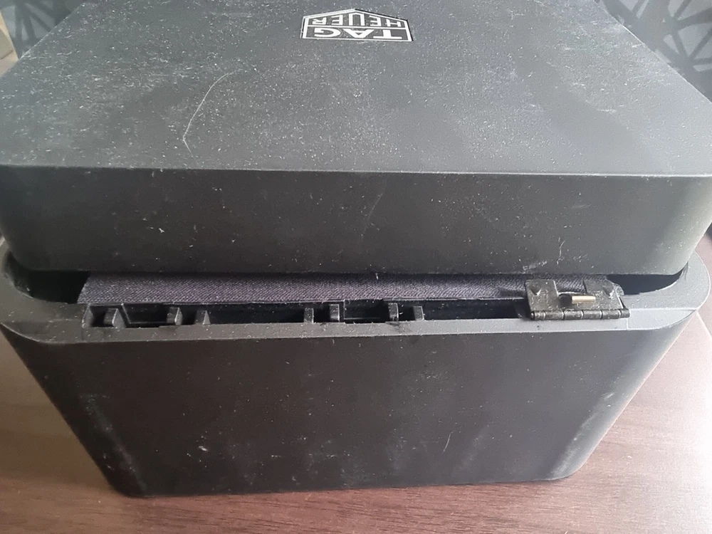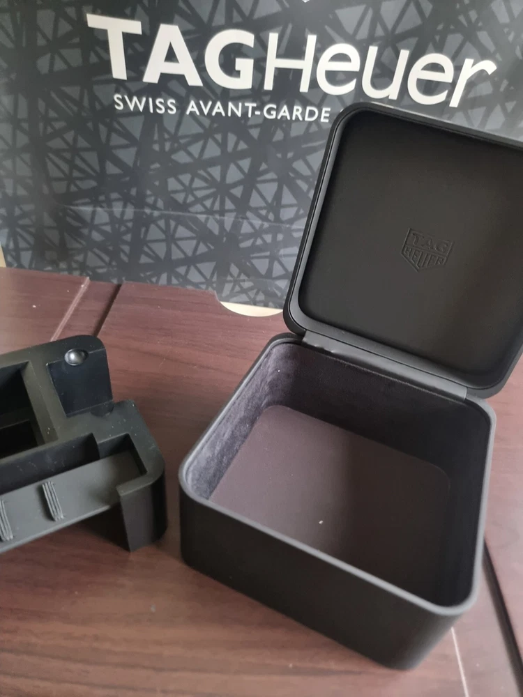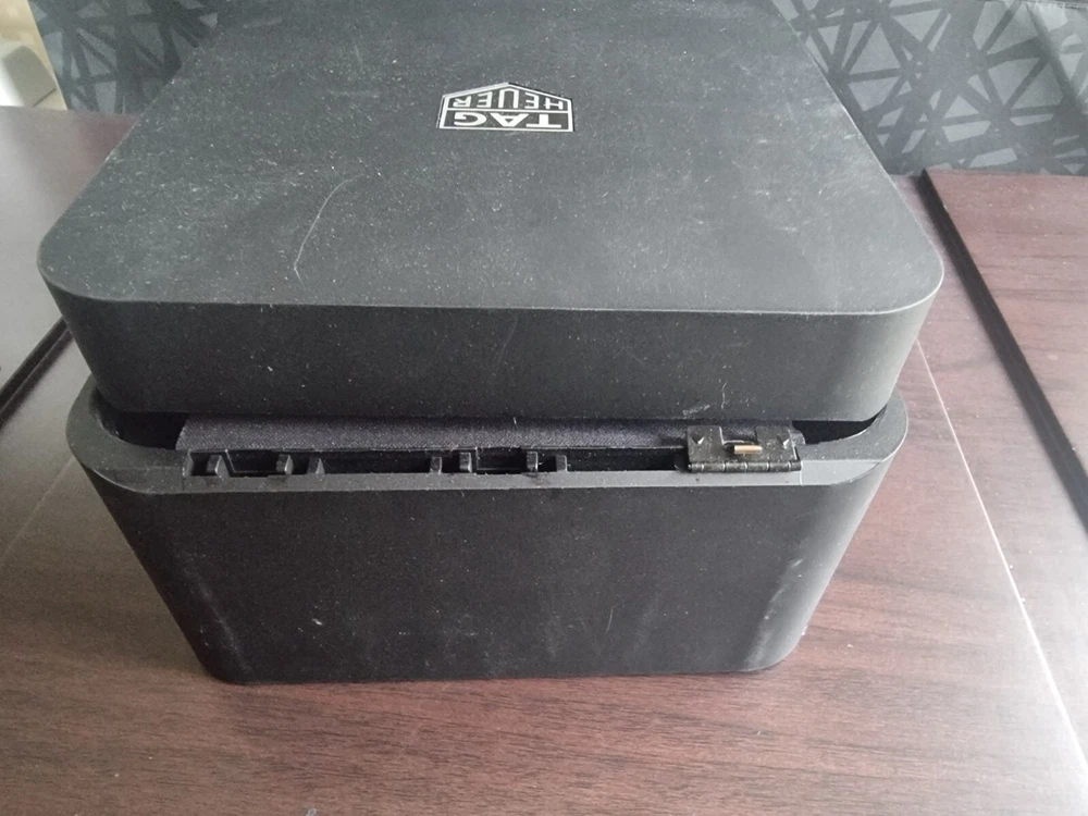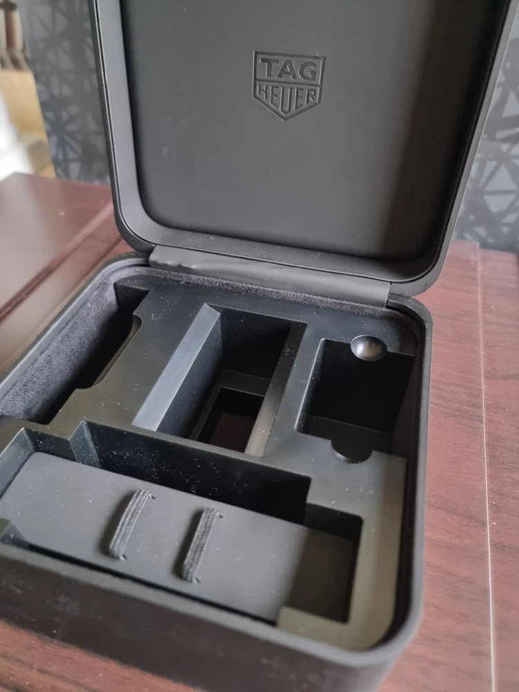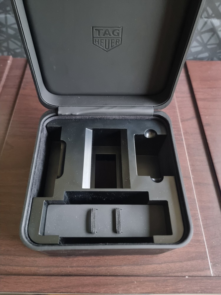 TAG heuer original Connected watch box the box is used. the lid is attached but as the images show the back brackets are loose or undone. Please see images This is a No reserve auction. please only bid if you are sure. Thank you code: 00A1