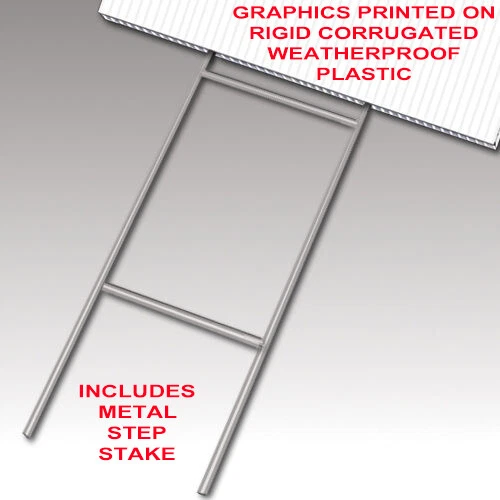 PRODUCT DESCRIPTION: Tampa Printing uses heavy duty premium 4mm thick (industry standard) indoor / outdoor corrugated coroplast plastic material for our yard signs. All yard signs are printed using heavy duty vinyl with the industry best latex ink technology, are UV and water resistant, and withstand hot and cold conditions. All yard signs include a metal step stake for easy installation in grass or soil. All yard sign dimensions are 24 inches wide by 18 inches tall. PRODUCT USES: Our yard signs are perfect for business or personal use. Place these signs where they can be clearly read for passersby. At traffic intersections, events, yard sales, new business locations or election campaign events. PRODUCTION QUANTITIES AND DISCOUNTS: This listing is offered as a single or double sided item. If you require a larger quantity and/or size, message us for a quote. PRODUCTION/SHIPPING: Our yard sign production is REALLY FAST! Once your order is purchased, we produce and ship within one to two business days! Our normal business hours are Mon-Fri, 9am-6pm EST, excluding holidays.