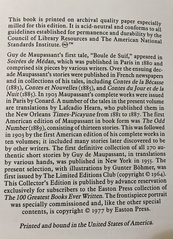 TALES OF GUY DE MAUPASSANT Easton Press 1977 Hardcover Leather Ed 100 Greatest Books New Mint THE TALES OF GUY DE MAUPASSANT by Guy De Maupassant Easton Press © 1977 From the 100 Greatest Books Ever Written Series Guy de Maupassant was a 19th-century French author who wrote over 300 short stories and six novels. He is widely regarded as one of the greatest masters of the short story form and a representative of the Naturalist school of literature. Collector's Edition Genuine Leather Bound Hardcover Mint Condition, never read, bookmark is in original position and fold! Printed and bound in the United States I am helping liquidate an estate for a friend. Her husband was an avid collector of books. I have hundreds to list, many rare and hard to find books. Please check back often as I will be listing new ones every day. Feel free to ask if you are looking for anything in particular. I will be listing many Folio Society books as well as the entire collection from the 100 Greatest Books ever written by Easton Press. Please email me with any questions. I will respond back quickly. I describe item conditions to the best of my ability and will always point out any flaws or defects that I am aware of. I am an EBay Seller with 100% Positive Feedback! Thank you. Bid with Confidence! See my other listings for more great items! Because I have had a slew of non paying and very slow paying bidders lately I will require payment within 2 days of the end of auction. However, if you need a different arrangement I will be more than happy to work with you, just let me know. INTERNATIONAL BUYERS ARE RESPONSIBLE FOR ALL CUSTOMS CHARGES, PORT CHARGES OR ANY TAXES DUE UPON RECEIPT OF THEIR PACKAGE. All my shipping charges include delivery confirmation. International shipping will be at actual cost. Thank you for bidding on my auctions. Your business is very much appreciated! txzj pxzj7585 txzj-11 txzj111 txzj115