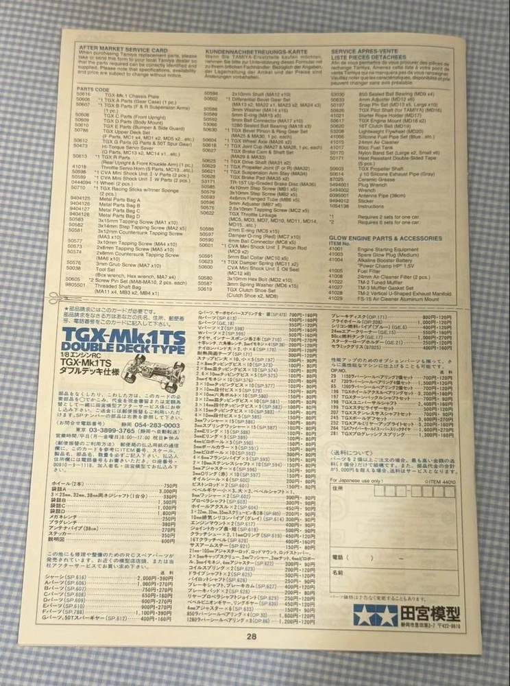 TAMIYA RC TGX-MK.1 DOUBLE DECK TYPE GLOW-ENGINE 4WD RACING CAR CHASSIS KIT 1/8 Description Item Condition : Used Very Good! Shipping Handling Time: 5 business days We will ship your item on week day from Japan. Standard Shipping with tracking number by FedEX or DHL or Japan post. We will ships within 5 business days after receiving cleared payment. ※Business days are not include Saturday, Sunday and National holidays. Package We pack items carefully and send them from Japan prompthy. You should have no concern about shipment. International Buyers - Please Note: Import duties, taxes, and charges are not included in the item price or shipping cost. These charges are the buyer's responsibility. Please check with your country's customs office to determine what these additional costs will be prior to bidding or buying. Thank you for your understanding.