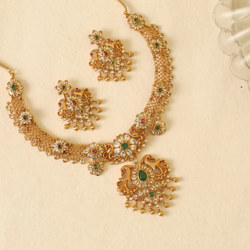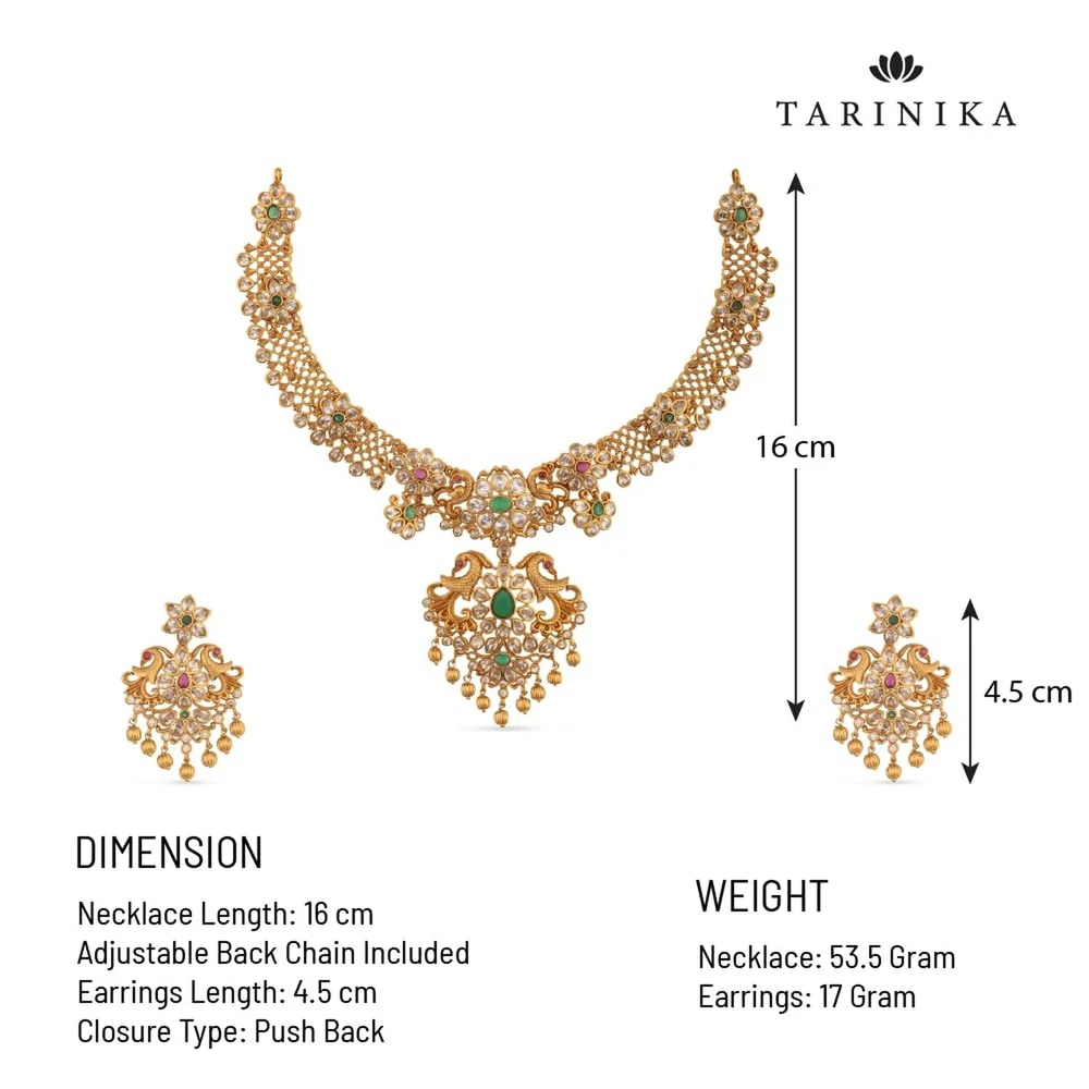 TARINIKA Antique Gold Plated Vira Short Necklace Set with Floral Design - Indian Jewelry Sets for Women | Perfect for Ethnic Occasions | Traditional South Indian Necklace | 1 Year Warranty* Product Details Package Dimensions : 8.78 x 6.61 x 1.54 inches; 9.59 ounces Department : womens Date First Available : May 28, 2021 Manufacturer : TARINIKA Country of Origin : India Brand, Seller, or Collection Name: TARINIKA Metal: gold plated brass Material: Brass Gem Type: Cubic Zirconia Chain: Rope Clasp: Fishhook Clasp Number of stones: 50