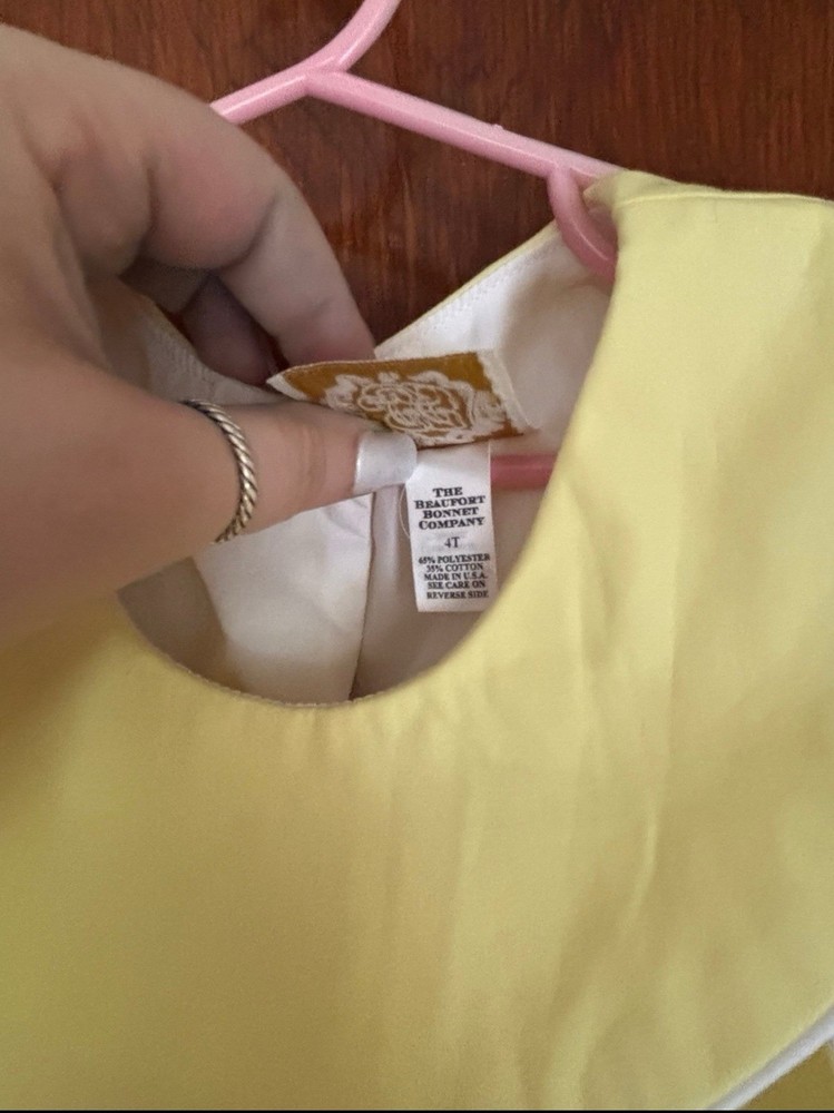 Handmade:NoDepartment:GirlsPersonalize:NoVintage:NoSize:4Color:YellowDress Length:Knee LengthOccasion:CasualStyle:MiniGarment Care:Machine WashableSeason:Spring, SummerSeller Notes:“One mark on back button as shown”Brand:The beaufort bonnet company