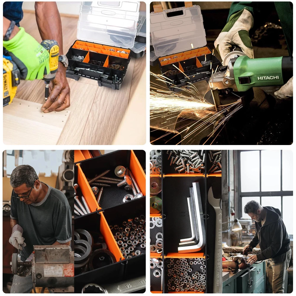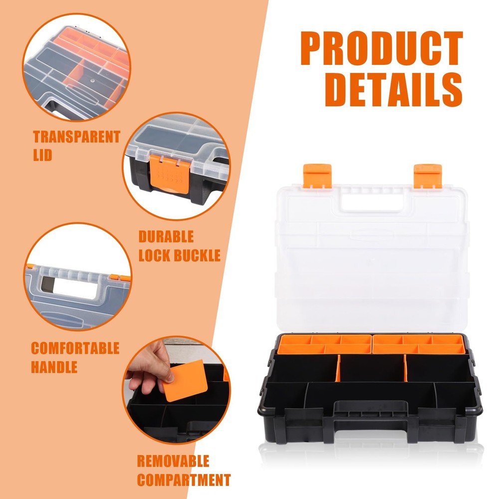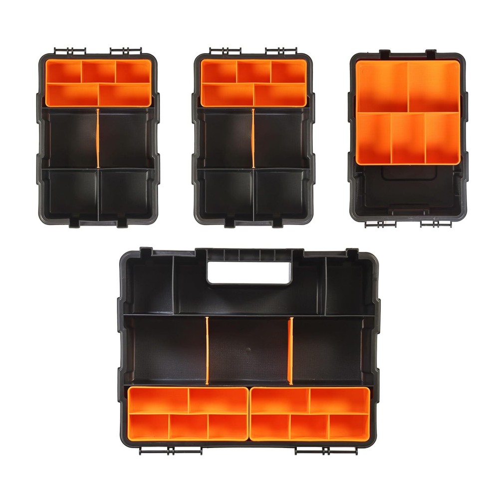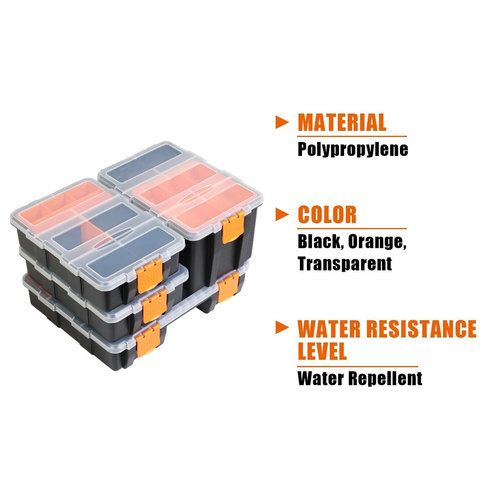 TCE Tool Boxes Parts Organizer,Versatile And Durable Storage Toolbox For Bolts, Screws, Nails, Nuts, And Small Hardware, 4PCS Set,TRG-421,Black/Orange This 4 Piece Set Hardware & Parts Organizers, This compartment small parts qrganizer, versatile and durable storage tool box is made of high quality PP. This set includes 4 toolbox: 1pc: 11. 4"*8. 7"*2. 4" Compartment Organizers, 1 pc: 8. 7"*6. 1"*4. 7" Compartment Organizers , 2pc: 8. 7"*6. 1"*2. 4". Which 4 different Organizers in 3 different sizes for all your storage needs. It is perfect using for small tools, bolts, screws, tackle, parts, crafts and many other items. High quality PP plastic, which is durable and long lasting. The compartments and dividers are fantastic for storing small parts, removable dividers for customized configuration. This Hardware & Parts tool Organizers 4-piece set includes 4 boxes in 3 different sizes for all your storage needs. The tool chest is suitable for storing for small tools, bolts, screws, tackle, parts, crafts and many other items. The compartments on the top of the hardware Organizer allows for quick and easy access to items during use. A transparent lid to make it easier for you to identify the tools or screws inside the box and help you to find the right one quickly and efficiently; perfect for personal or professional use. 4 IN 1 DESIGN: This tool Organizers 4-piece set includes 4 boxes in 3 different sizes for all your storage needs. 1pc: 11. 4"*8. 7"*2. 4" Compartment Organizers, 1 pc: 8. 7"*6. 1"*4. 7" Compartment Organizers , 2pc: 8. 7"*6. 1"*2. 4". HIGH-QUALITY MATERIAL: This tool boxes are made of durable PP plastic that is stable,and less prone to breakage and damage when dropped. PORTABILITY: The clear lid of this tool organizers allow you to find your tools quickly, and because of its small size, it can be placed in your everyday tool bag or stacked with other organizers! REMOVABLE COMPARTMENTS: This tool boxes parts organizers's compartments and dividers are perfect for storing small parts, with removable dividers that can be custom configured. MULTI-PURPOSE: The tool chest is suitable for storing for small tools, bolts, screws, tackle, parts, crafts and many other items. Shipping from the USA All of our products are shipped from the USA, ensuring quick delivery to your destination. Payment We offer the following payment methods: PayPal, credit card, bank transfer, and eBay's secure payment system. Free Shipping & Free Returns Shipping within the USA is FREE. Additionally, any return is absolutely free for you. Risk-Free Purchase You have the option to return an item within 30 days without any justification. We cover the return shipping costs! Fast Shipping We ship immediately upon receipt of payment. Generally, the package is delivered within 2-3 days in the USA. If it takes longer, we will contact you. Quality and Costs Made in Europe, USA, China No customs fees or additional charges Total satisfaction guarantee Invoice with declared VAT available upon request in .pdf format Feedback Your feedback is very important to us. After you pay for your purchase, you will automatically receive positive feedback from us.