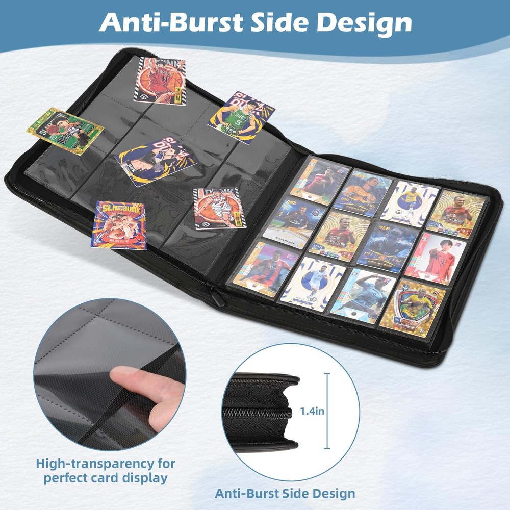 Protect, organize, and showcase your valuable card collection with this premium collectible card binders, designed for all types of standard-sized trading cards, including TCG cards, MTG cards, baseball cards, basketball cards, football trading cards. Whether you’re a hobbyist or a serious collector, this card book zipper is the perfect solution for keeping your cards safe and well-organized. The tcg binder 12 pocket includes 20 pages, each with 12 pockets on both sides, offering a total of 480 pockets for your collection. Made from transparent, durable plastic, each pocket displays your cards clearly while protecting them from damage. The side loading card binder design prevents your cards from falling out, making it easier to access and organize your collection. The high-quality leather cover of the binder is waterproof and provides excellent protection against external elements, keeping your cards safe from water, dust, and wear. Whether you need a MTG binder, a baseball card binder, or a sports card binder, this binder offers lasting durability and style. The smooth zipper closure keeps dust, dirt, and fading at bay, ensuring your cards stay in pristine condition. Perfect for card collectors, this binder is the ultimate storage solution for any binder for cards needs, providing an efficient and safe way to store and display your card collection. Whether you’re organizing football card binders or adding to your sports card binder, this binder will keep your cards secure and protected for years to come. Large Capacity to Store Up to 480 Cards – This MTG card binder includes 20 pages, each with 12 pockets on both sides, offering a total capacity of 480 standard-sized cards. Perfect for TCG cards, MTG cards, baseball cards, basketball cards, football cards, and trading cards, this card album is the ultimate storage solution for all types of cards Premium Leather Cover for Durability and Style – Made from high-quality, waterproof leather, these collectible card binders not only protects your cards from external elements but also gives it a sophisticated and durable finish. Whether you’re looking for a sports card binder, baseball card binder, this mtg card binder adds a premium feel to your card collection Crystal Clear, Durable Pockets for Display and Protection – Each pocket is made from transparent, durable plastic, allowing you to clearly see your cards while keeping them safe from damage, scratches, or bending. Whether you’re using it as an MTG binder or TCG binder, this card binder zipper ensures your collection stays pristine and protected Side Loading Design for Extra Security – The side loading card binder design ensures that your cards are inserted from the side, preventing them from slipping out. This feature provides extra security for your valuable cards, making it ideal for long-term storage and display Smooth Zipper for Full Protection – The baseball card binder is equipped with a high-quality zipper that keeps your cards secure and prevents dust, dirt, and fading. Whether it’s used as a football card binder, sports card binder, tcg binder 12 pocket, or a card collection binder, the zipper ensures your cards are kept in pristine condition for years