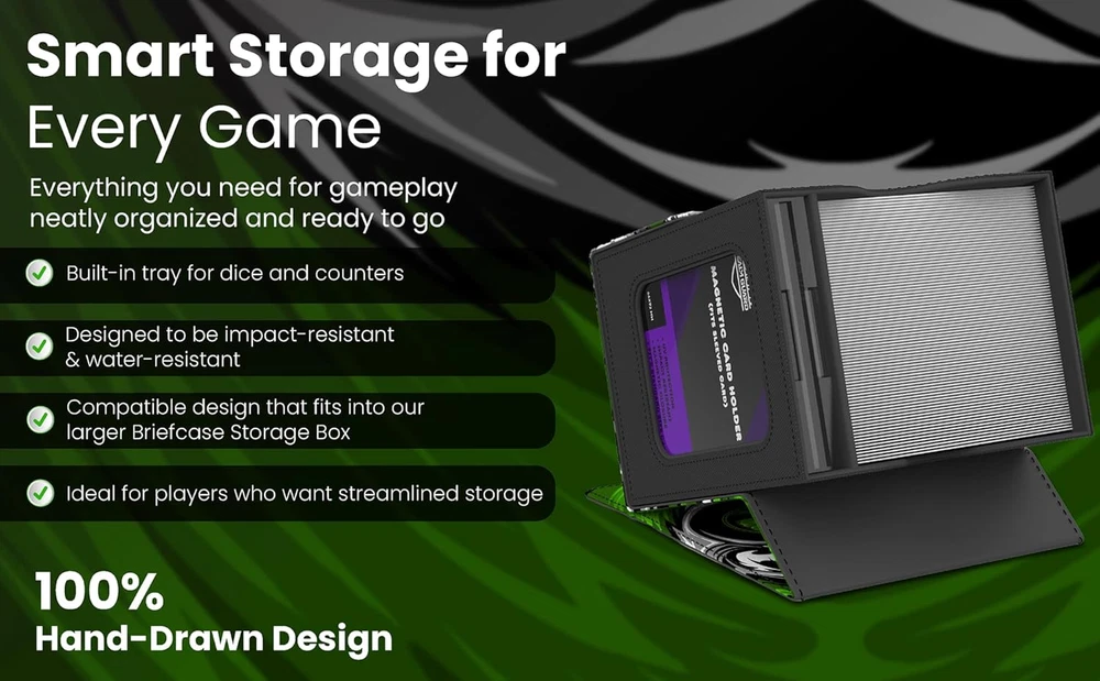 ✅ Fits 120 Sleeved, 110 Double Sleeved ✅ Magnetic Card Holder For Commander (Fit's Sleeved Card) ✅ Storage Tray For Dice & Counters ✅ Hand Made ✅ High Quality Faux Leather ✅ Premium Stithcing, Tough & Durable ✅ Soft Microfiber Inside ✅ Impact & Water Resistant ✅ Compatible with Magic The Gathering & Lorcana Cards. These boxes are not created by Magic The Gathering or Disney. Product description 100% Hand-Drawn Artist Credit: Ongky Widyanto