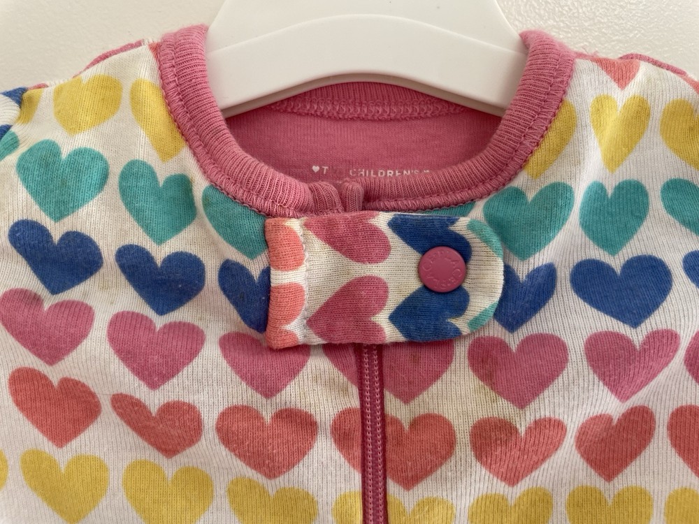 The Children's Place Baby Girl Colorful Rainbow Hearts 100% Cotton Long Sleeve 1-Piece White 0-3M. Condition is pre-owned. Smoke free, pet free home. Shipped via USPS Ground Advantage. In fair condition. There are stains on the front. Free of rips.