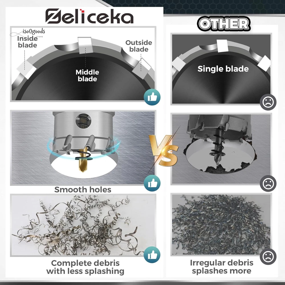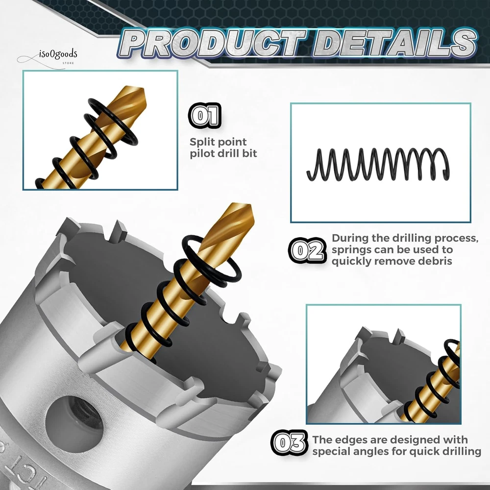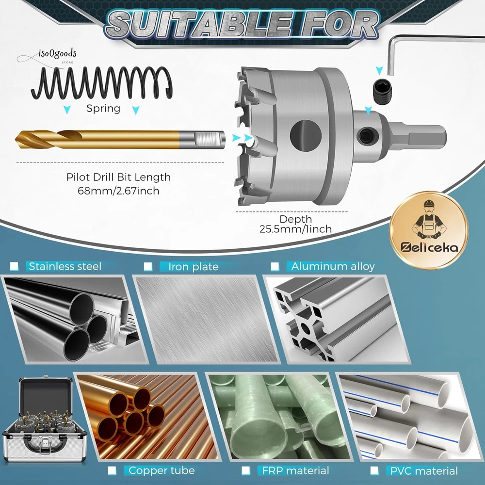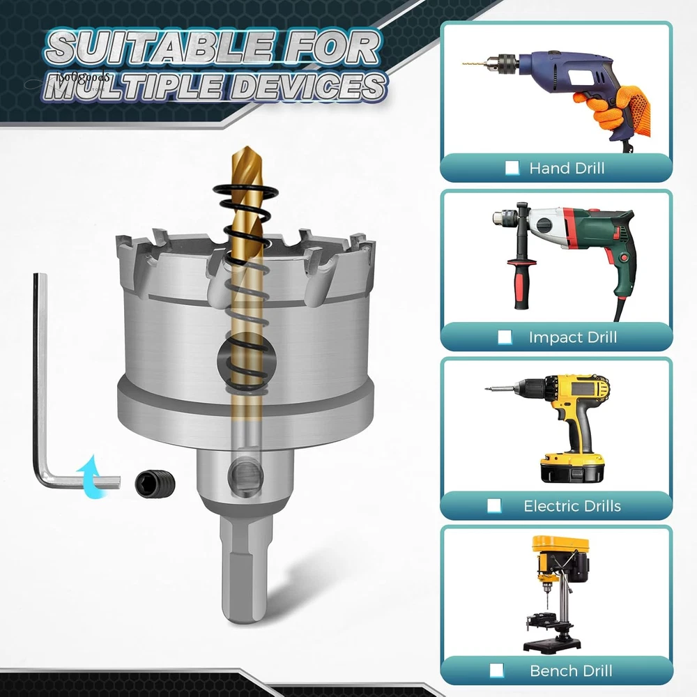 Premium TCT Carbide Hole Saw Set - Versatile, Durable, and Precision-Engineered Upgrade your toolkit with this high-quality TCT Carbide Hole Saw Set, designed for superior performance and longevity. Perfect for professionals and DIY enthusiasts alike, this set ensures precision cuts in various materials with ease. Package Includes: 10 Hole Saw Sizes : 19mm (3/4"), 22mm (7/8"), 25.5mm (1"), 29mm (1-1/8"), 32mm (1-1/4"), 35mm (1-3/8"), 45mm (1-3/4"), 51mm (2"), 54mm (2-1/8"), 60mm (2-3/8") 2 Extra Pilot Drill Bits 2 L-Wrench 1 Exquisite Aluminum Box for easy storage and transport Key Features: Superior Quality : Made of high-quality TCT Carbide (Tungsten Carbide Tipped Cutters), this set offers high hardness, rust prevention, and exceptional durability. Versatile Applications : Ideal for cutting through hard materials like stainless steel, mild steel, iron, aluminum, copper, as well as FRP, wood, and plastic. Easy to Use : Compatible with handheld electric drills, mobile ribbon-type magnetism drilling machines, and stand motor-driven drilling machines. Adding coolant during high-speed drilling prevents burning or breaking, extending the product's lifespan. Portable Design : The metal hole saw kit comes with a compact and sturdy aluminum box for convenient use and storage. Product Description: Newly Upgraded Alloy Blade : Featuring a three-blade design for serrations, ensuring versatile and durable precision cuts in various materials. Material : TCT carbide Handle Diameter : 3/8 Inch Cutting Length : 1 Inch Cutting Diameter : 19mm (3/4"), 22mm (7/8"), 25mm (1"), 29mm (1-1/8"), 32mm (1-1/4"), 35mm (1-3/8"), 45mm (1-3/4"), 51mm (2"), 54mm (2-1/8"), 60mm (2-3/8") Safety Features: Multi Safety Protection : Includes overload protection, short-circuit protection, over-current protection, over-voltage protection, and overheating protection, making it a safe and reliable choice. Portable and Convenient : Compact size, large capacity, and easy to store, making it perfect for home, office, and travel.