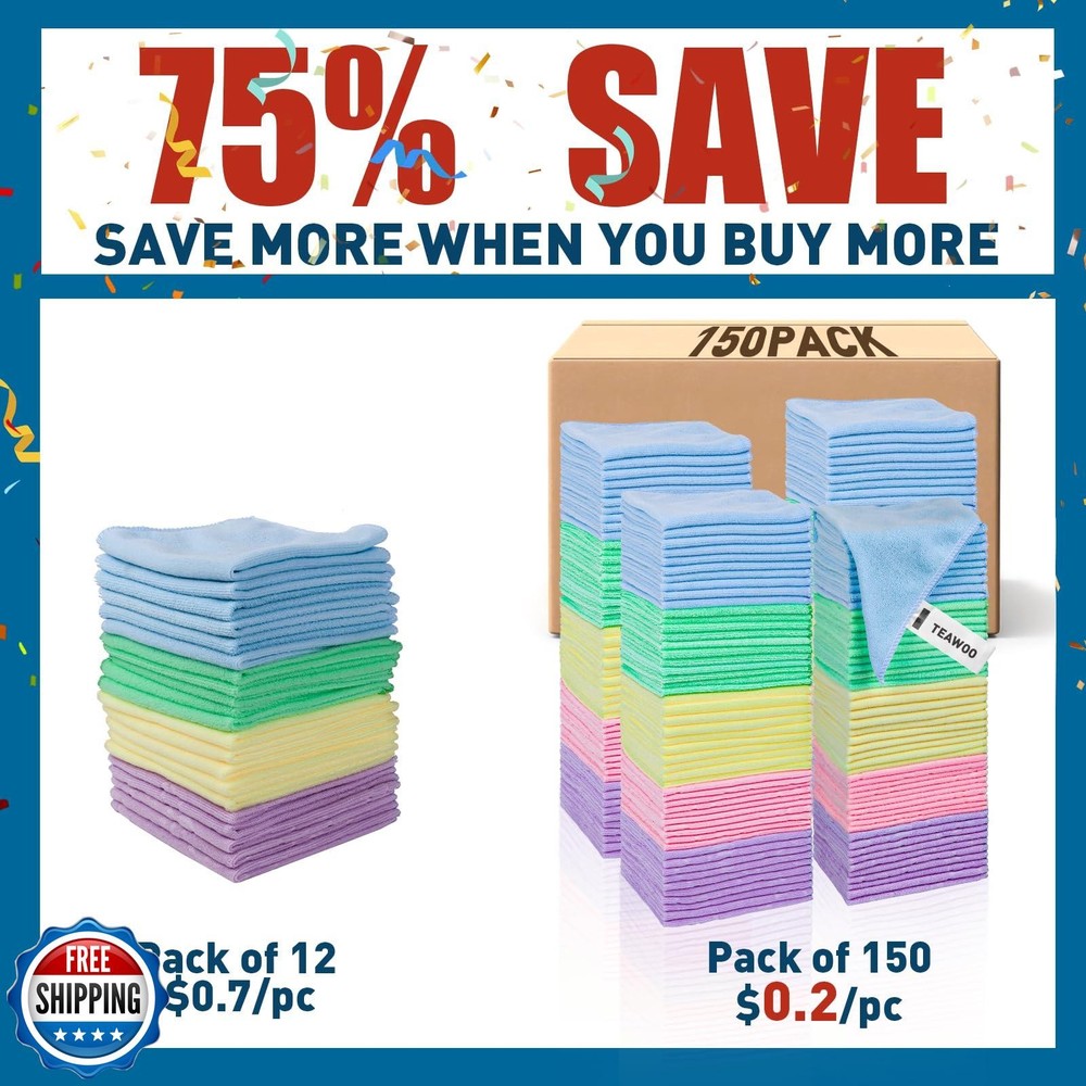 TEAWOO Microfiber Towels Bulk-150 Pack, Cleaning Cloths, Microfiber Towels for Cars, Cleaning Rags 5 Colors Assorted (12x12 inches) Features 【Microfiber Towels Bulk】 One pack of 150 microfiber towels for cars and home, measuring 12x12 inches, is vacuum-packed to reduce greenhouse gas emissions. Please allow a few minutes for the towels to expand fully after unpacking to achieve optimal fluffiness and absorbency. 【Super Absorbent】 TEAWOO microfiber cleaning cloths quickly soak up moisture and dry rapidly, making them ideal for both automotive and household cleaning tasks. They efficiently remove dirt, grime, and liquids with ease. 【Soft and Lint-Free】TEAWOO microfiber towels bulk supply of ultra-soft, non-abrasive microfiber towels ensure a scratch-free cleaning experience on surfaces, paint, glass, and coatings. Perfect for cleaning tough grease and dirt from your car, kitchen, and windows, leaving no traces behind. 【Reusable and Washable】These reusable and washable microfiber towels cleaning for cars can be used hundreds of times without shrinking, shedding, or losing their cleaning effectiveness. They are a cost-effective alternative to disposable towels, ideal for car and household cleaning. 【Easy Maintenance and Use 】Our bulk microfiber towels come in 5 colors and are crafted with high-quality fabric and sewn edges, providing a soft and scratch-free feel. They are easy to maintain and perfect for keeping both your car and home spotless. Shipping Free & Fast Shipping: We offer free shipping to most of the USA with a normal delivery time of 3-7 days. However, due to the current situation, additional delivery time (up to 3 weeks) may be required for some items. Alternative Carriers: We may use alternative carriers (e.g., USPS, FedEx, UPS) to ensure your package arrives safely and on time. Due to the use of multiple carriers, we are unable to provide a tracking number automatically. Handling Time: Orders are processed and shipped within 1-2 business days of receiving cleared payment. Shipping Restrictions: Shipping to Alaska, Hawaii, Puerto Rico, Guam, and other US territories may incur shipping charges or delivery restrictions. Please contact us before ordering, or your order can be refunded/cancelled. State Restrictions: Certain items may not be shipped to California due to state regulations. Contact for Tracking Updates: If you require tracking updates or have any concerns about the delivery of your order, please feel free to contact us, and we will be happy to assist you. Return Policy 30-Day Hassle-Free Returns: If you are not completely satisfied with your purchase, you can return the item for free within 30 days of receiving it for a full refund or exchange. Easy Return Process: Contact us, and we will provide you with a prepaid return shipping label and detailed instructions. No Restocking Fee: There are no restocking fees for returns. However, the buyer is responsible for return shipping costs if the return is not due to a seller"s error. Refund Processing: Refunds will be processed within 1 business day of receiving the returned item in its original condition. Feedback Your feedback is extremely important to us. We strive to provide the best products and customer service possible. If you are satisfied with your purchase, please take a moment to leave us a positive review. If you have any concerns or issues with your order, please contact us before leaving negative feedback. We are committed to resolving any problems and ensuring your satisfaction. Contact Us If you have any questions or concerns, please feel free to reach out to our customer support team. You can contact us through the eBay messaging system. We are available Monday to Friday, 9:00 am to 5:00 pm EST, and we will do our best to respond to your inquiry within 24 hours. Thank you for supporting our small family business!