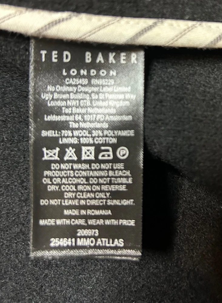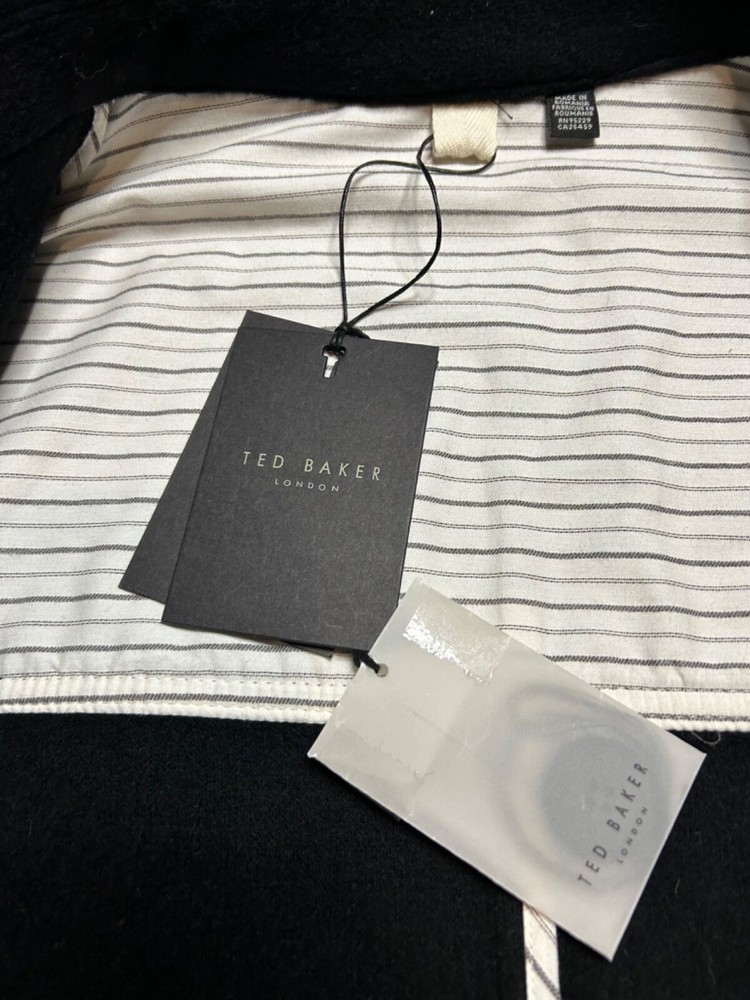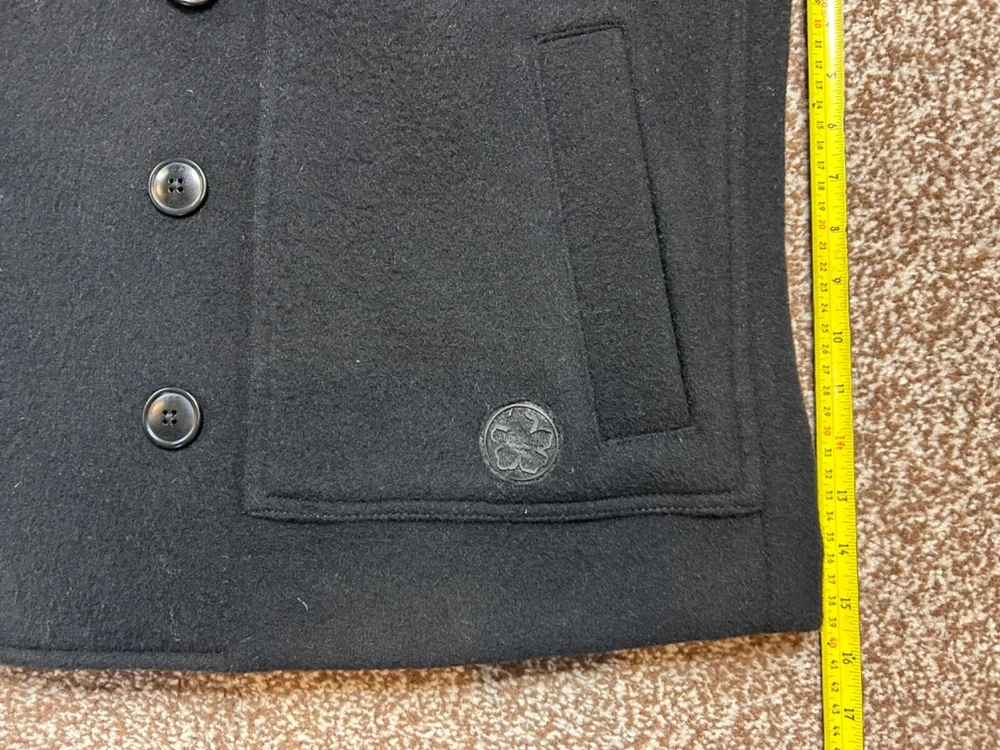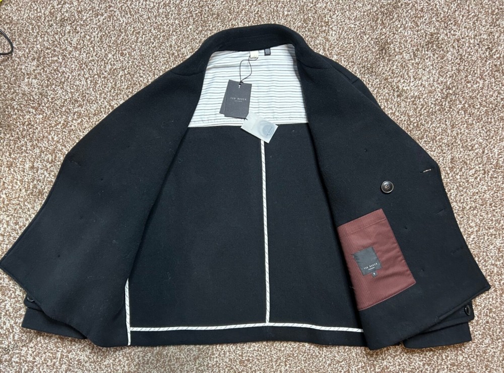 BRAND NEW Men's Black wool blend pea coat from TED BAKER Model: Atllas RRP £325 Cut from super soft wool blend fabric Double breasted button fastening Part lined in cotton Front pockets Material: 70% wool 30% polyamide Lining: 100% cotton Label size: TB5 X Large Garment measures: Pit to pit: 26" Pit to hem: 15.5" Neck to hem: 28" Pit to cuff: 17" Stock ref: NP 2430 /24014 /07114