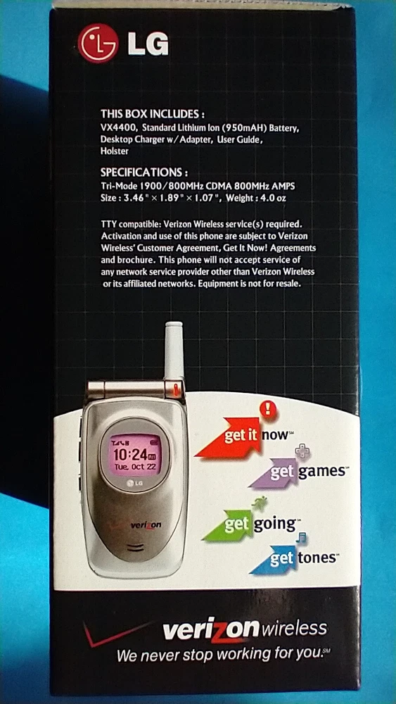 This listing is for a LG flip phone Model VX4400 of which I am the original owner. The phone has been tested and operates perfectly. The main reason for this listing is the original pristine box, original pristine user guide and functional charging cradle and charger. I am including the phone in this listing because someone may have a case with an inoperative phone and swap cases since this phone works fine. In addition to the phone the following items are included in the sale: (1) Original box (2) Original charger with cradle (3) Original user guide (4) Two batteries (5) Original belt clip(broken hinge) Although the phone has been used and has numerous signs of wear mostly worn paint and small dents in the front left corner and on the face (photos 16 and 17) it operated perfectly when last used. I have not been able to make a call with it recently because it is 2G. In addition, the original belt clamp has a broken hinge, shown in photo 18. As shown in photos (5&7) the battery is fully charged but it may not last long. This phone is primarily for collectors and not able to make calls because it is for a 2G system. Shipping will be by USPS Ground Advantage. Please ask questions prior to purchase. Thanks for looking.