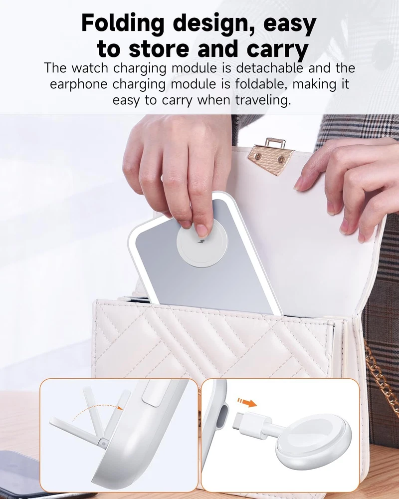 【3 in 1 Magnetic Charging】: This charger stand utilizes wireless technology for secure, efficient wireless charging of compatible phones, Magsafe Charger for iphone 12/13/14/15/16 series, apple watch, airpods pro. 【As a night Light】: The wireless charger stand is also a small bedside night light with 3 adjustable gears 【As a Mirror】This magnetic 3 in 1 charger station is also an LED luminous makeup mirror Compact and Portable: The sleek, lightweight construction makes it easy to carry this charger stand wherever you go. 【Safe Charging:】Built-in safeguards prevent overcharging, overheating, and short-circuiting for reliable, worry-free charging. Freely adjust the angle of the magnetic charger station for iPhone