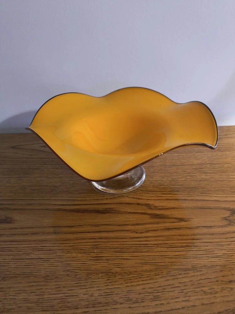 Add a splash of vintage charm to your home decor with this stunning TELEFLORA Ruffled Tango Art Glass Pedestal Bowl. The vibrant orange color of the bowl will add a pop of color to any table setting. Crafted from high-quality glass, this bowl is perfect for serving fruits, salads, or snacks. Item has been housed in a glass cabinet since purchase. The intricate ruffled design of the bowl is a beautiful addition to its vintage charm. This bowl is perfect for those who appreciate the unique and beautiful things in life. It is a great addition to any collection or as a standalone piece.