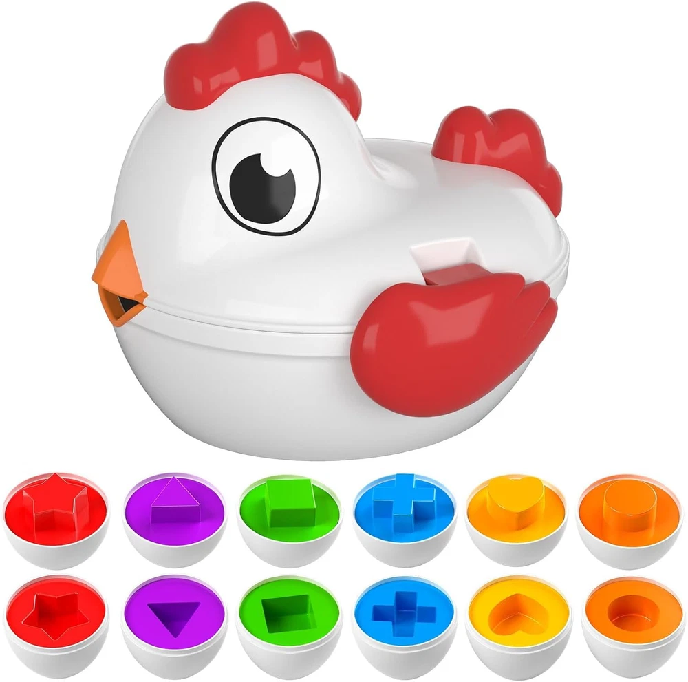 Sorting and Matched Toys: The sorting toys includes a hen-shaped case with wings and 6 easter eggs, which contains a different color and shape. An good learning toy for kids 3 4 5 6 7 8 year old to have shape sorter with fine motors and sensory skills Learning Recognition: The 6 charming eggs with corresponding pegs and holes will help preschoolers. Play egg puzzle game together. These color recognition toys will improve kids' fine motor skills, color and shape recognition by sorting the matched eggs Fun and Educational: These smooth eggs are suitable for little fingers to grasp. They'll be able to click them together and pull them apart for 10000+ times, encouraging independent play. This educational toy is good for 18m, 2 and 3 year olds and up Easy Storage and Portable: Are you annoyed by toy parts scattered? Our toy eggs can be canstored quickly and neatly in the hen case. Close lid and lock wings to protect the play eggs. Suitable toys for outdoor and indoor activities for toddlers Gifts for Baby: Your boys and girls will be excited to find the infant toy. No only a fun shape sorter puzzle but also great easter eggs toy. You can draw a smile face or any color you like on the toy eggs. A nice choice on birthday and festivals Product Description The video showcases the product in use. The video guides you through product setup. The video compares multiple products. The video shows the product being unpacked. Egg Toys for Kids Merchant Video Easter Eggs Toy for Kids Nice birthday gift kids toys for 2 3 4 5 6 7 year old boys, girls, kids, babies, toddlers on birthdays, holidays. Learn Through Playing the Egg Toys 6 colorful eggs are stored in the toy. Every egg has its own color and shape. Use them to teach your kids recognize colors and shapes. This egg matched toy will stimulate their thinking and develop kids' fine motor skills, hand-eye coordination and color recognition ability. Multiple Ways to Play Children can paint all kinds of cute shapes on the Easter eggs toys and interact with friends and parents, which can enjoy more fun during the infant and toddlers time. Easy Storage and Portable All toy eggs can be stored quickly. Suitable for both indoor and outdoor play toy eggs. Designed with Smooth Edges Suitable for kids' small hands to hold and paint on the Easter sensory toys.