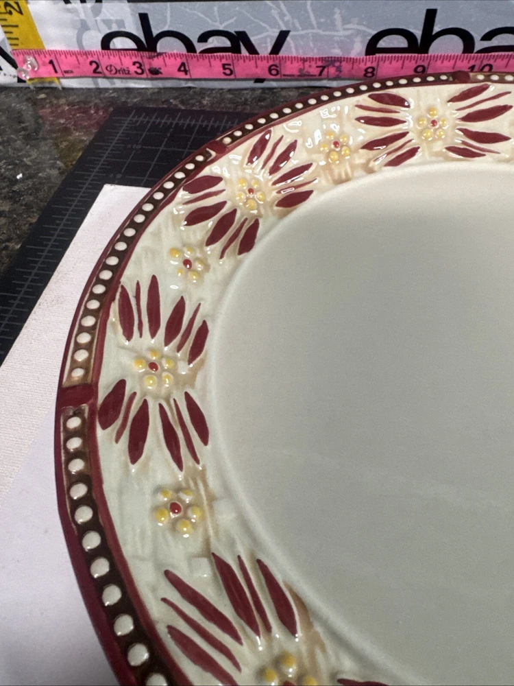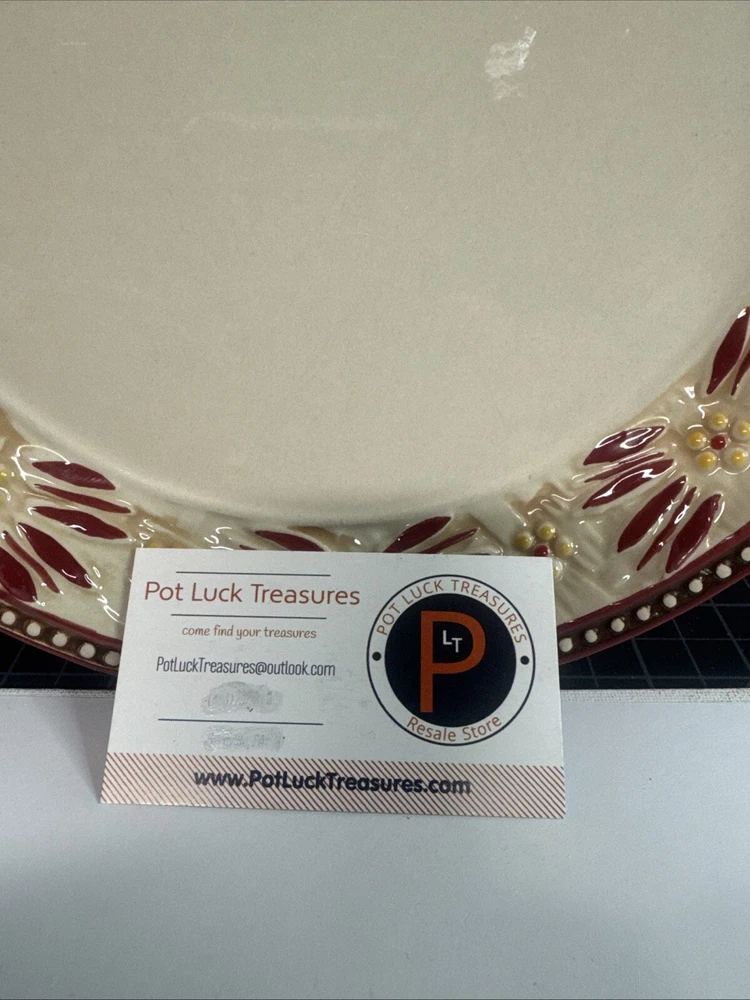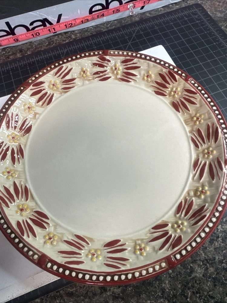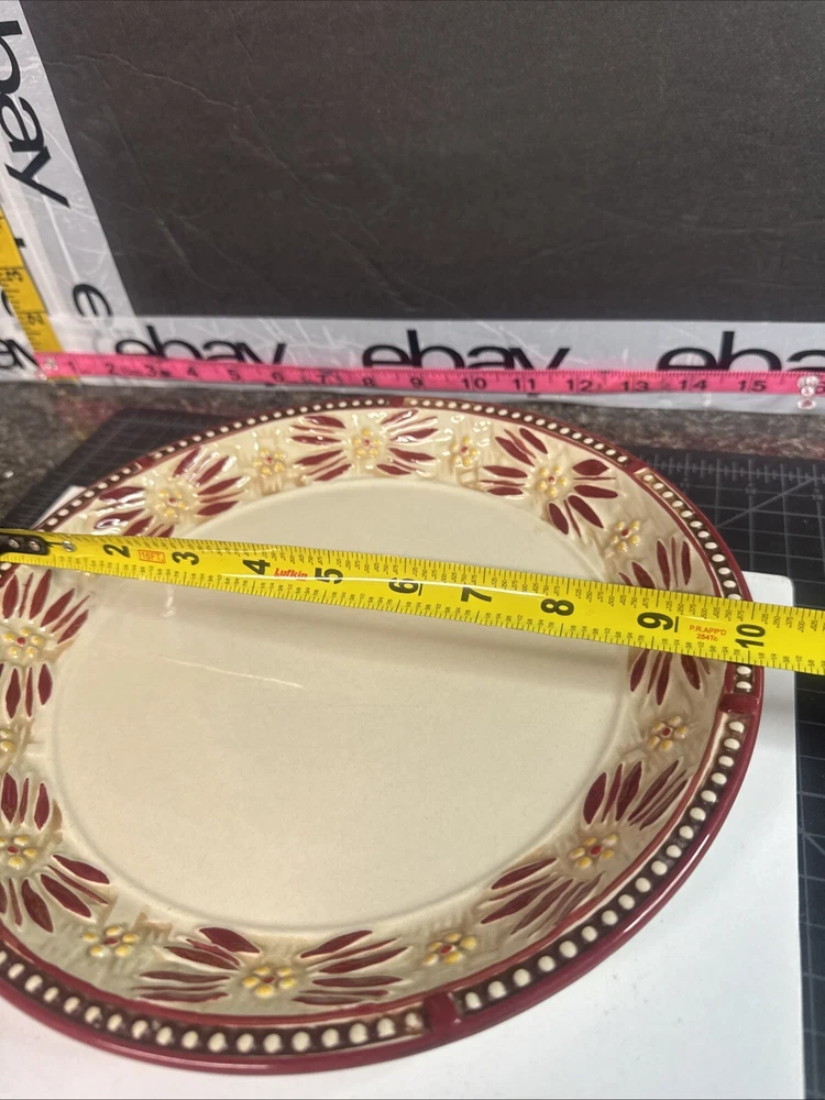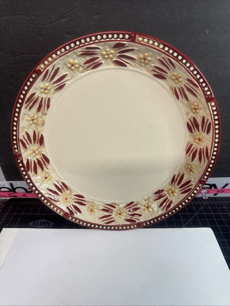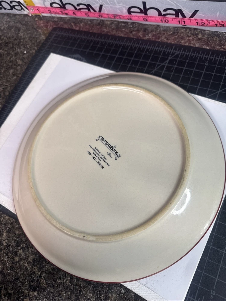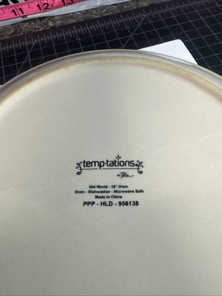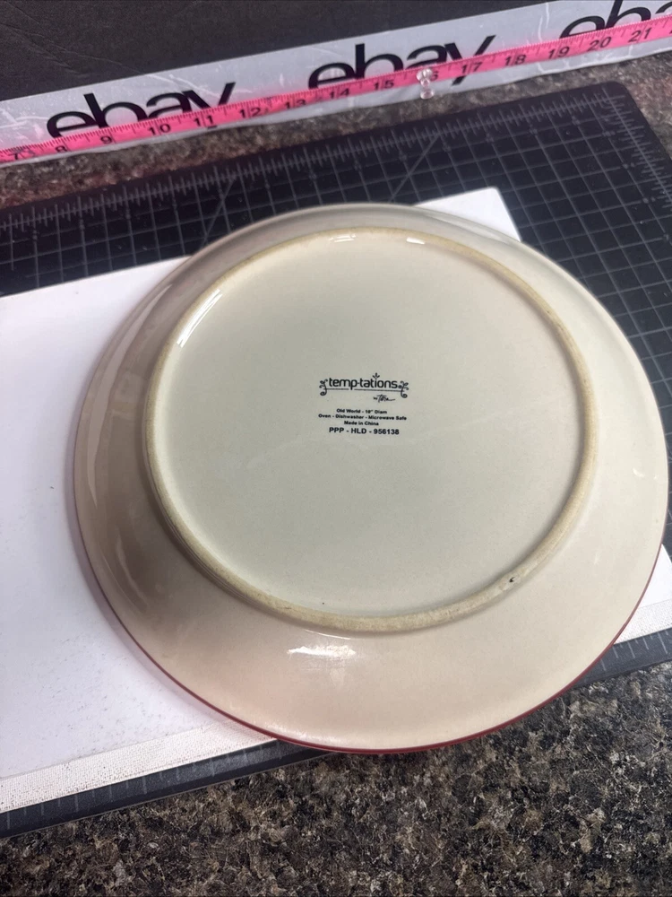 Production Style: Earthenware Handmade: No Features: Dishwasher Safe, Microwave Safe, Oven Safe Country/Region of Manufacture: China Set Includes: Plate Set Color: Red Origin: America Backstamp: Printed Brand: TEMPTATIONS Type: Dinner Plate Vintage: No MPN: 956138 Product Line: Old World Basketweave Material: Stoneware Production Technique: Pottery Shape: Round Pattern: Floral Occasion: All Occasions Theme: Flower, Basket Weave Time Period Manufactured: 2010-2019 Original/Licensed Reproduction: Original Finish: Glossy