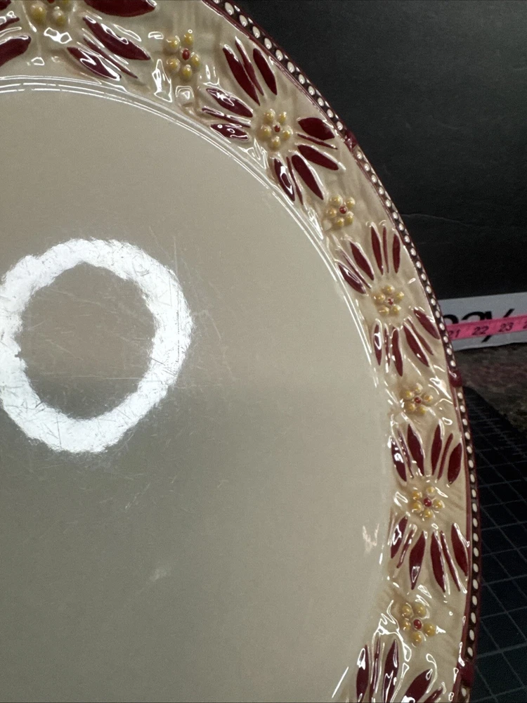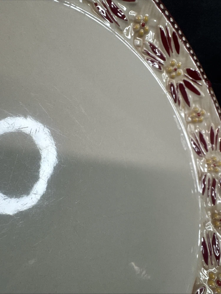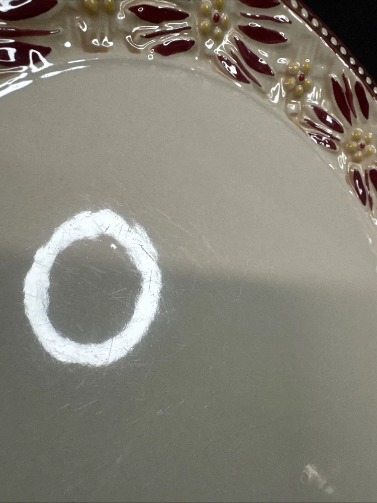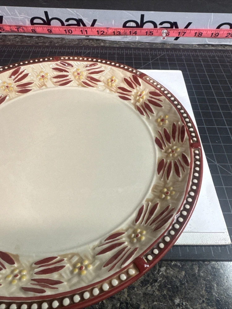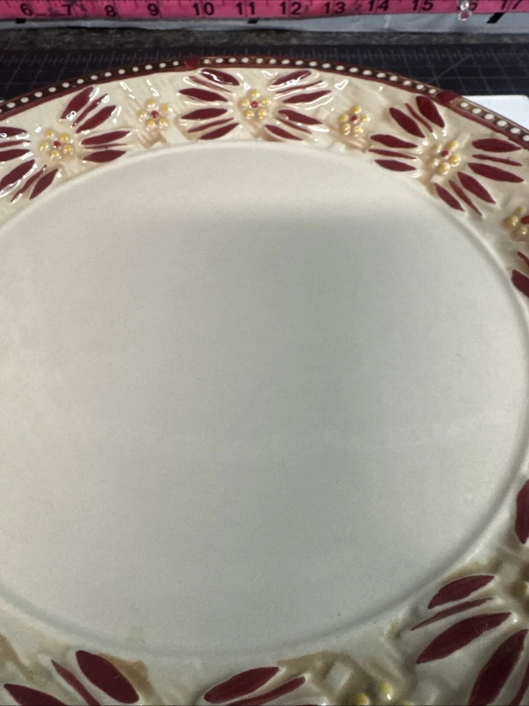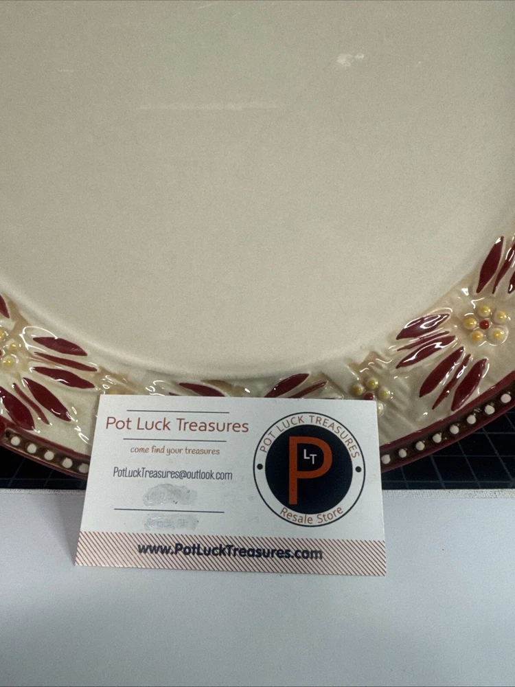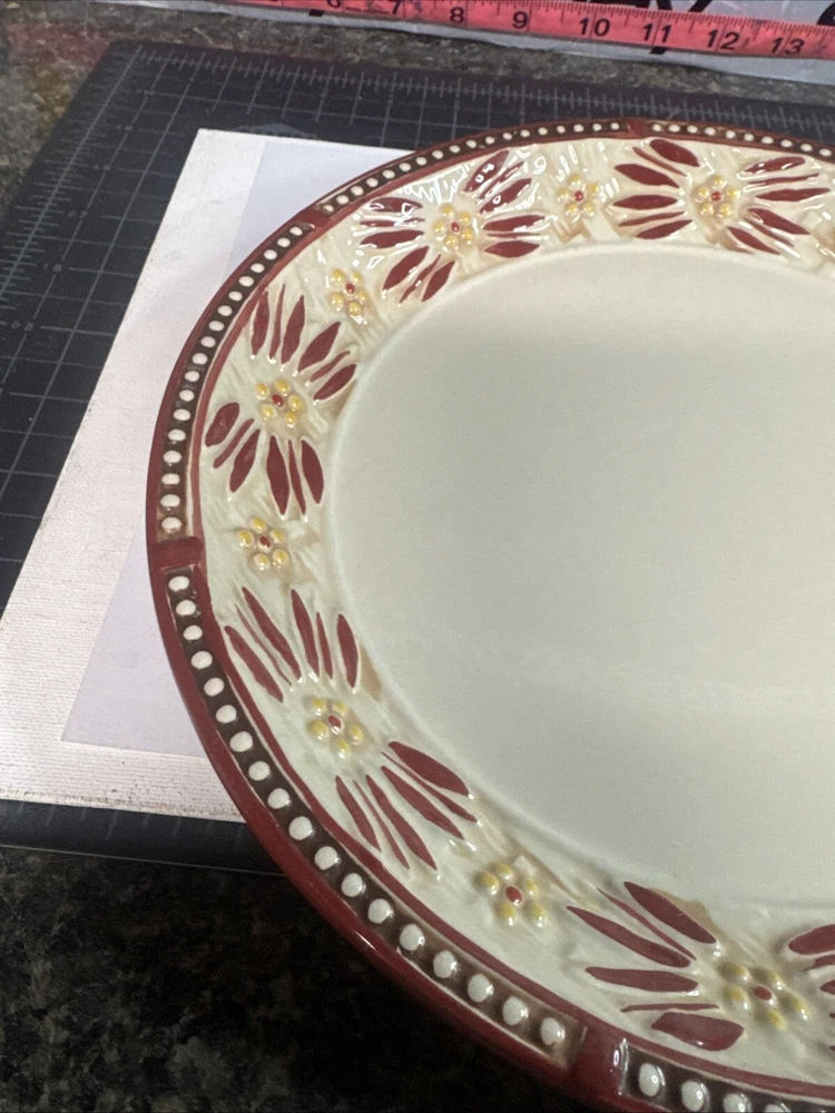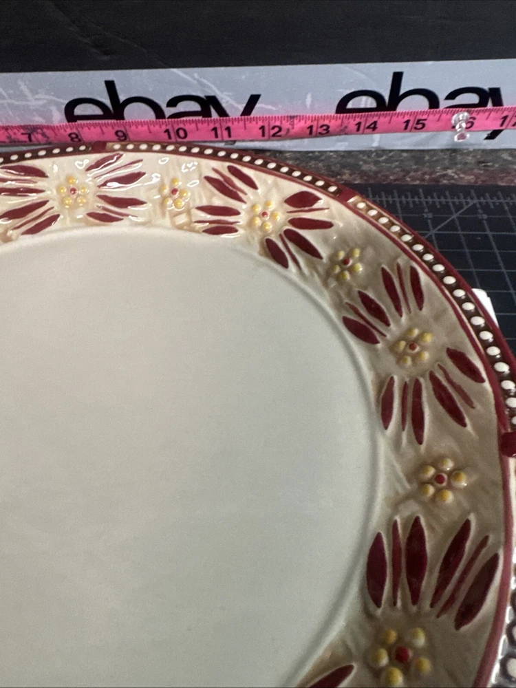 Production Style: Earthenware Handmade: No Features: Dishwasher Safe, Microwave Safe, Oven Safe Country/Region of Manufacture: China Set Includes: Plate Set Color: Red Origin: America Backstamp: Printed Brand: TEMPTATIONS Type: Dinner Plate Vintage: No MPN: 956138 Product Line: Old World Basketweave Material: Stoneware Production Technique: Pottery Shape: Round Pattern: Floral Occasion: All Occasions Theme: Flower, Basket Weave Time Period Manufactured: 2010-2019 Original/Licensed Reproduction: Original Finish: Glossy
