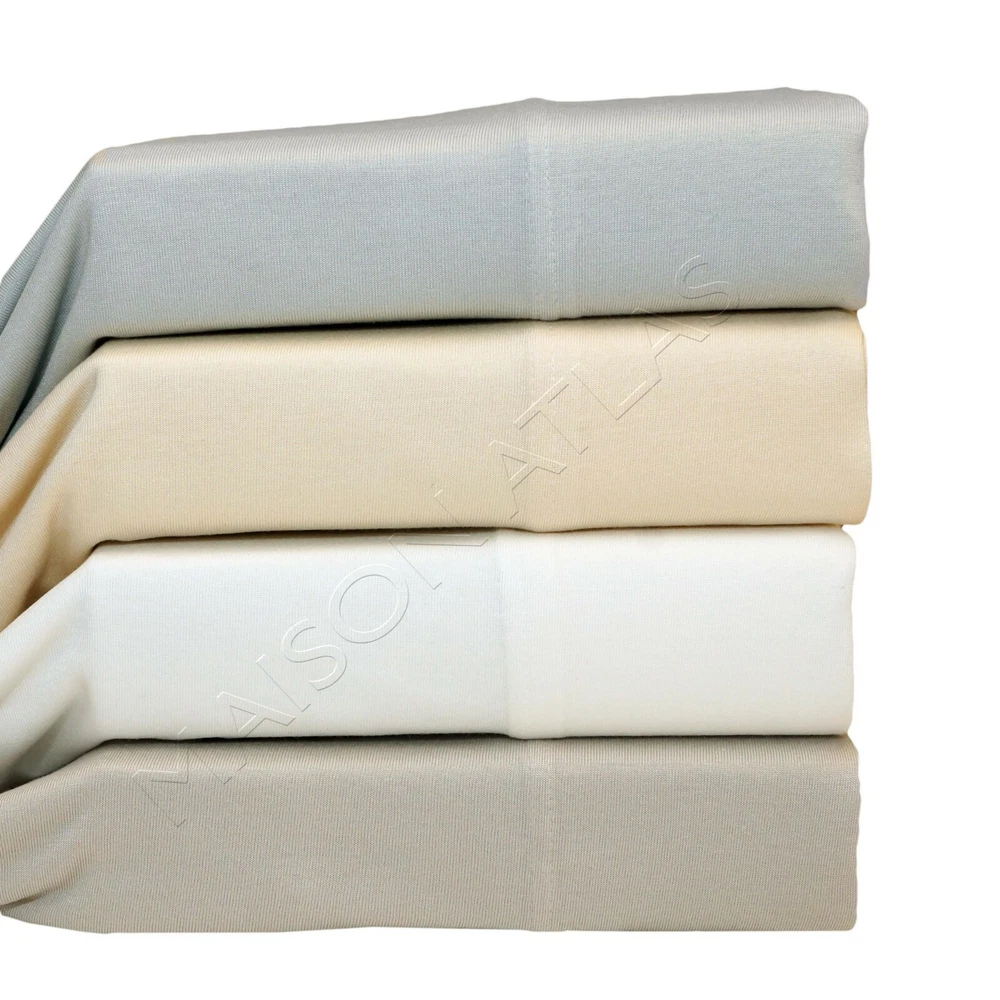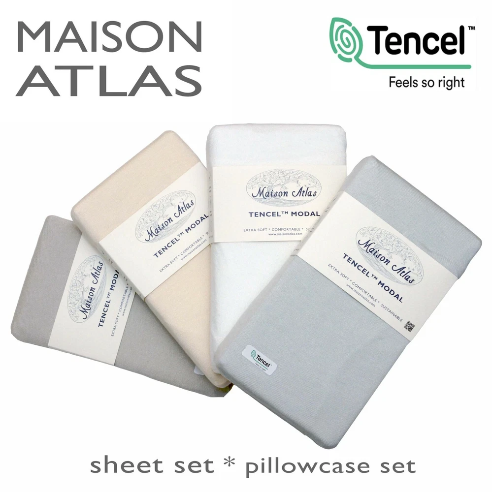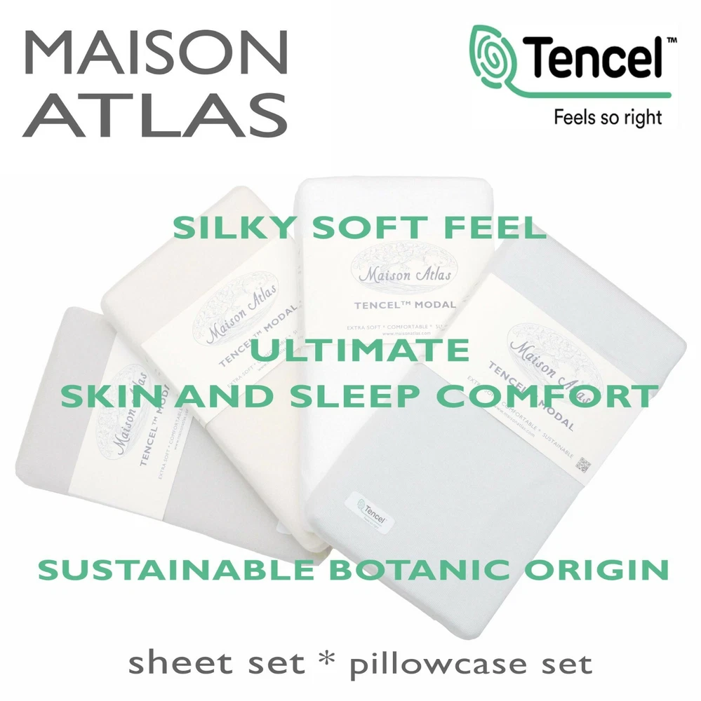 Tencel Modal Jersey Sheet Sets and Pillow Cases By MAISON ATLAS · Made of 100% TENCEL MODAL fiber of Lenzing Austria. · SOFTEST sheets available, true silk feel with Eco Soft technology. · FEEL cool and fresh in summer, warm and cozy in winter with this BREATHABLE, TEMPERATURE REGULATING FABRIC. · WICKS MOISTURE 50% more effectively than cotton, keeping you comfortable as you sleep. · Packed in FREE Tencel Modal STORAGE BAG. · Stunningly soft fibers are PERFECT FOR SENSITIVE SKIN · Fabric is perfectly SMOOTH compared to cotton, wool, and linen. · All around elastic ensures a secure fit · A LEADER IN SUSTAINABILITY, Tencel fibers are produced from pure beech and eucalyptus pulp from sustainably managed sources, committed to preserving the earth. · GENUINE ARTICLE for a fraction of the retail store price. Package contents · Twin / Twin XL SHEET SET includes: 1 flat sheet, 1 fitted sheet, and 1 pillowcase , · Full / Queen / King / California King SHEET SET includes 1 flat sheet, 1 fitted sheet, and 2 pillowcases . · Packed in FREE Tencel Modal STORAGE BAG. Additional matching Tencel Modal Pillowcases available in a different listing. Buy more, save more. Pa Colors conn · WHITE: Timeless classic for a clean airy look · IVORY: Timeless classic · LIGHT GRAY: Lightest shade of gray - Designer Favorite · MISTY LIGHT BLUE: Lightest shade of blue with a hint of gray. Designer Favorite. Calming effect. “A Thing of Beauty Is a Joy Forever.” conn · If you enjoy high quality, ultra-soft textiles also check our MAISON ATLAS Premium VELVET Collections (Charlotte, Jewel, and Solid.) · At Maison Atlas, we are totally committed to keeping you happy about our products and our service. Once you have had the pleasure of owning and using our products, we hope that you will purchase Maison Atlas home products for life.