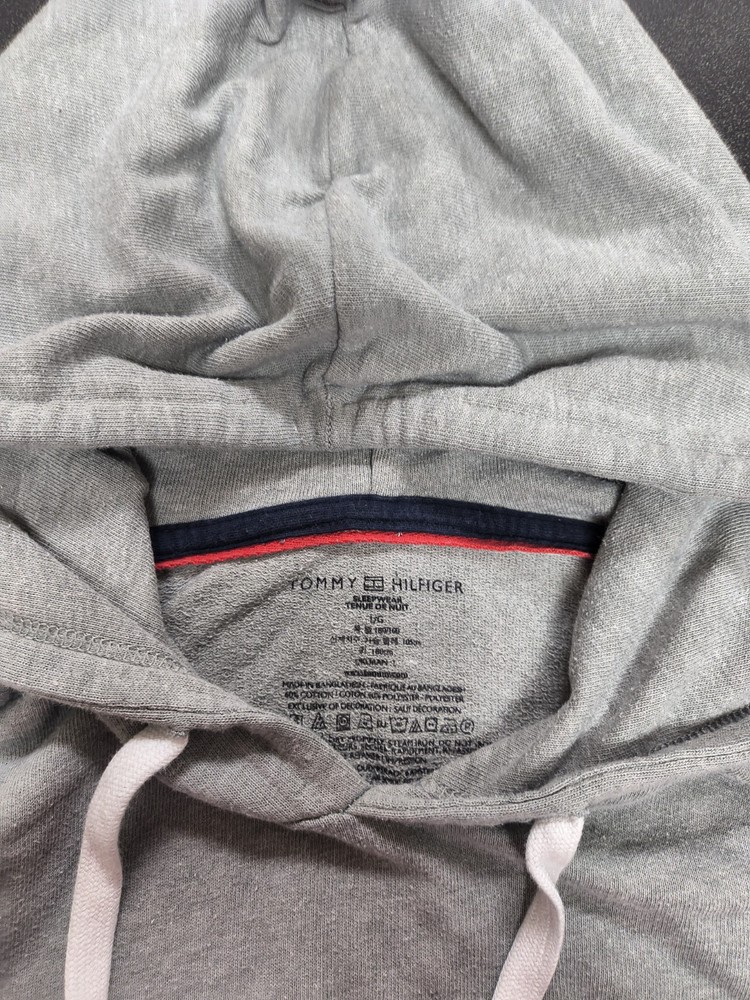 This pre-owned Tommy Hilfiger Hoodie in size L features long sleeves and a pullover style. The gray hoodie is made of a blend of polyester and cotton, with a fabric type of cotton, suitable for machine washing. It has a regular fit and is designed for men's casual wear, perfect for activities like walking. The hoodie does not have vintage characteristics and is crafted in the United States by the renowned brand Tommy Hilfiger.