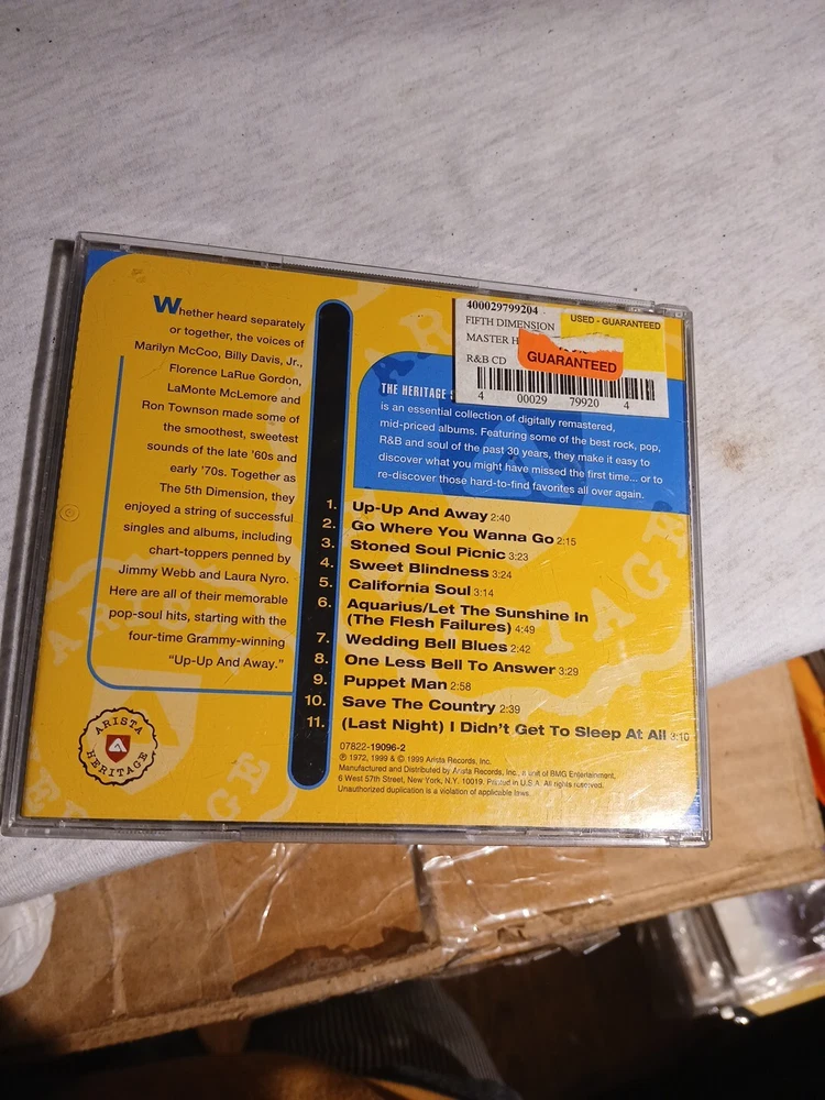 This CD album is a must-have for fans of The 5th Dimension and lovers of Afrobeat, Motown, and Pop R&B music. The album features a collection of their greatest hits and is still sealed in its original packaging. The CD grading is Very Good (VG) and the case type is a Standard Jewel Case. The inlay condition is Very Good (VG) as well. The record label is Arista and the release title is THE 5TH DIMENSION MASTER HITS. The CD format is a First Edition and the case color is Multicolor. The album is perfect for anyone who enjoys alternative, soul, and R&B & Soul music. This product is categorized under Music and CDs.
