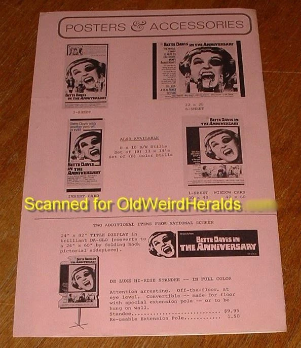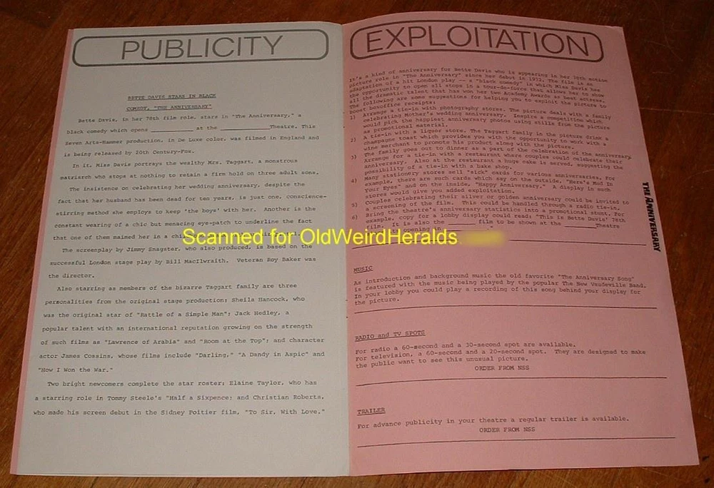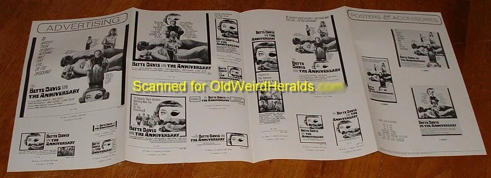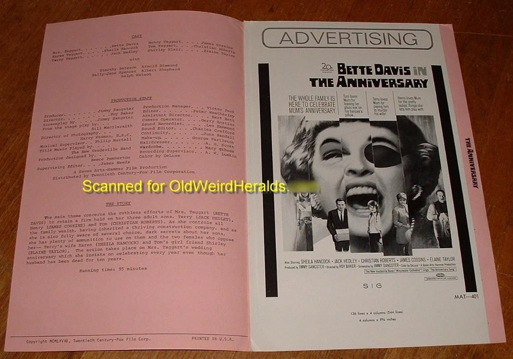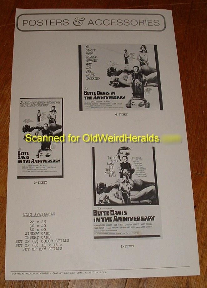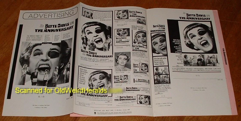 THE ANNIVERSARY MOVIE PRESSBOOK LOT 1968 BETTE DAVIS Wears EYE PATCH 2pc, UN-Cut