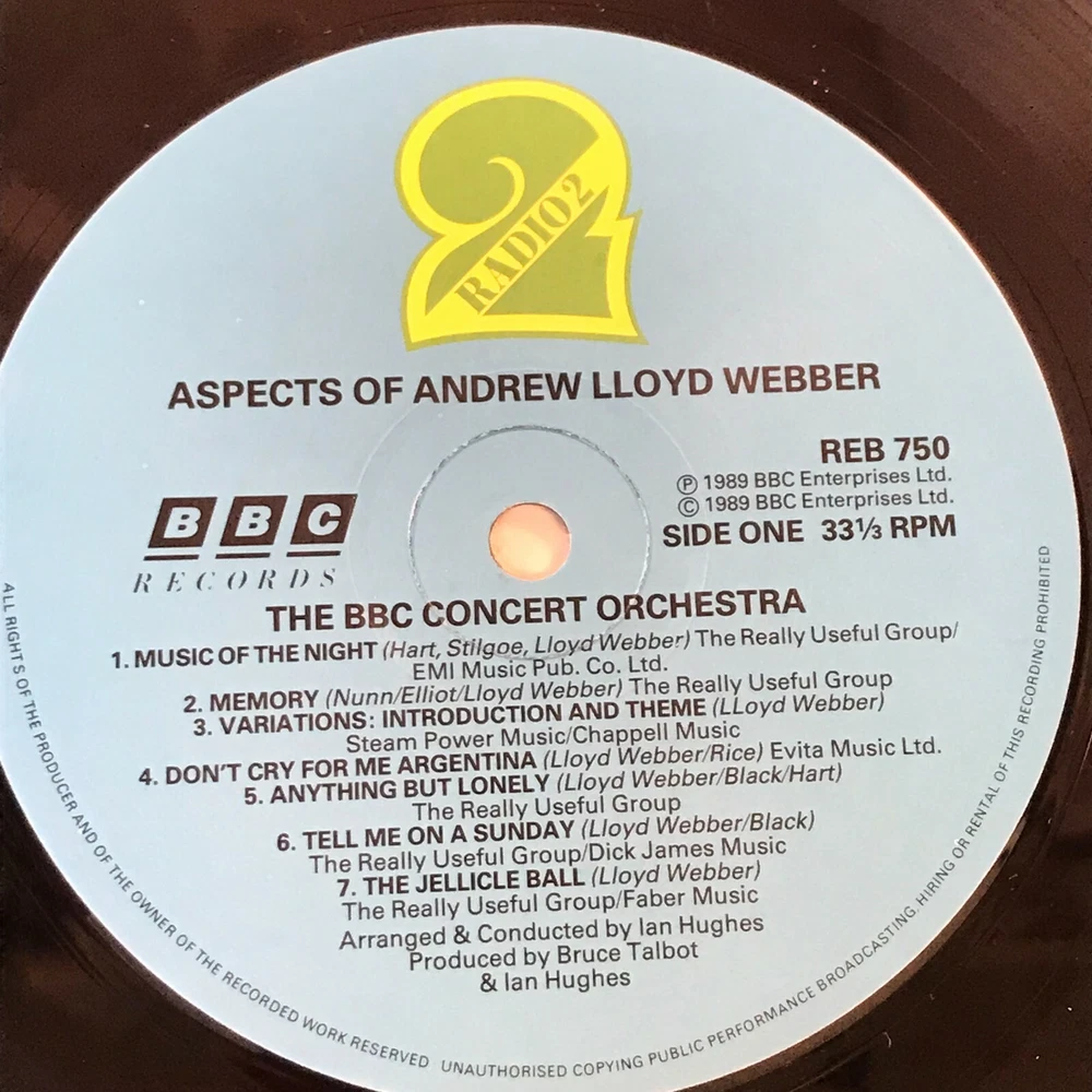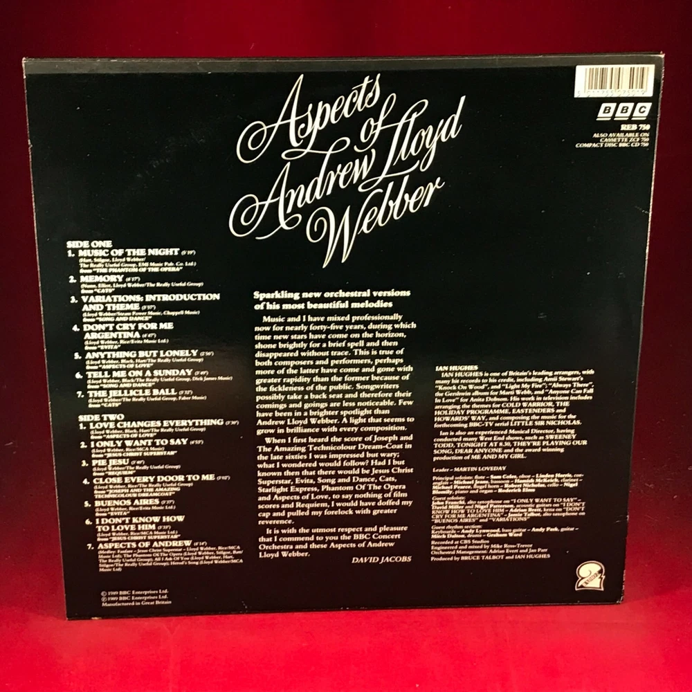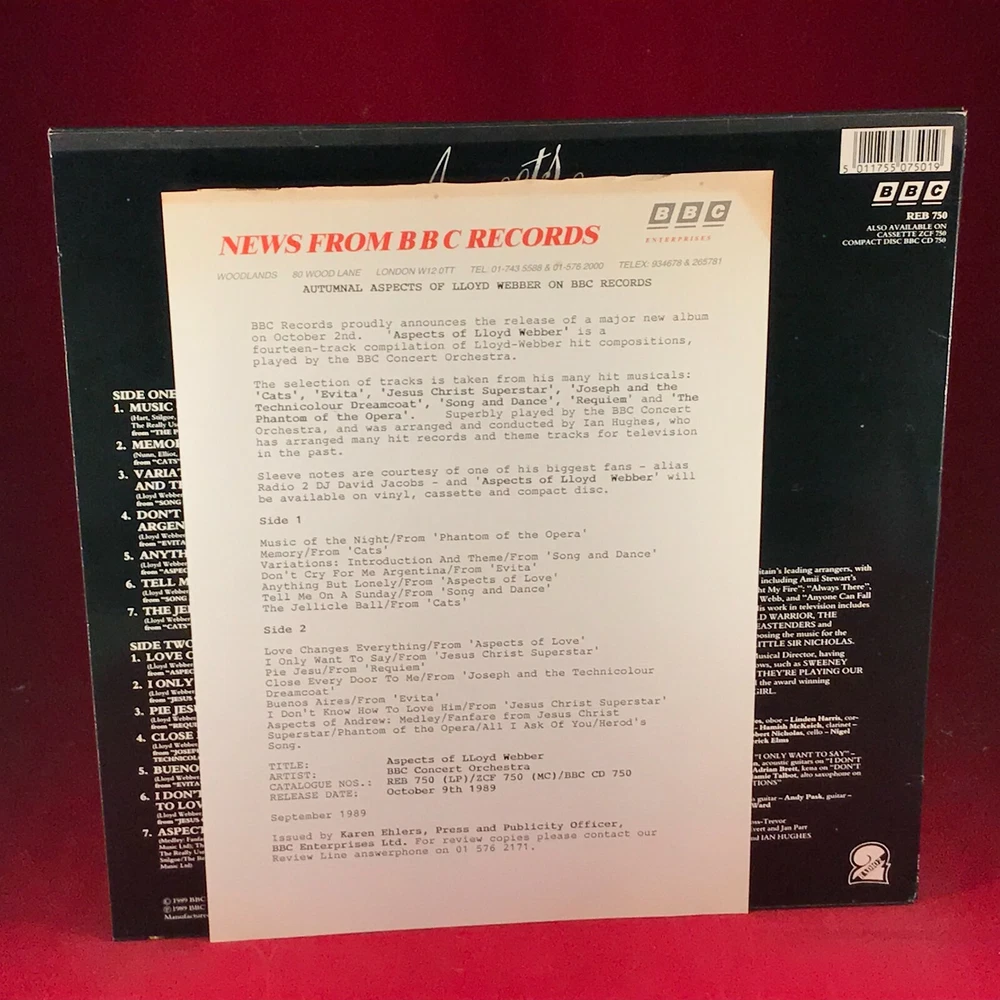 THE BBC CONCERT ORCHESTRA conducted by IAN HUGHES Aspects Of Andrew Lloyd Webber - 1989 UK vinyl LP, with sleeve notes from David Jacobs. Complete with BBC records press release. REB750 01. Music Of The Night 02. Memory 03. Variations: Introduction & Theme 04. Don't Cry For Me Argentina 05. Anything But Lonely 06. Tell Me On A Sunday 07. The Jellicle Ball 08. Love Changes Everything 09. I Only Want To Say 10. Pie Jesu 11. Close Every Door To Me 12. Buenos Aires 13. I Don't Know How To Love Him 14. Aspects Of Love Record Condition : Excellent Sleeve : Minor shelfwear (see photo) Please check out our other items !