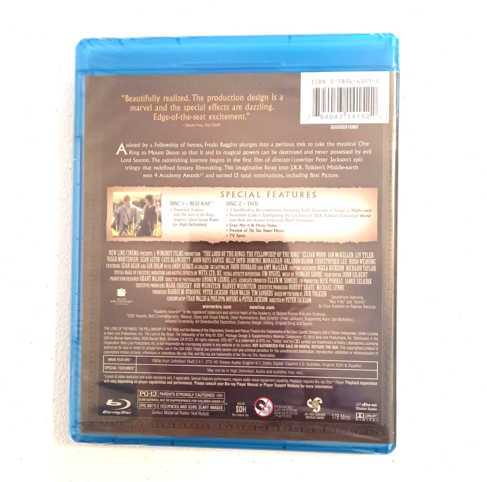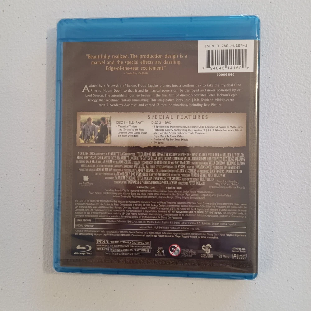 Run Time:178 min.Aspect Ratio:2.40:1Movie/TV Title:The Lord of the Rings: The Fellowship of the RingRelease Year:2001Genre:Action & AdventureSub-Genre:FantasyStudio:New Line Home Videogtin13:0794043141522Format:Blu-rayRating:PG-13UPC:0794043141522