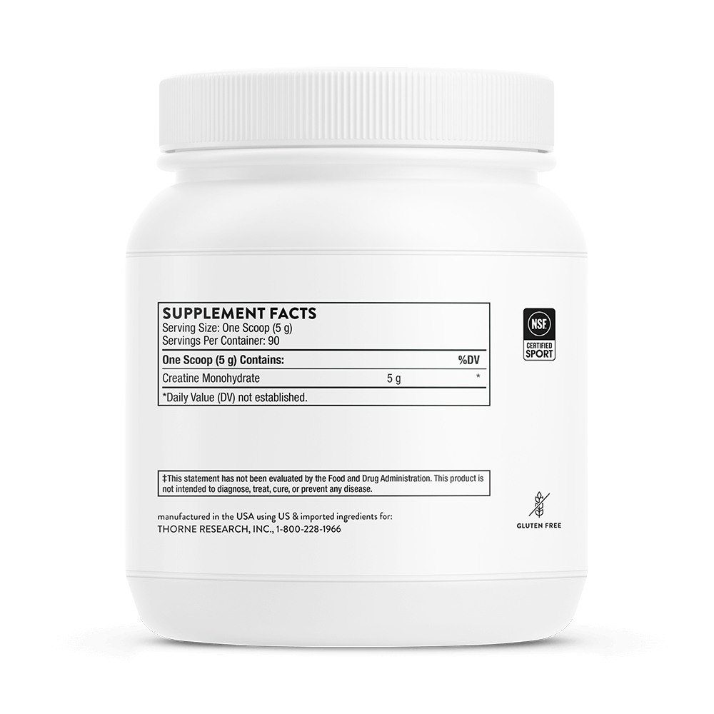 Item Weight:16 ozAge Range (Description):AdultIngredients:Creatine MonohydratePrimary Supplement Type:Creatine MonohydrateType of Diet:Gluten FreeVolume:16 fl ozFormulation:PowderItem dimensions L x W x H:8.06 x 4.74 x 5 inchesType:CreatineProduct Benefits:Muscle Mass, Endurance, Cellular Energy, and Brain Function*Unit Count:16.0 OunceFeatures:Gluten-FreeItem Form:PowderBrand:ThorneFlavor:UnflavoredActive Ingredients:Creatine MonohydrateDiet Type:Gluten Free