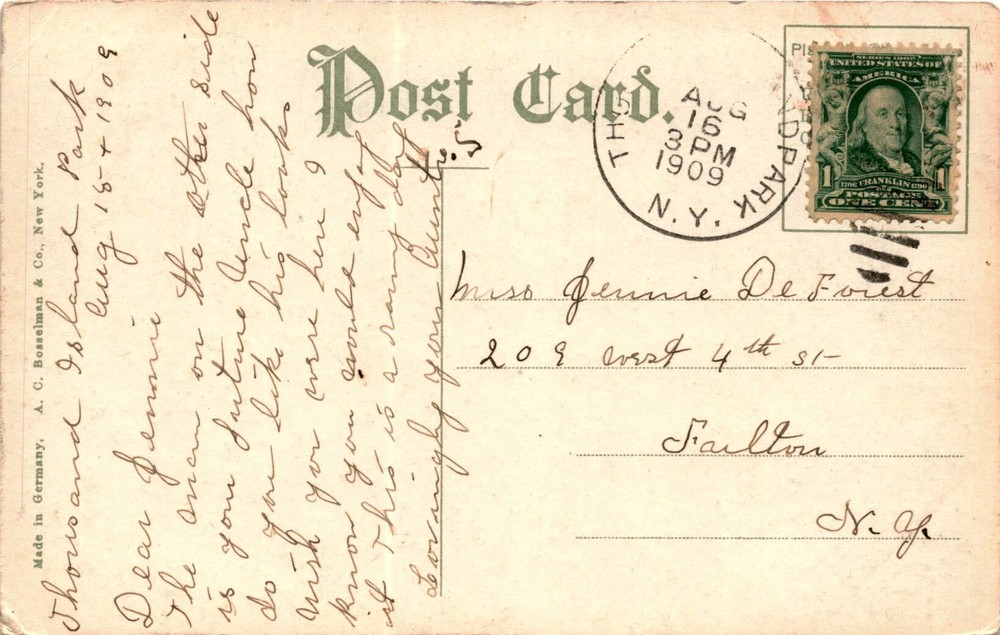 MAKE AN OFFER. THE MORE YOU BUY THE BETTER DEAL I WILL ACCEPT The postcard features an image of the Thousand Island Yacht Club on Welcome Island in New York, with a message to Jennie from August 18, 1906. The sender mentions missing Jennie and expresses a desire for her to see the place. The postcard was made in Germany by A.C. Bosselman & Co. of New York.