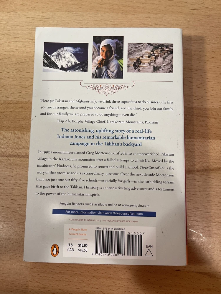 Item Length:8.4 inBook Title:Three Cups of Tea : One Man's Mission to Promote Peace ... One School at a TimeItem Height:0.8 inGenre:Political Science, Sports & Recreation, Social Science, Education, HistoryISBN:9780143038252Subject:HumanitarianPublisher:Penguin Publishing GroupPublication Year:2007Topic:Ngos (Non-Governmental Organizations), General, Mountaineering, Women's Studies, Asia / India & South Asia, Disasters & Disaster Relief, EssaysItem Weight:12.6 OzFormat:Uk-B Format PaperbackItem Width:5.5 inNumber of Pages:384 PagesAuthor:Greg Mortenson, David Oliver RelinIllustrator:YesLanguage:Englishgtin13:9780143038252