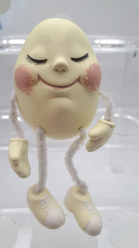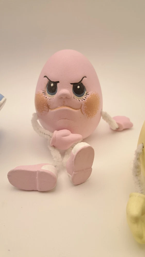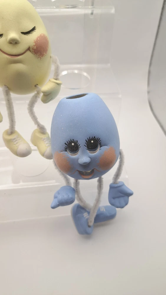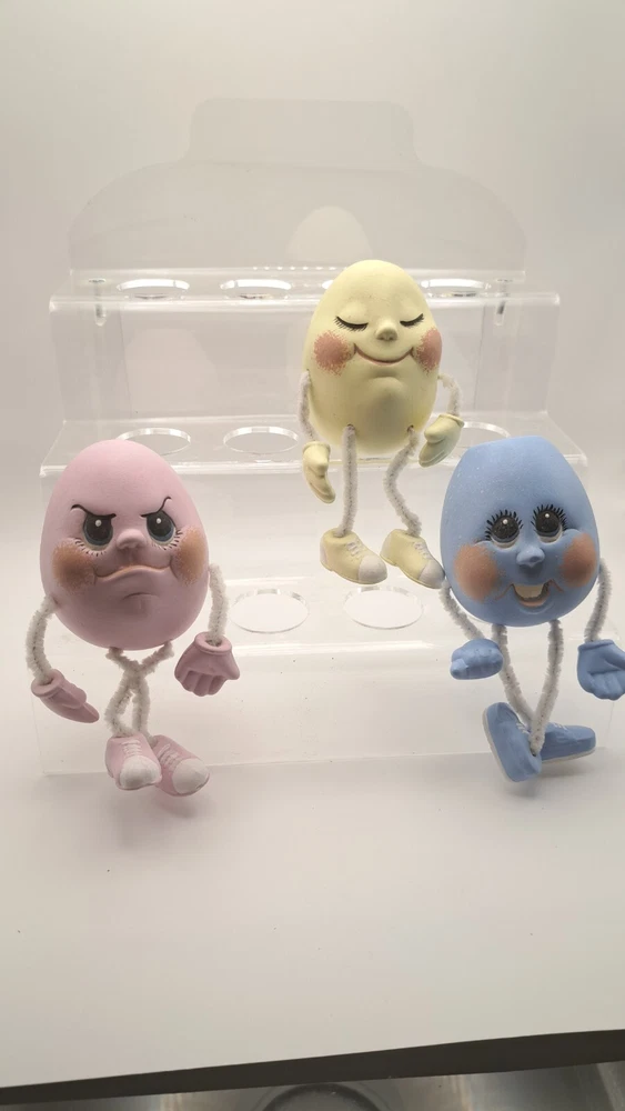 Add a touch of vintage charm to your Easter decor with these THREE ceramic noggin figurines. Each egg-shaped figurine features a unique anthropomorphic design, perfect for shelf sitting or adding whimsy to your holiday table. Pipe cleaner legs, to pose them as you like. Fun, whimsical , poseable decor, that will put a smile on your face.