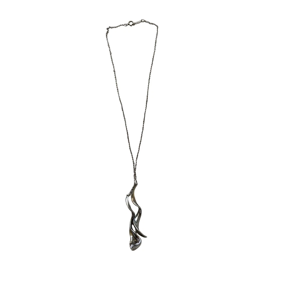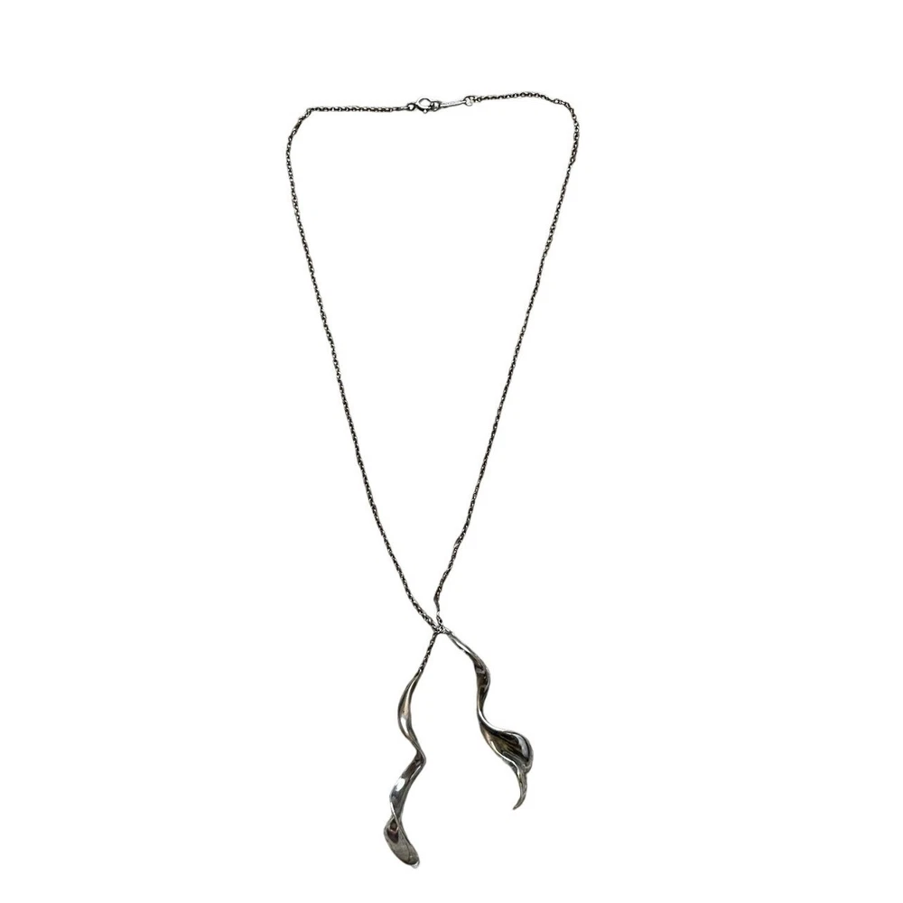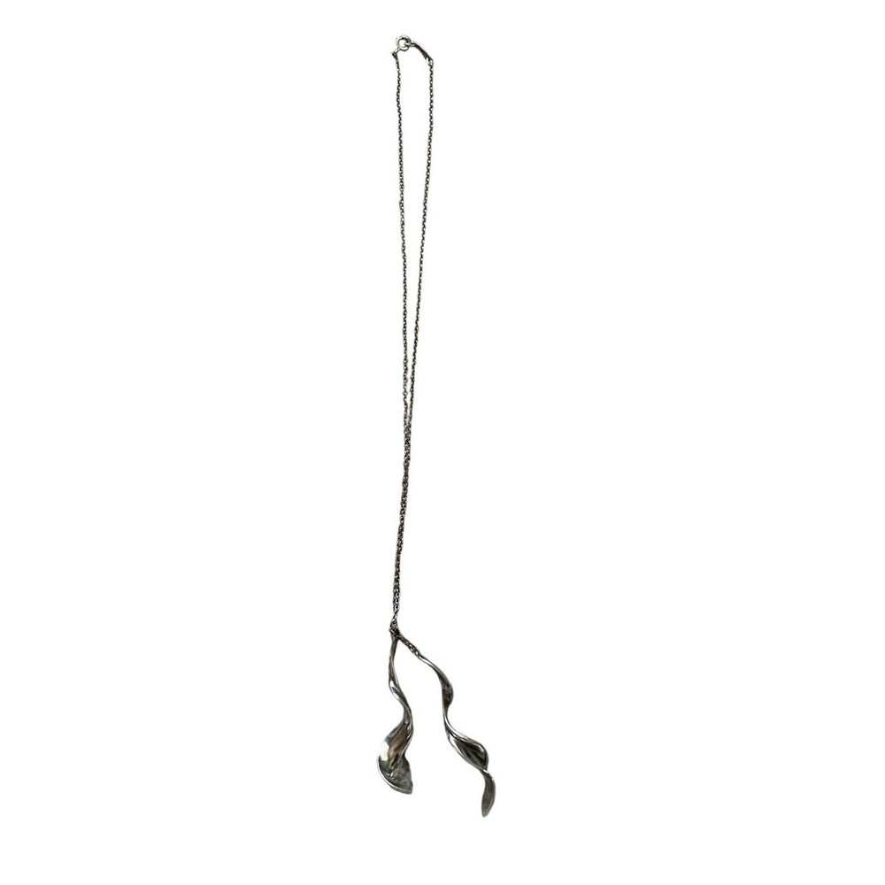 TIFFANY & CO Frank Gehry Double Orchid Pendant Necklace Sterling Silver 16 inches This piece is retired classic design with Sterling Silver Necklace and 2 drop spiral orchid pendants that are approximately 2 inches Staggered Stamped with Tiffany and Co and 925 on pendant and clasp Good used condition with Tiffany jewelry bag Keywords: Tiffany & Co, Classy, Classic, Rare, Retired design, Pendant necklace, Elegant, Feminine, Unisex, Timeless, Statement Necklace