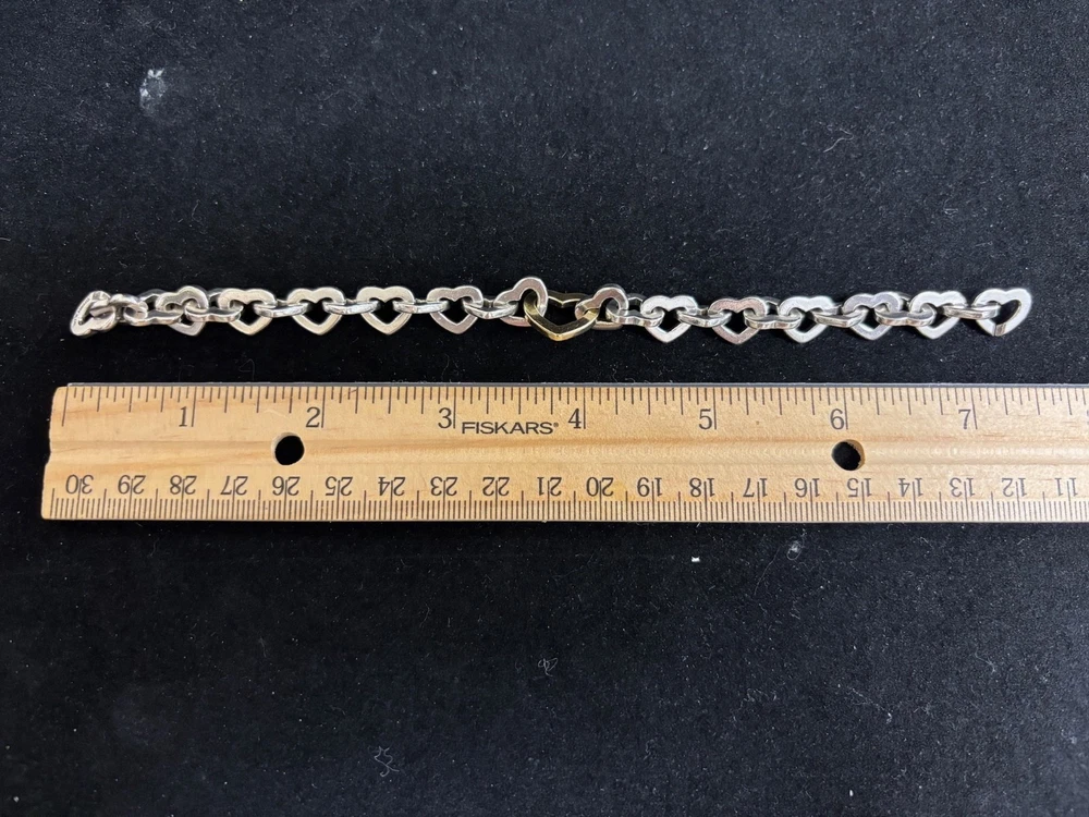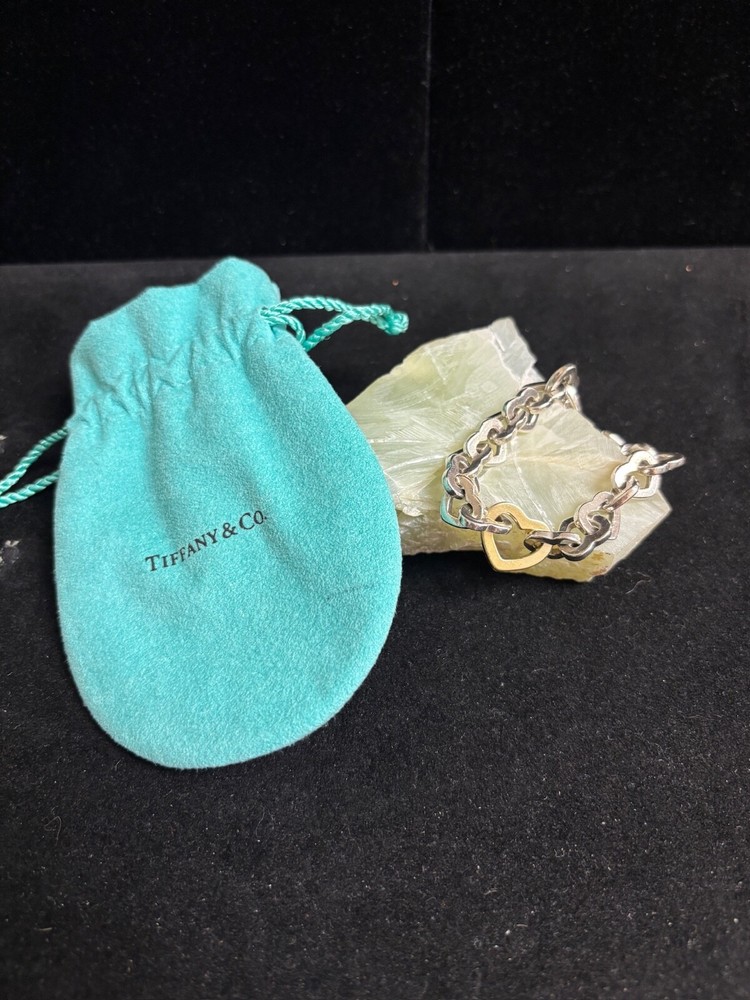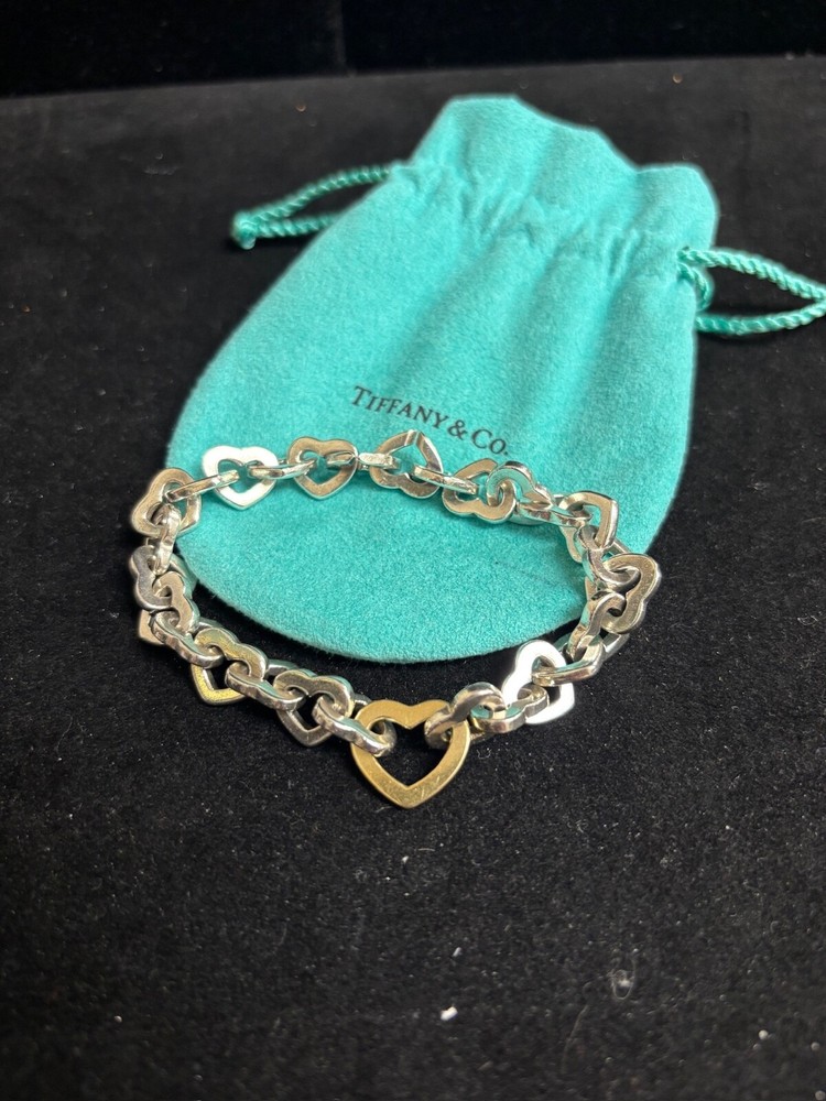 TIFFANY AND CO. 18K YELLOW GOLD AND 925 STERLING SILVER HEART LINKS BANGLE BRACELET APPROXIMATELY 7.5” END TO END. IN VERY GOOD CONDITION, WITH SOME MINOR SIGNS OF WEAR ON THE STERLING HEARTS. VERY SHINY AND LUMINOUS, THOUGH. PLEASE REFER TO THE INCLUDED PHOTOS TO HELP INFLUENCE YOUR DECISION. I MAY STILL HAVE THE CHOKER LISTED THAT MATCHES THIS BRACELET.