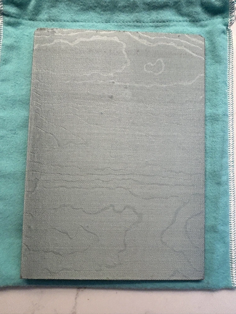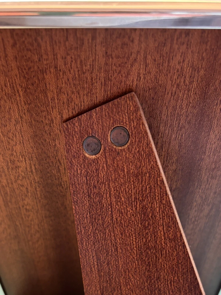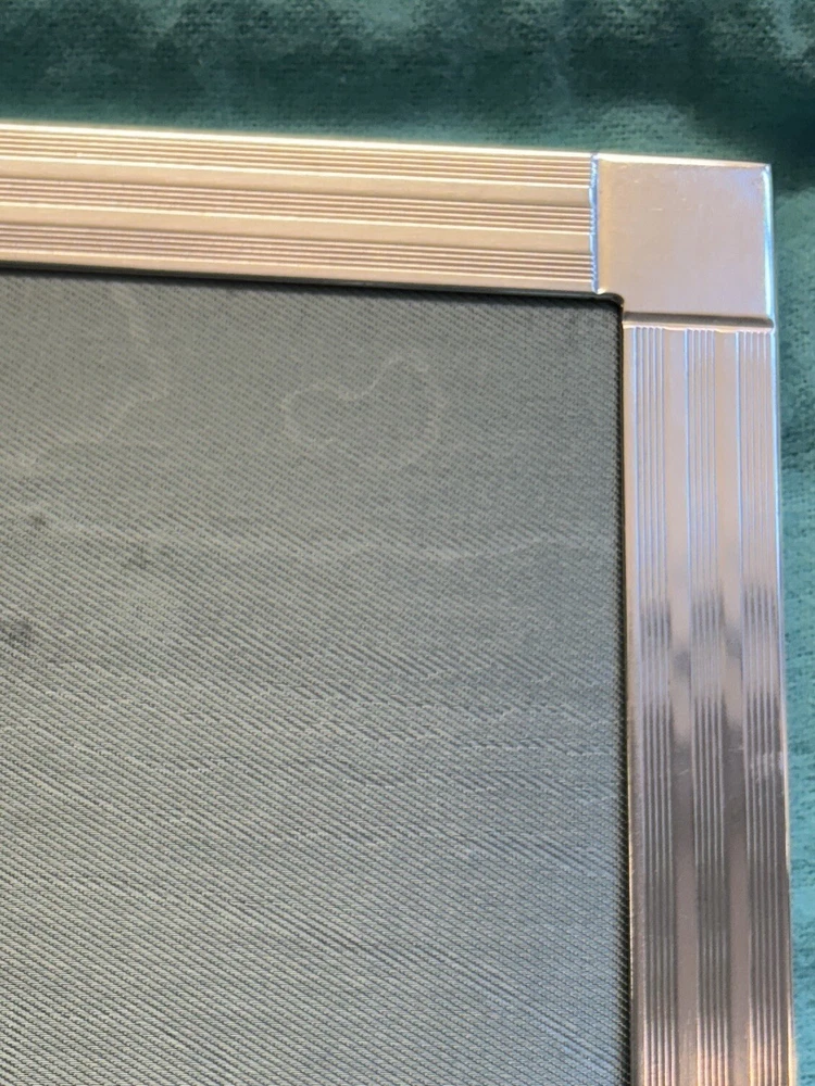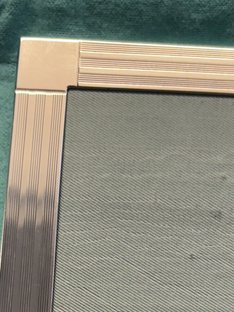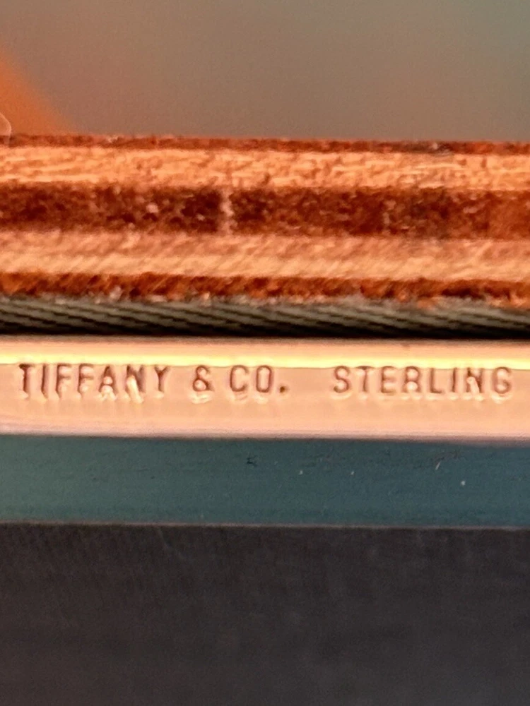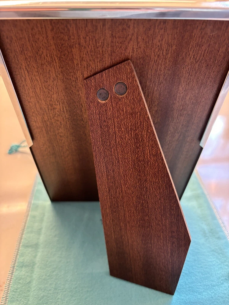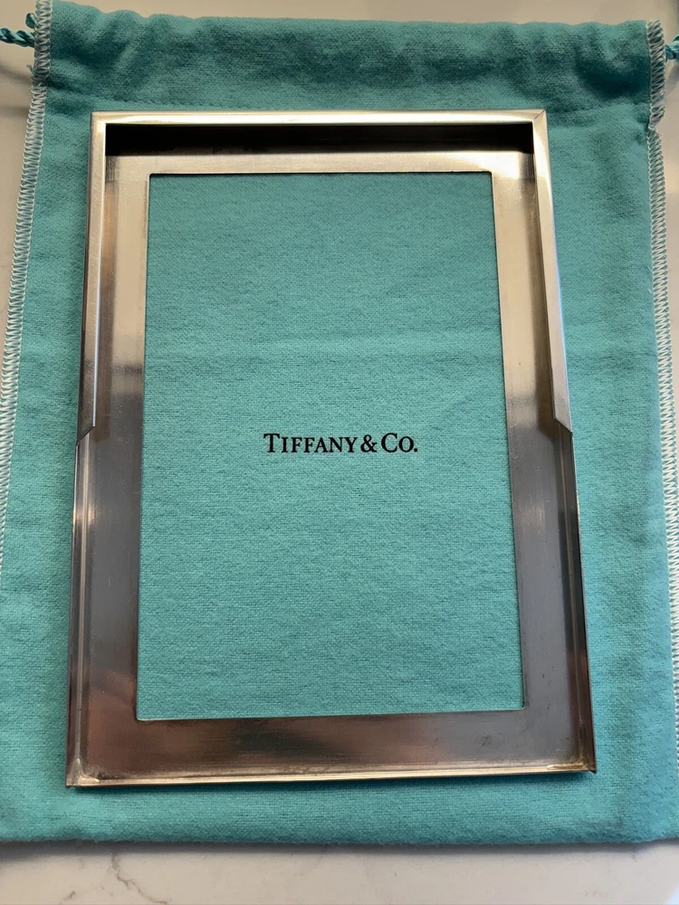 Tiffany & Co. Sterling Silver Engine-Turned Picture Frame 5x7" Vintage 1990s very good pre-owned condition. Art Deco style Engine-turned frame design features square corners and parallel lines. Reverse side and easel back fabricated from lacquered wood. Signed "Tiffany & Co Sterling .925 Made in Italy.” Frame holds a 5x7" photo with a 4x6" window. Interior fabric backing liner shows signs of wear visible when photo is not in place. See close-up photo for markings. This classic frame will fit in with any traditional or modern décor and can be displayed vertically or horizontally. Frame will be delivered packaged in original Tiffany Blue ® tarnish protection flannel bag. PLEASE NOTE: Frame will be shipped without original glass glazing unless specified by the buyer. Original glass is chipped at corners - see last two photos. If buyer specifies original glass to maintain integrity of the item, it will be packaged separately but seller takes no responsibility for condition. Sorry no international shipping.
