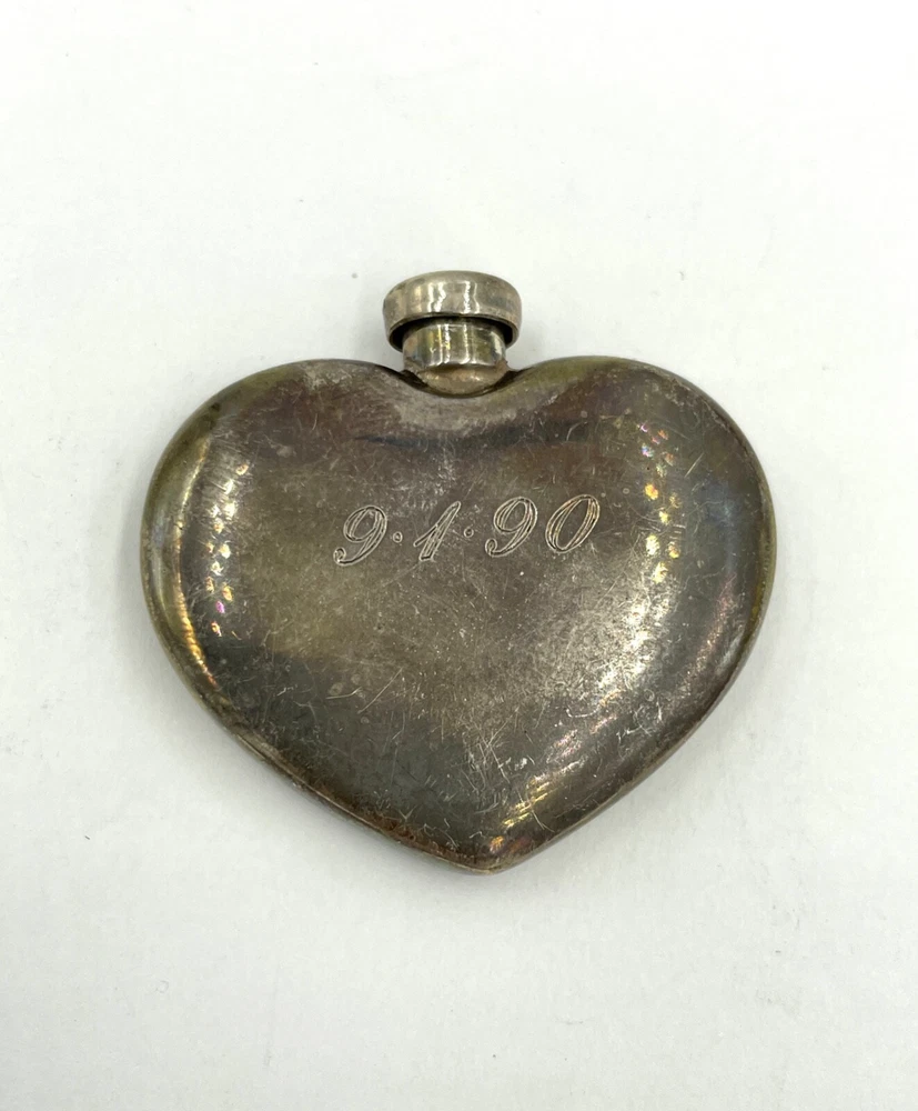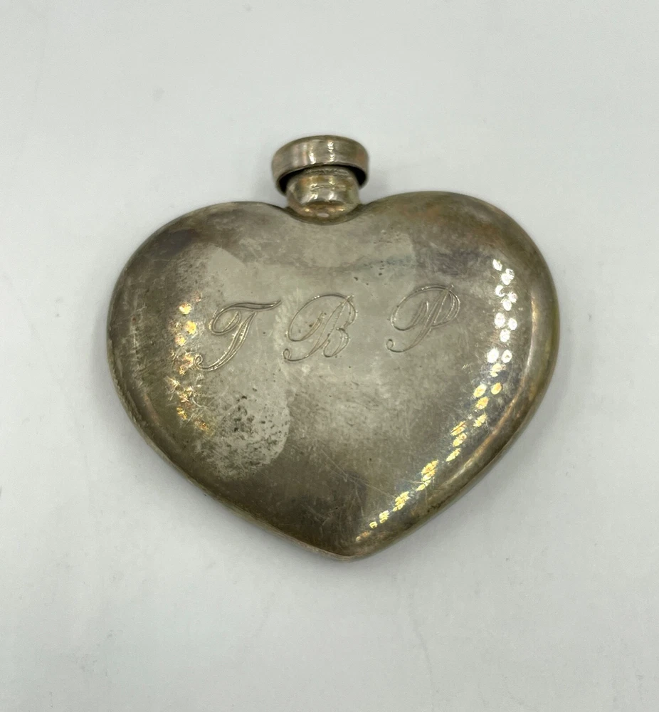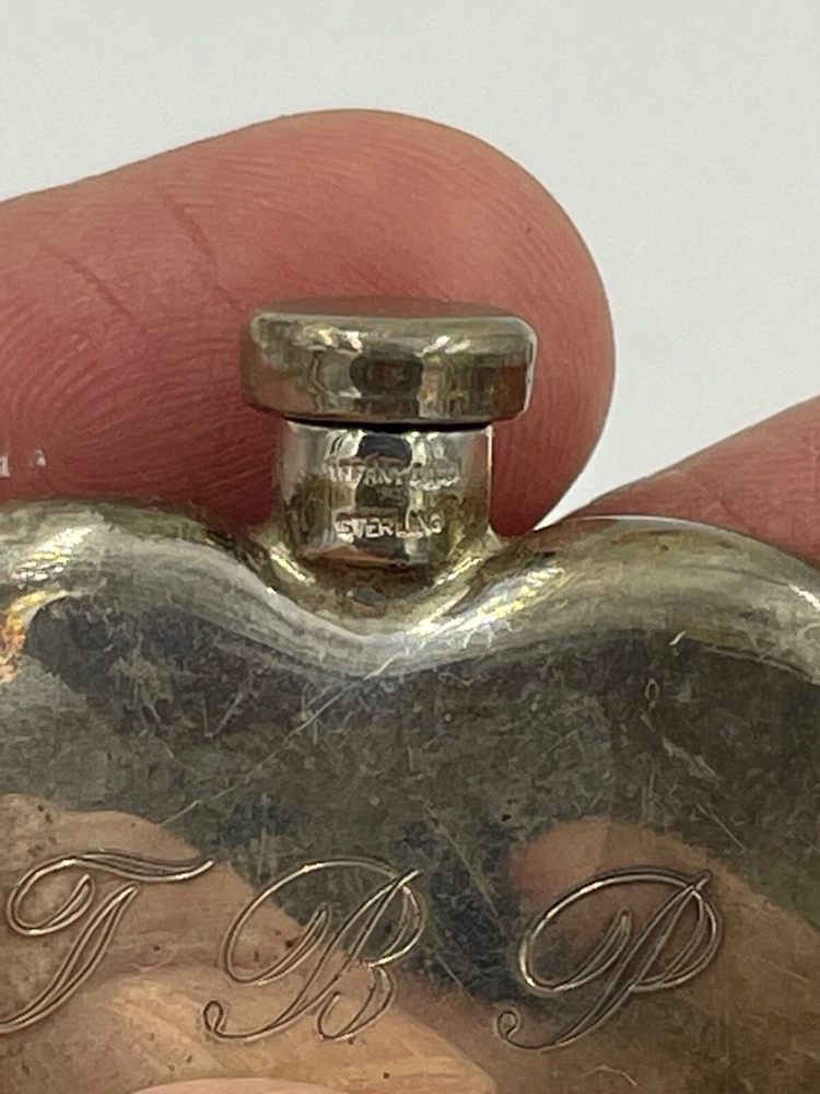 Mid Century Tiffany & Co. Heart shape perfume bottle flask with heavy patina throughout. It's monogrammed shown in the pictures, has light scrathces unpolished. We don't polish any of our vintage items we leave this up to the discretion of the buyer. It measures 1 3/4" by 1", weighing 16.7 grams. Monograms can be easily removed if desired. We are jewelers all of our items are professionally inspected and tested, we guarantee all of our items to be as described. We have many other hard to find items listed so please take a look, you never know what you might find. Thank you and happy shopping.