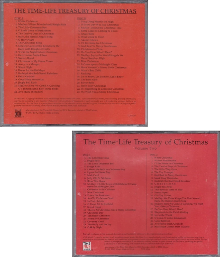 Hello & Welcome!!! To Cityguyinwa e b a y Listings ** All My Items Are in Stock ** ** Ships Fast to You ** This Item is a Lot 4 Various Artists CD's Released By: Time Life Music Featuring: 92 Original Tracks By the Original Artists Titled: Treasury of Christmas Volumes 1 & 2 Labels: Time Life Music Records All Items Manufactured in: USA Year of Releases: 1987 Total Tracks: 92 Classic Holiday Tracks on 4 CD's Each Front Booklet: Very Good + Each Back Insert: Very Good + Each CD: Very Good + Each Jewel Case: Very Good, Shows Light Storage Wear, No Cracks or Broken Hinges... Please See Complete Track List for Each CD, in This Listing Below , Track List: Volume 1: Disc 1: White Christmas - Bing Crosby Medley: Winter Wonderland/Sleigh Ride - Dolly Parton The Little Drummer Boy - Harry Simone Chorale O Little Town of Bethlehem - Andre Previn: Conducting The Twelve Days of Christmas - Roger Whittaker Hark, the Herald Angels Sing - Nat King Cole O Holy Night - Perry Como The Christmas Song - Carpenters Medley: Carol of the Bells/Deck the Halls With Boughs of Holly - Robert Shaw Chorale 'Twas the Night Before Christmas - Fred Waring & His Pennsylvanians Here Comes Santa Claus - Elvis Presley Santa's Beard - Beach Boys Christmas in My Home Town - Charley Pride Away in A Manger - Ed Ames Silent Night - Jim Reeves Home For the Holidays - Perry Como Rudolph the Red Nosed Reindeer - Gene Autry Feliz Navidad - Jose Feliciano Good King Wenceslas - Morton Gould & the RCA Symphony Orchestra Jingle Bell Rock - Bobby Helms Medley: Here We Come A-Caroling/Tannenbaum/I Saw Three Ships - Arthur Fiedler & the Boston Pops Ave Maria (Schubert) - Leontyne Price With the Choir of St. Thomas Episcopal Church, New York Track List: Volume 1: Disc 2: Ding Dong Merrily on High - Roger Whittaker If Every Day Was Like Christmas - Elvis Presley Rockin' Around the Christmas Tree - Brenda Lee Santa Claus is Coming to Town - Perry Como Jingle Bells - Jim Reeves What Child is This? - Andre Previn: Conducting Adeste Fideles - Luciano Pavarotti I'll Be Home For Christmas - Perry Como God Rest Ye Merry Gentleman - Julie Andrews Christmas in Dixie - Alabama Do You Hear What I Hear? - Bing Crosby Medley: Joy to the World/Angels We Have Heard on High - Robert Shaw Chorale Blue Christmas - Glen Campbell It Came Upon a Midnight Clear - Philadelphia Orchestra Chorus Robert Page, Conuctor Have Yourself a Merry Little Christmas - Judy Garland Mary's Boy Child - Harry Belafonte Rocking - Roger Whittaker Let it Snow, Let it Snow, Let it Snow - Lena Horne The First Noel - Sergio Franchi Silver Bells - Kate Smith Holly Jolly Christmas - Burl Ives It's Beginning To Look a Lot Like Christmas - Perry Como & the Fontane Sisters We Wish You a Merry Christmas - Philadelphia Orchestra & Chorus Eugene Ormandy, Conducting Track List: Volume 2: Disc 1: The Christmas Song - Nat King Cole Jingle Bells - Bing Crosby & the Andrews Sisters The Little Drummer Boy - Roger Whittaker Sleigh Ride - Arthur Fiedler & the Boston Pops I Heard the Bells on Christmas Day - Harry Belafonte Up on the House Top - Eddy Arnold Irish Carol - Julie Andrews Jolly Old St. Nicholas - Chet Atkins Bless This House - Perry Como Medley: O Little Town of Bethlehem/It Came Upon a Midnight Clear - Canadian Brass Christmas is For Children - Glen Campbell Blue Christmas - Elvis Presley Frosty the Snowman - Red Foley An Old Christmas Carol - Jim Reeves In Dulchi Jubilo - Vienna Choir Boys O Come All Ye Faithful - Ed Ames Silent Night - Sergio Franchi There's No Christmas Like a Home Christmas - Perry Como Christmas Day - Beach Boys Tennessee Christmas - Alabama Home For Christmas - Morton Gould& the RCA Symphony Orchestra Coventry Carol - Choir of King's College Cambridge The Holly & the Ivory - Roger Whittaker O Holy Night - Luciano Pavarotti Track List: Volume 2: Disc 2: White Christmas - Perry Como Winter Wonderland - Andrews Sisters I'll Be Home For Christmas - Bing Crosby The Twelve Days of Christmas - Robert Shaw Chorale The Gifts They Gave - Harry Belafonte The Toy Trumpet - Arther Fiedler, Al Hirt & the Boston Pops God Rest Ye Merry Gentlemen - Roger Whittaker Good King Wenceslas - Ames Brothers Rudolph the Red Nosed Reindeer - Bing Crosby C-H-R-I-S-T-M-A-S - Jim Reeves Jingle Bell Rock - Chet Atkins That Special Time of Year - Gladys Knight & the Pips Pretty Paper - Willie Nelson Old Toy Trains - Roger Miller Medley: We Three Kings/The First Nowell/Hark, the Herald Angels Sing - Robert Shaw Chorale Medley: Here We Come A-Caroling/We Wish You a Merry Christmas - Perry Como Do You Hear What I Hear - Ed Ames Shepherds in the Field Abiding - Choir of King's College Cambridge Joy to the World - Julie Andrews O Come, O Come Emmanuel - Virgil Fox Gesu Bambino - Luciano Pavarotti Ave Maria (Bach/Gounod) - Renata Tebaldi Hallelujah Chorus From Messiah - Robert Shaw Chorale & Orchestra Shipping Services By Media, First Class Or Priority Mail Thank You For Looking, Please Come Back Again Soon!!!