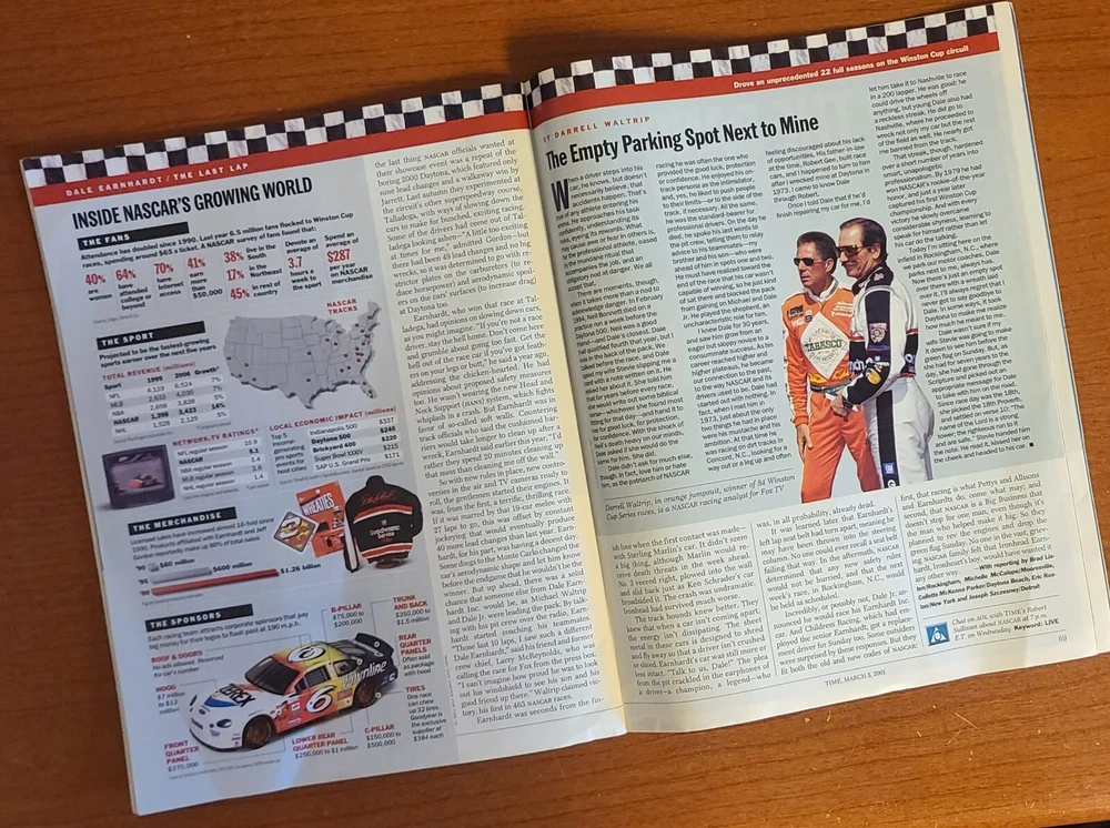 This issue of TIME magazine from March 5, 2001 features an in-depth look at the life and death of NASCAR legend Dale Earnhardt. The magazine provides a comprehensive overview of Earnhardt's career, including his rise to fame and his numerous accomplishments on and off the track. With vivid illustrations and captivating content, this edition of TIME is a must-have for fans of Earnhardt and NASCAR alike. Whether you're a longtime reader or a newcomer to the sport, this magazine is sure to provide hours of entertainment and insight into the fascinating world of racing.