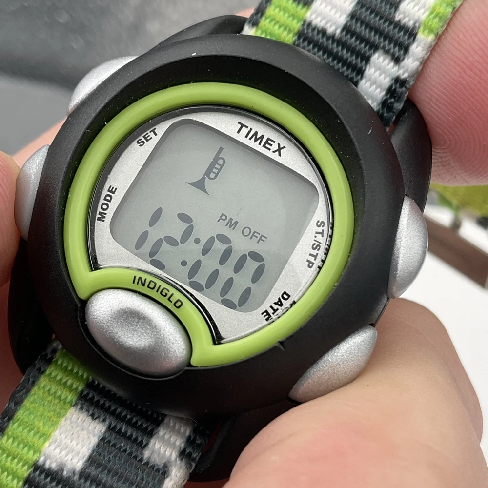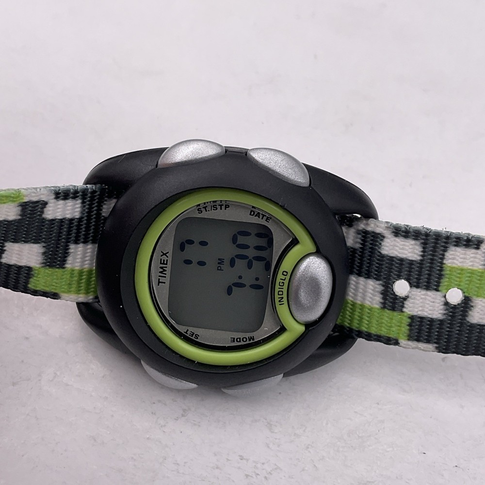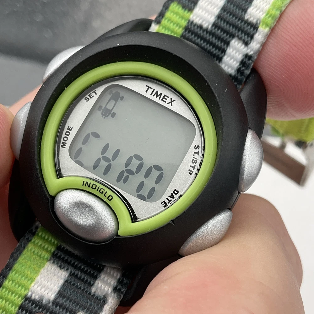 The Timex Time Machines Children's Digital Watch Indiglo is a stylish and durable wristwatch designed for unisex kids. With a canvas strap in white or green, this watch features a buckle closure and a 33mm case size. The silver or black case colour, along with a grey or green dial, gives it a sporty and trendy look. Water-resistant up to 30m, this quartz movement watch is both practical and versatile for everyday wear. The standout feature is the Indiglo display, making it easy to read time in low light conditions. Perfect for young timekeepers, this Timex watch is both functional and fun. THE WATCH IS NEW WITHOUT TAG BOX AND PAPERS SEE PICTURES OF THE ACTUAL WATCH FOR SALE THANKS FOR LOOKING