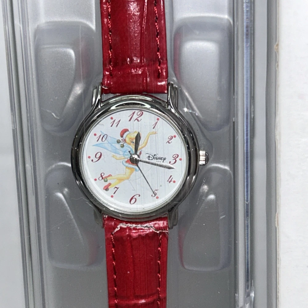 This is a Tinkerbell Walt Disney Time Works watch with a red band, still in its original factory case. The watch is made of imitation leather and was manufactured in Japan. It is a part of the Disney franchise and features the Tinkerbell character. The watch has not been modified and is in excellent condition. Perfect for collectors of contemporary Disneyana and timepieces.