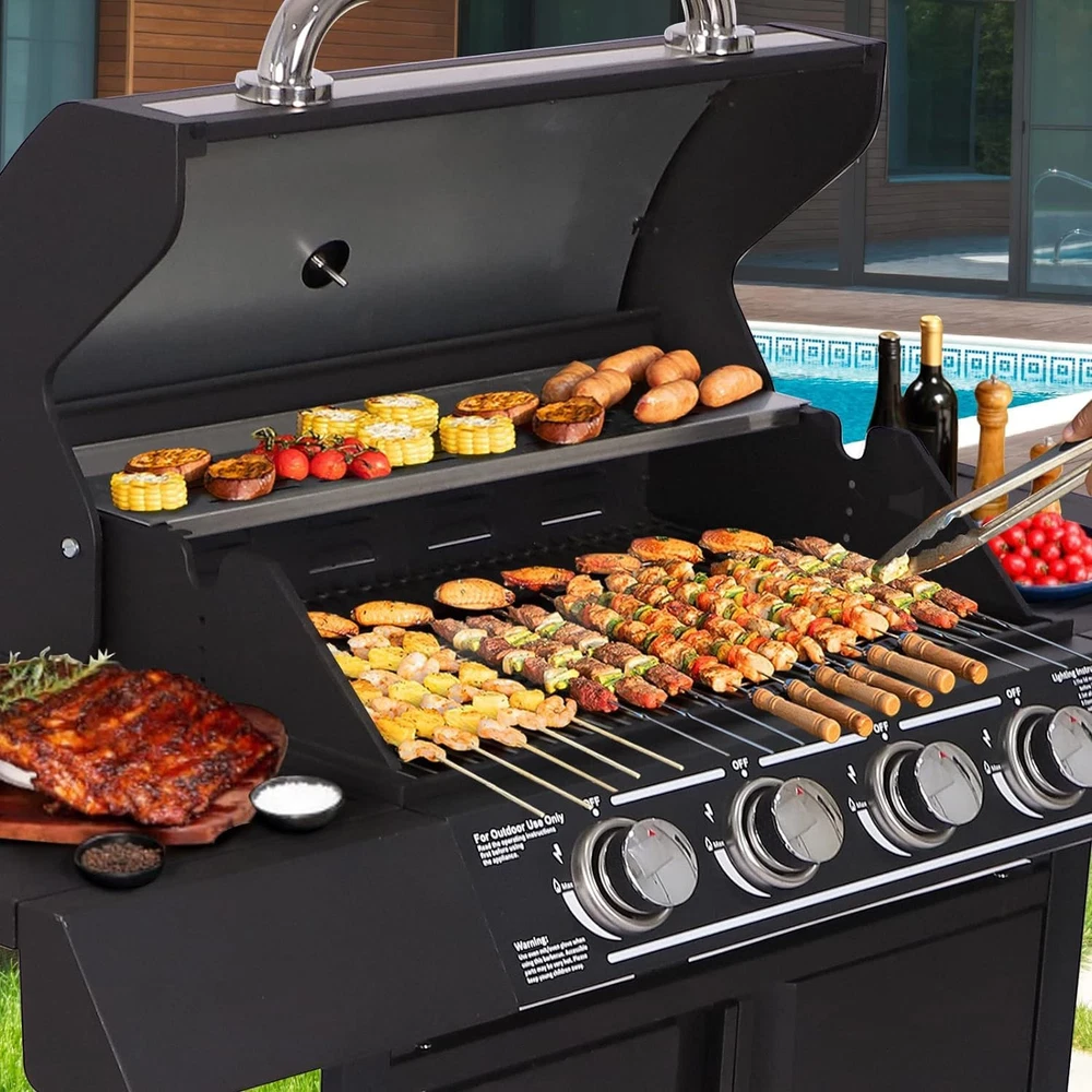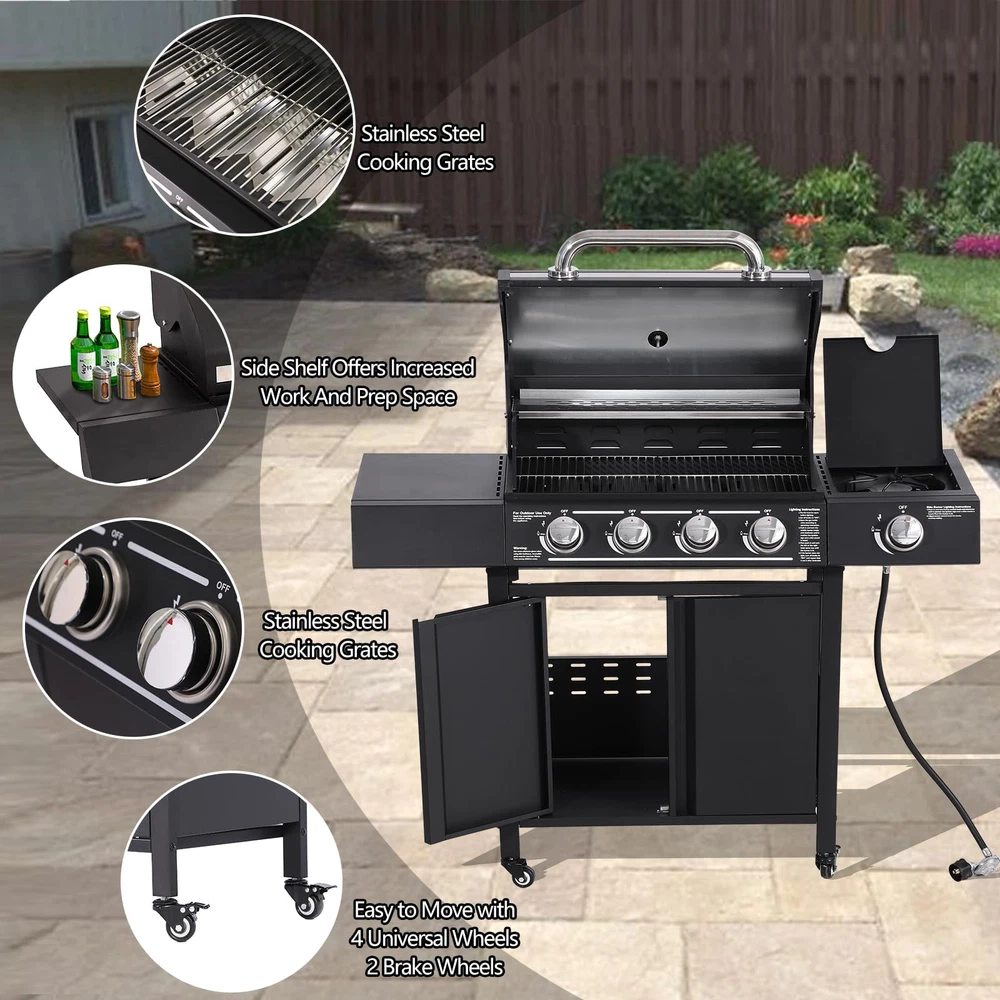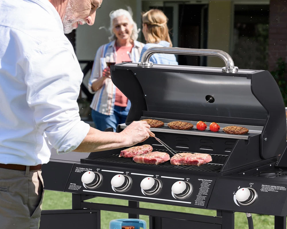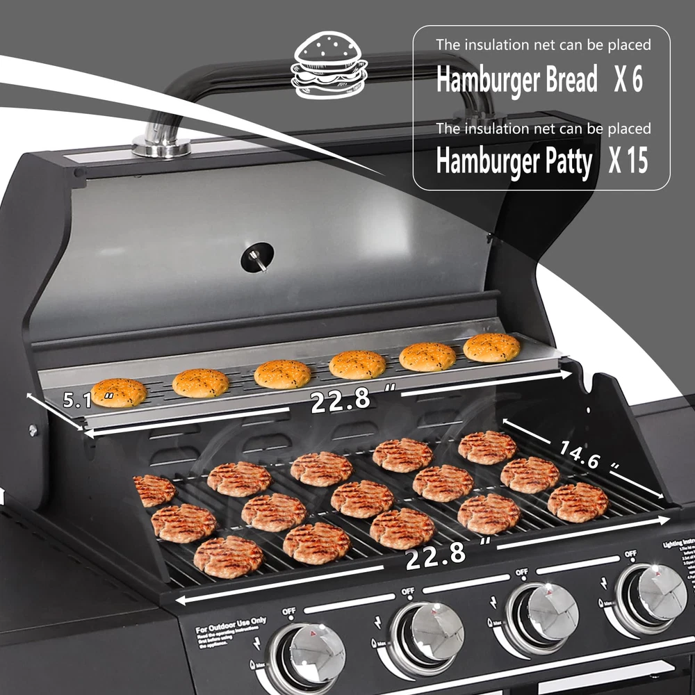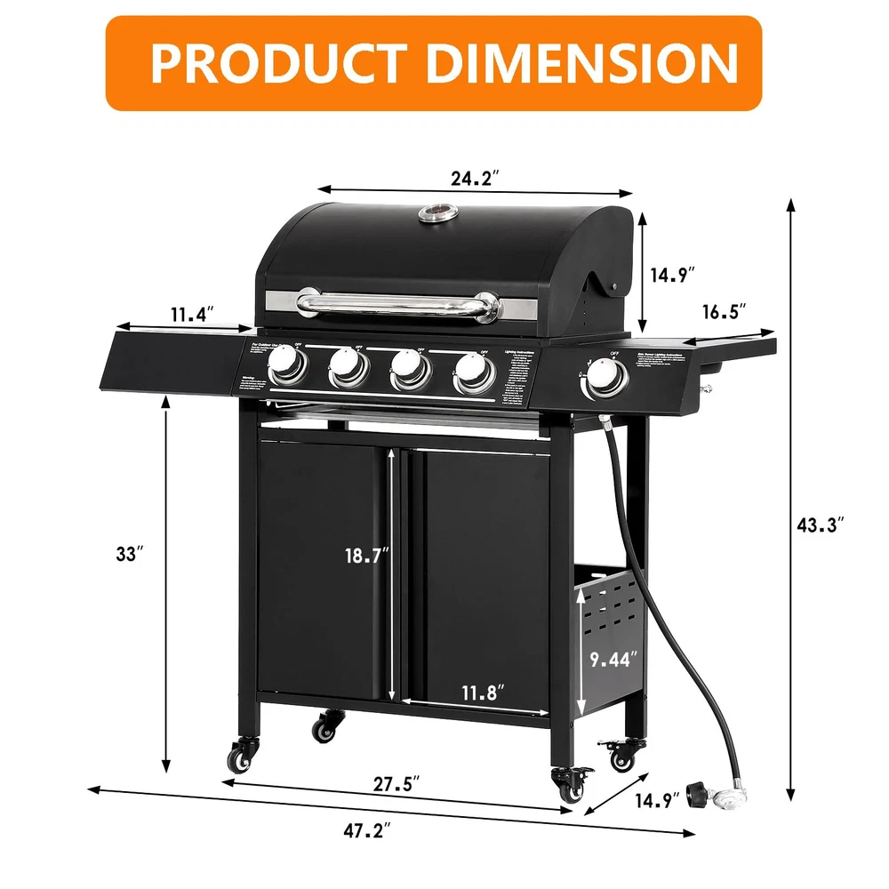 【Stainless Steel BBQ Grill】Cooking grates are made of durable, easy-to-clean stainless steel material which helps prevent rusting and cracking. The stainless steel flame tamers distribute even heat to every inch of cooking grates so that you can sear steak very well. 【50,000 BTUS Cooking Power】4 burners and side burner for ideal heat control with convenient ignite system, quick start up with the push & turn of a control knob. Gas grill provide a total 50,000 BTU of cooking power including 40,000BTU main cooking space and 10,000 BUT side burner. 【Spacious Cooking Area】474 sq.in. cooking area is very suitable for family use. Among them, the stainless steel grilling area is 360 sq. inch and the warming area is 114 sq inch, which is suitable for family/friends gatherings on weekends. 【Additional Prep Space】One side table is durable and offer more work and preparation space for seasonings and grilling tools to keep them within arm's reach. At the same time, the kettle can be placed on the side burner, to ensure that there is always hot water available to drink. 【Dimension & Warranty】Outdoor grill dimensions -14.9"D x 47"W x 42.5"H | Primary cooking area - 24.2"L x 14.9"W | Warming rack area -24.2"L x 4.7"W | The height of the cooking space(from grill to top of closed lid) - 14.9".