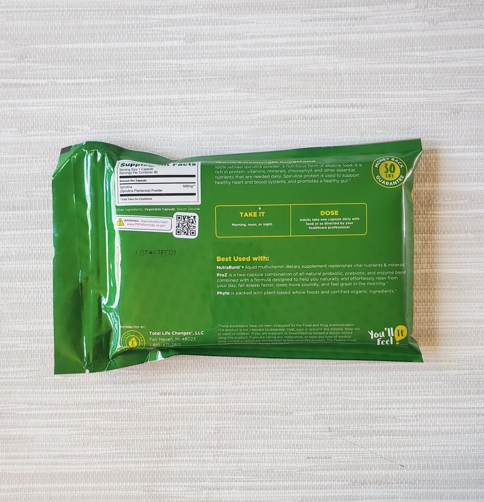 Techui Superfood supplement contains 100% Spirulina protein in a convenient capsule form. With 90 capsules per pack, this product by Total Life Changes is designed to support healthy immune function, cardiovascular health, weight management, and more. Spirulina is known for its high nutritional value and potential health benefits, making it a popular choice for those looking to enhance their overall well-being.