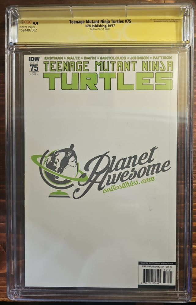 Item Details Title: Teenage Mutant Ninja Turtles #75 Publisher: IDW Publishing Year: October 2017 Variant: Planet Awesome Collectibles Exclusive Cover Artist: Kevin Eastman & Ben Bishop Grade: CGC 9.9 (White Pages) Certification #: 1584487002 Signatures & Sketch: • Kevin Eastman – TMNT Co-Creator • Includes hand-drawn Turtle Head Sketch (red ink) CGC Label: Signature Series (Yellow Label)