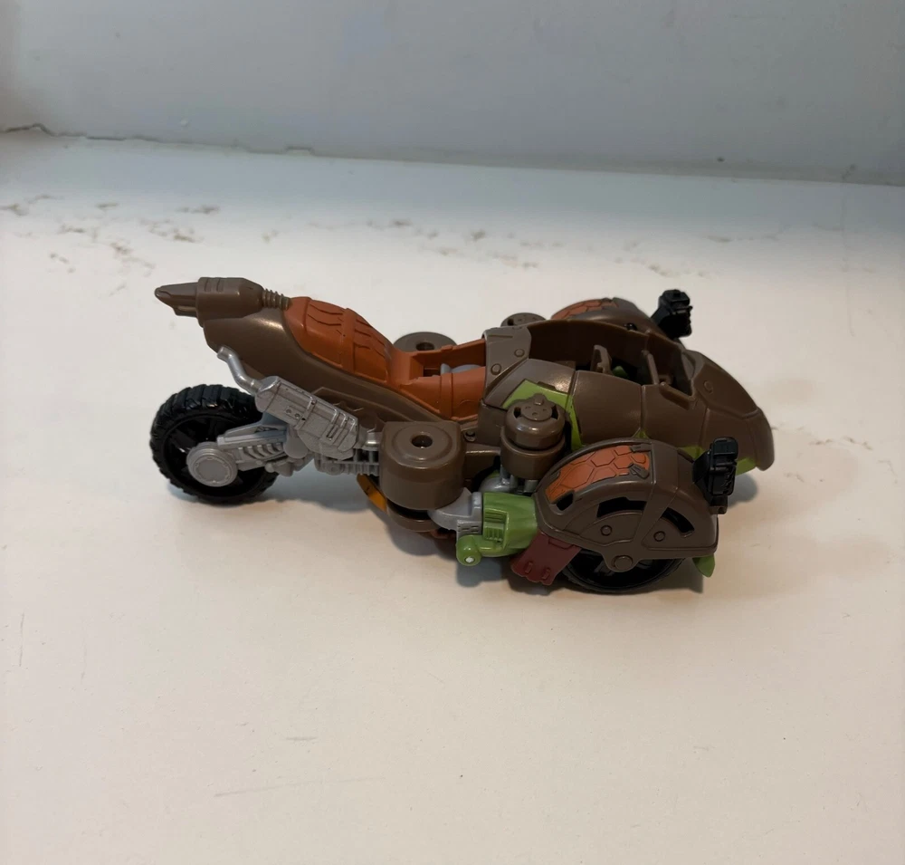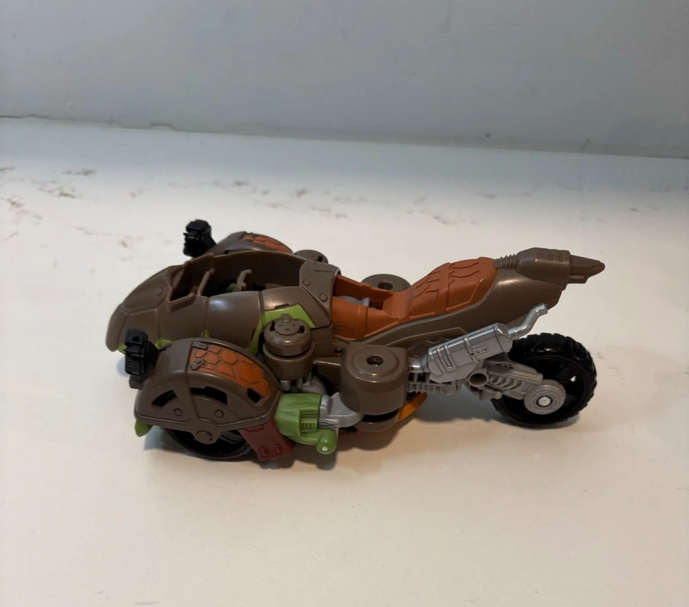 Has scratches, mostly on the shell of his belly. Good condition over. Transforms with no issues. This action figure is a must-have for any Teenage Mutant Ninja Turtles fan. The TMNT Teenage Mutant Ninja Turtles Mutations Twist N Mutate Leonardo AT3 Vehicle is an original, licensed reproduction from Playmates Toys. This 6-inch plastic figure features Leonardo, one of the four famous ninja turtles, in a transforming motorbike vehicle. The figure is based on the popular TV show and movie franchise, and is perfect for collectors and kids alike. With its multicolor design and intricate details, this action figure is sure to provide hours of imaginative play. Don't miss out on the chance to add this unique piece to your collection!