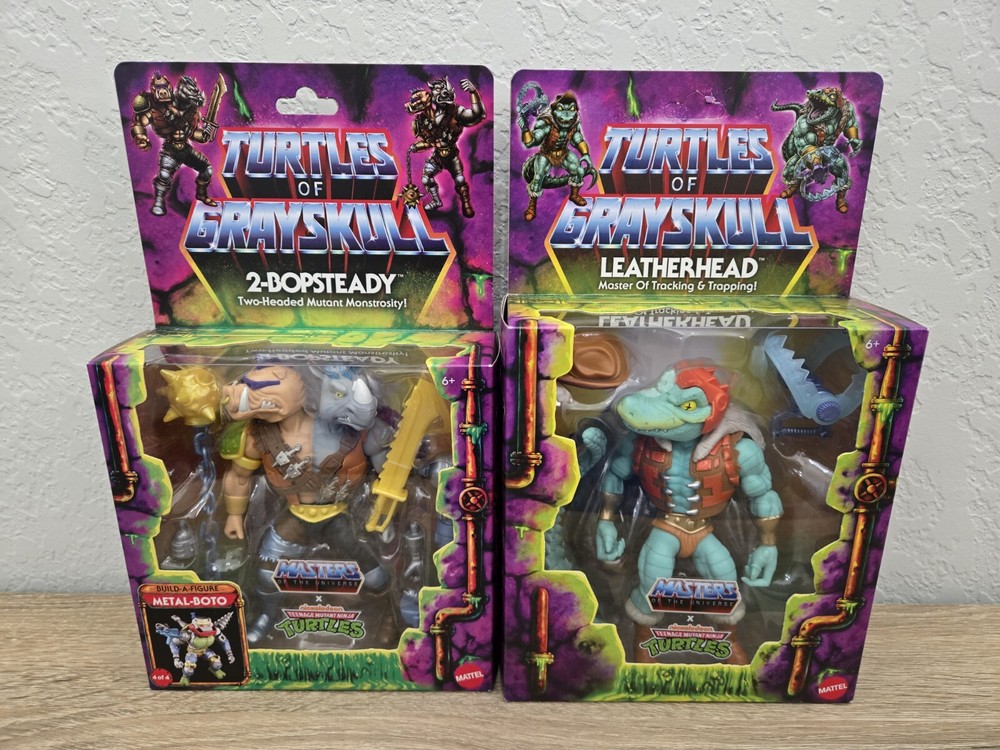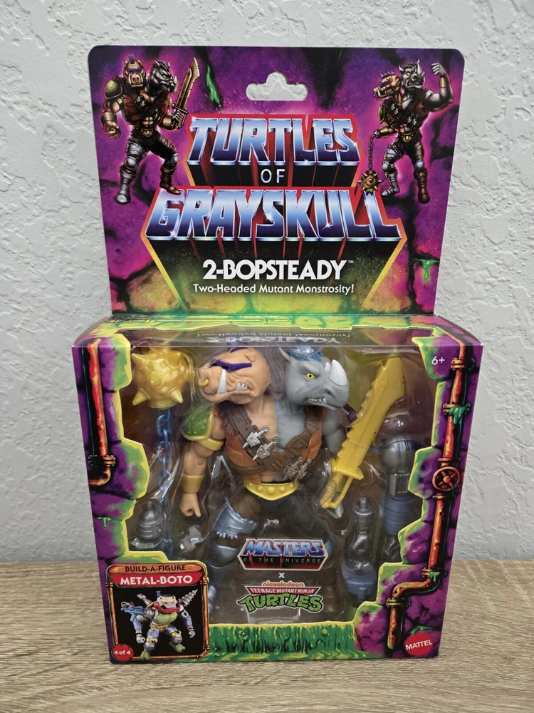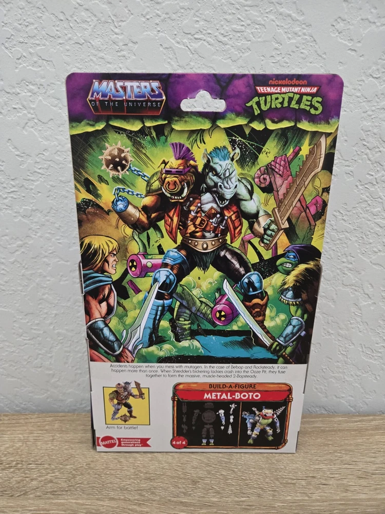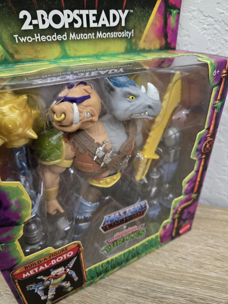 *Free shipping with USPS Ground Advantage. Ships ASAP from a smoke-free home. Packaged with bubblewrap and boxed for protection.* Are you a fan of TMNT or MOTU? This product is a TMNT Turtles of Grayskull action figure set featuring 2-Bobsteady and Leatherhead characters from the Teenage Mutant Ninja Turtles franchise. Manufactured by Mattel in 2024, the figures are made of plastic and stand 6 inches tall. They come with parts to complete your Metal-Boto figure (parts 4 of 4 only), weapons, and accessories. The set is part of the Turtles of Grayskull series and is an exclusive from Target and Walmart, boxed item with adjustable features.